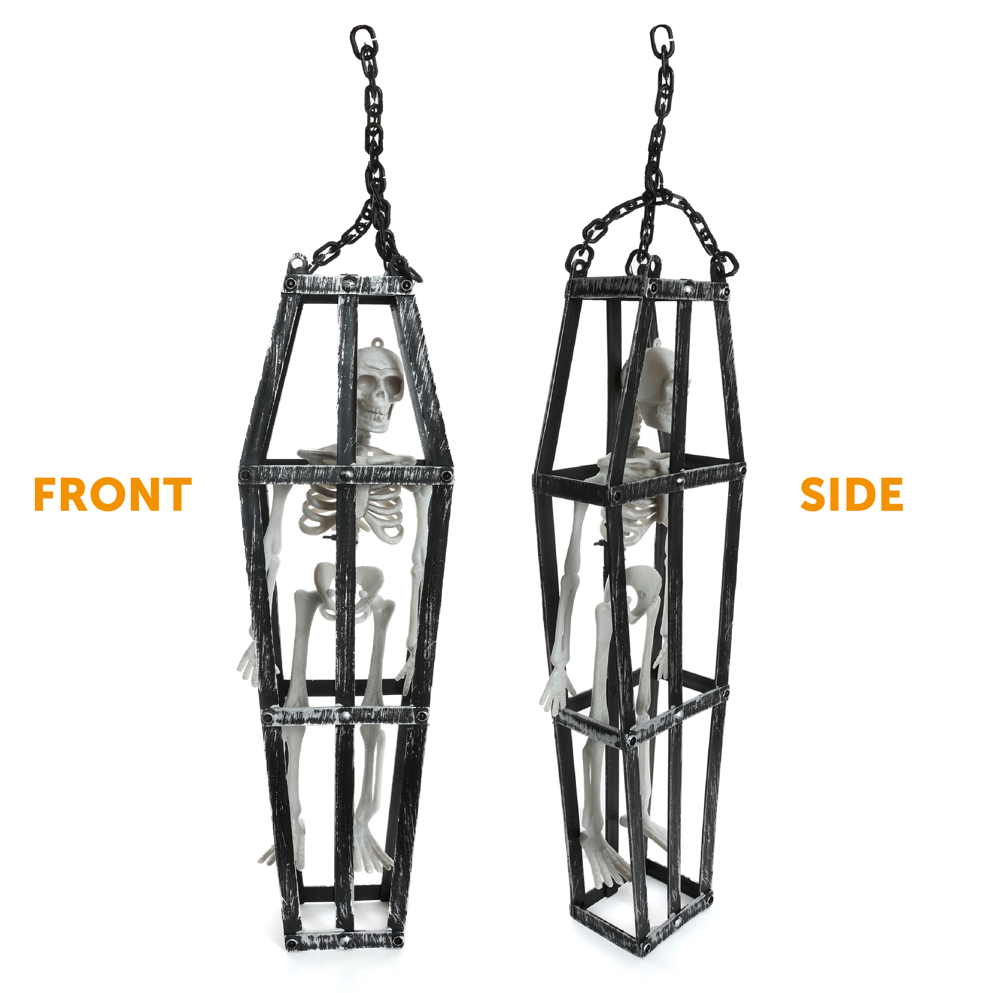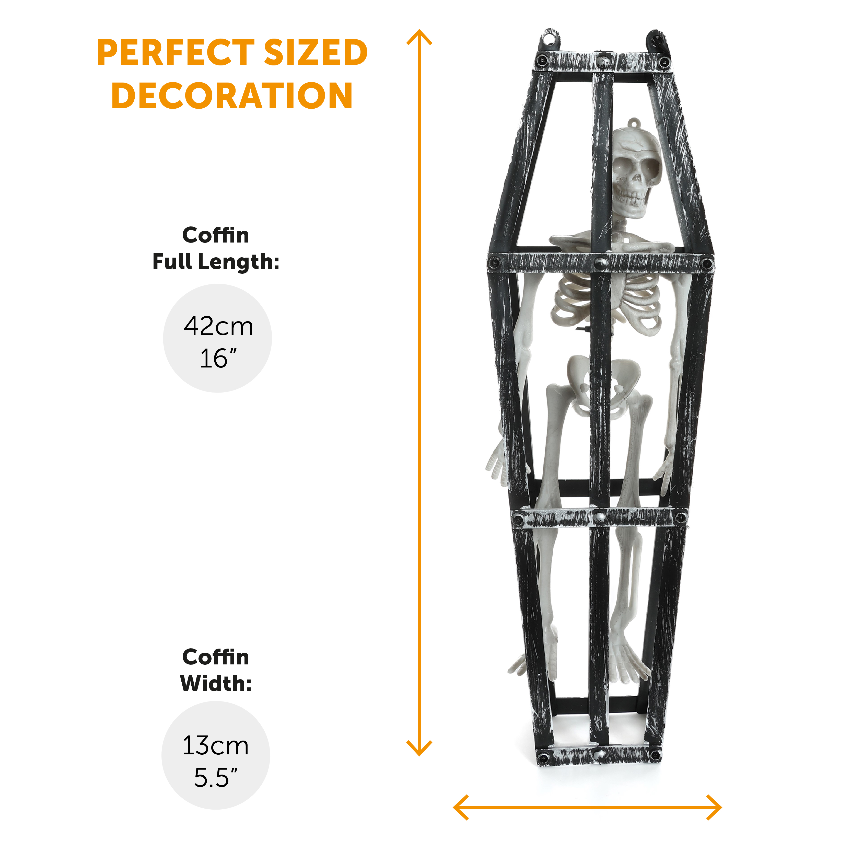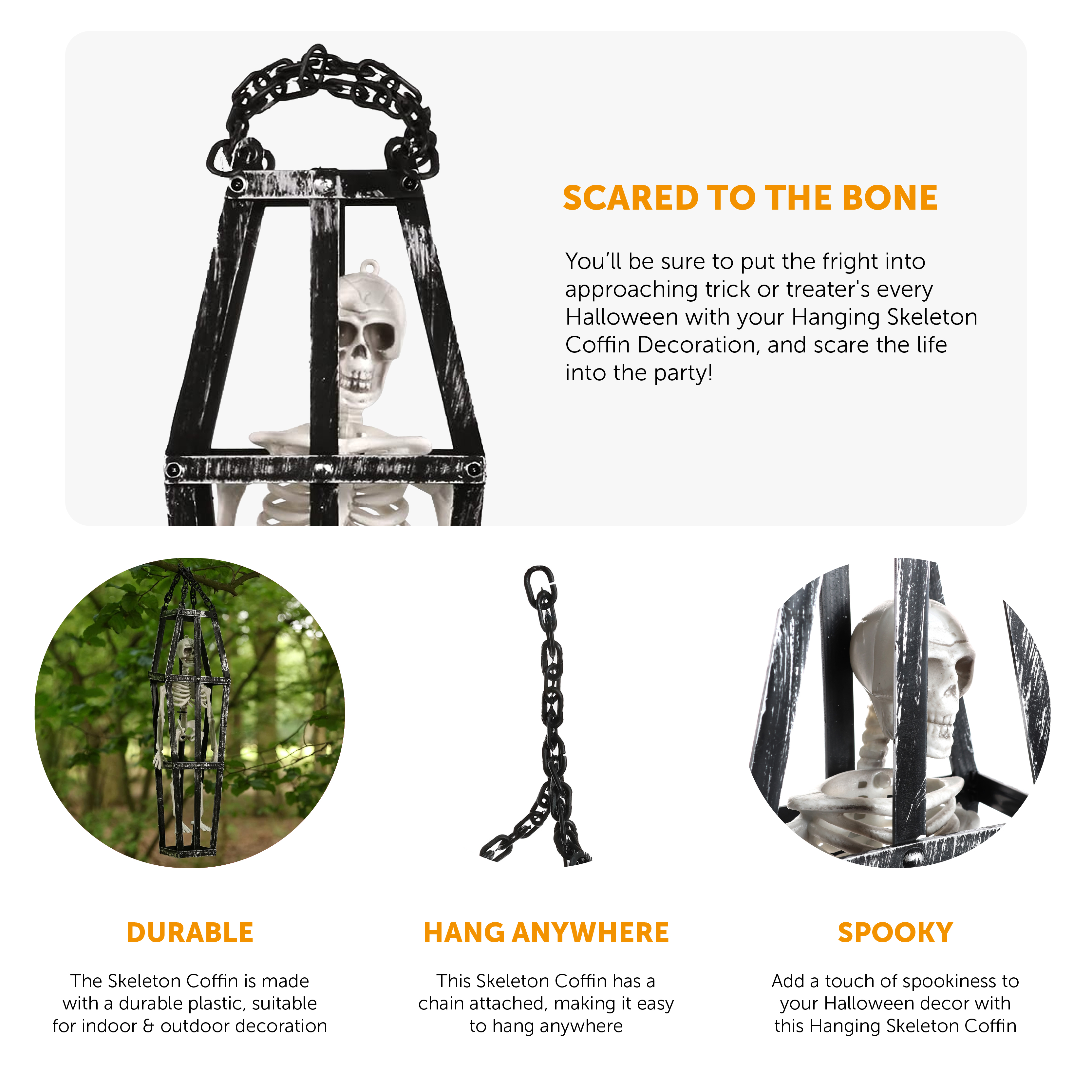 DECORATION DETAILS: Your Hanging Skeleton Coffin Decoration is a Black Coffin Shaped Cage with a Chain attached for easy hanging, and a Skeleton trapped inside, to create a spooky Halloween display for your celebrations!