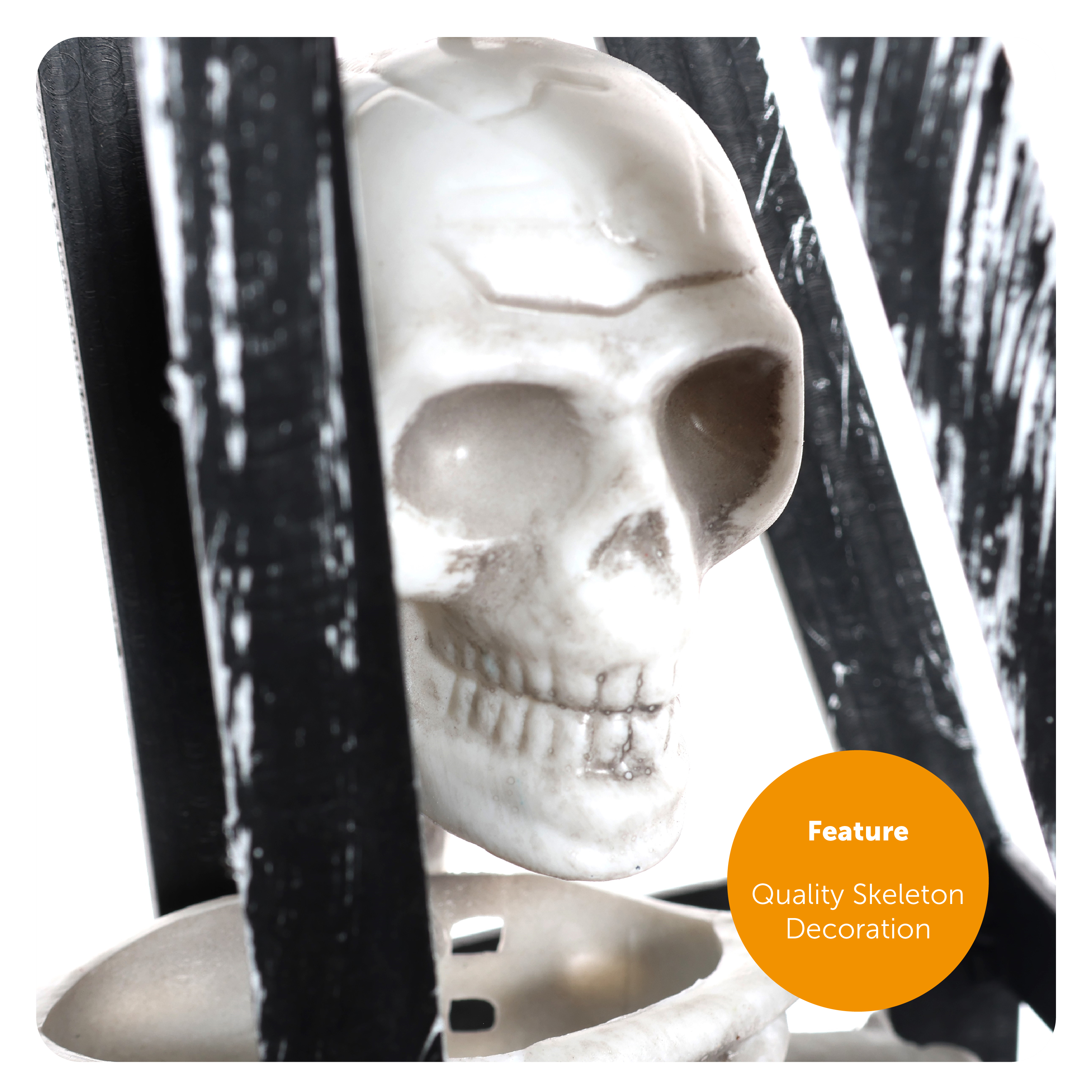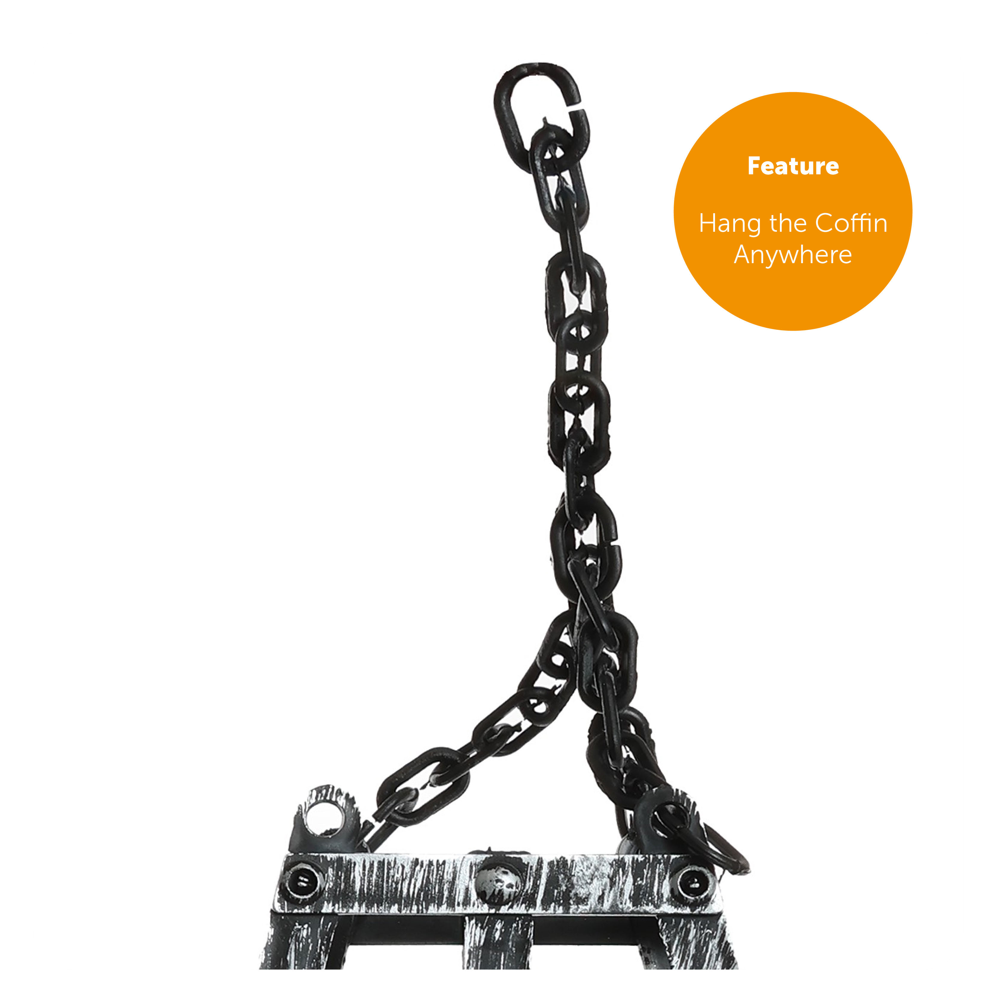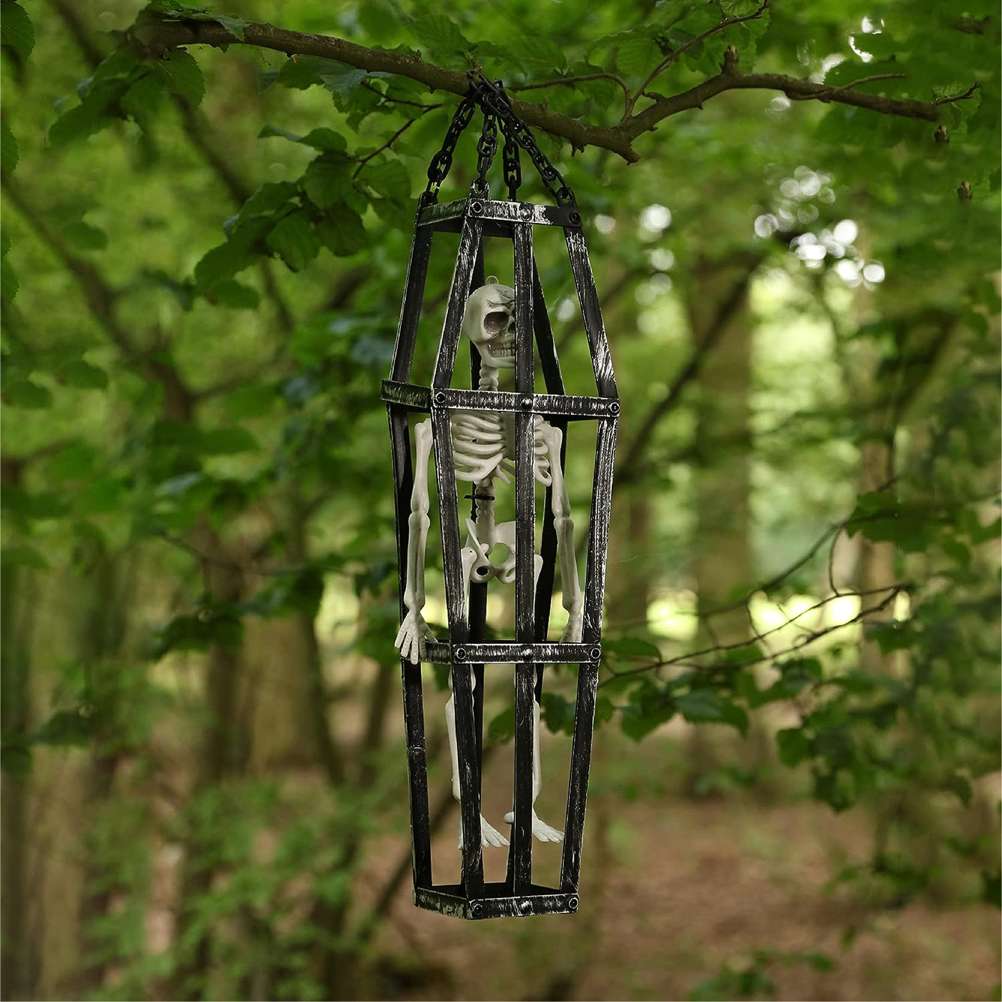 DECORATION DETAILS: Your Hanging Skeleton Coffin Decoration is a Black Coffin Shaped Cage with a Chain attached for easy hanging, and a Skeleton trapped inside, to create a spooky Halloween display for your celebrations!