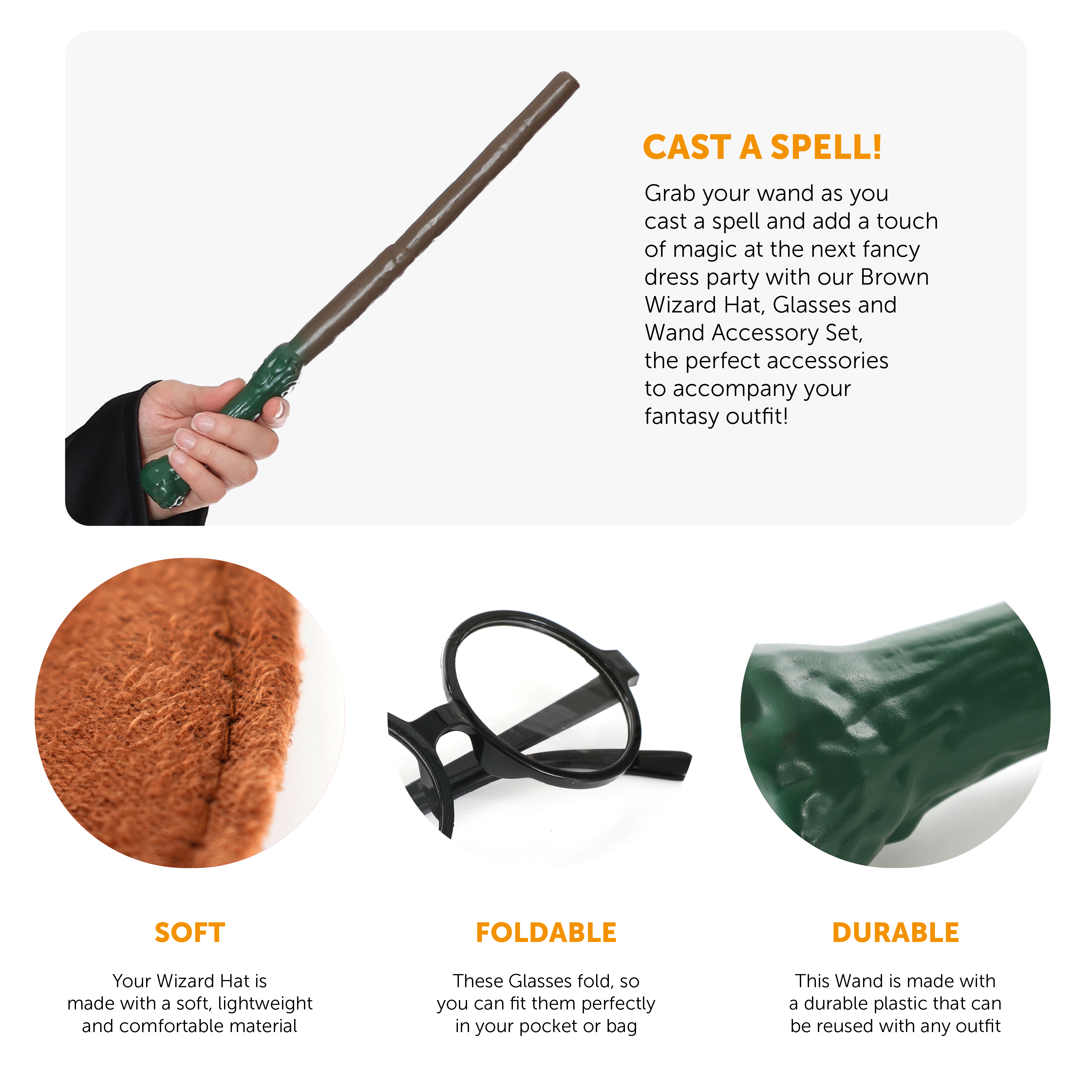 PERFECT FOR HALLOWEEN FANCY DRESS: Whether you're brewing a potion for Halloween or want that magical look at any other fancy dress event, there is no better accessory set than our Brown Wizard Hat, Glasses and Wand!