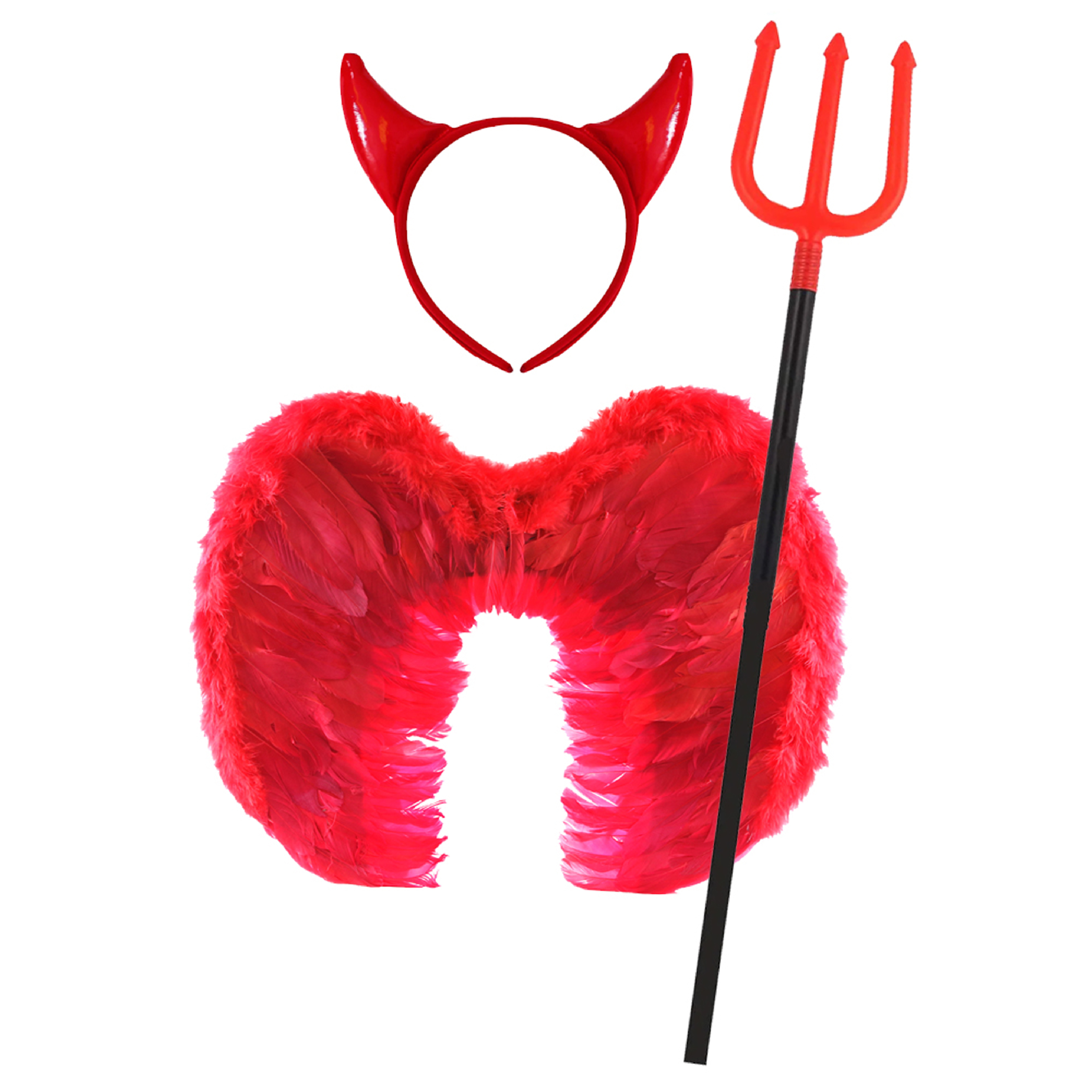LADIES DEVIL ACCESSORY SET: Have some Devilish Fun this Halloween with your Ladies Devil Accessory Set, with a Red Devil Horn Headband, Red Feather Wings and a Devil Fork Trident, raise the parties’ spirits high for a great night filled with memories!