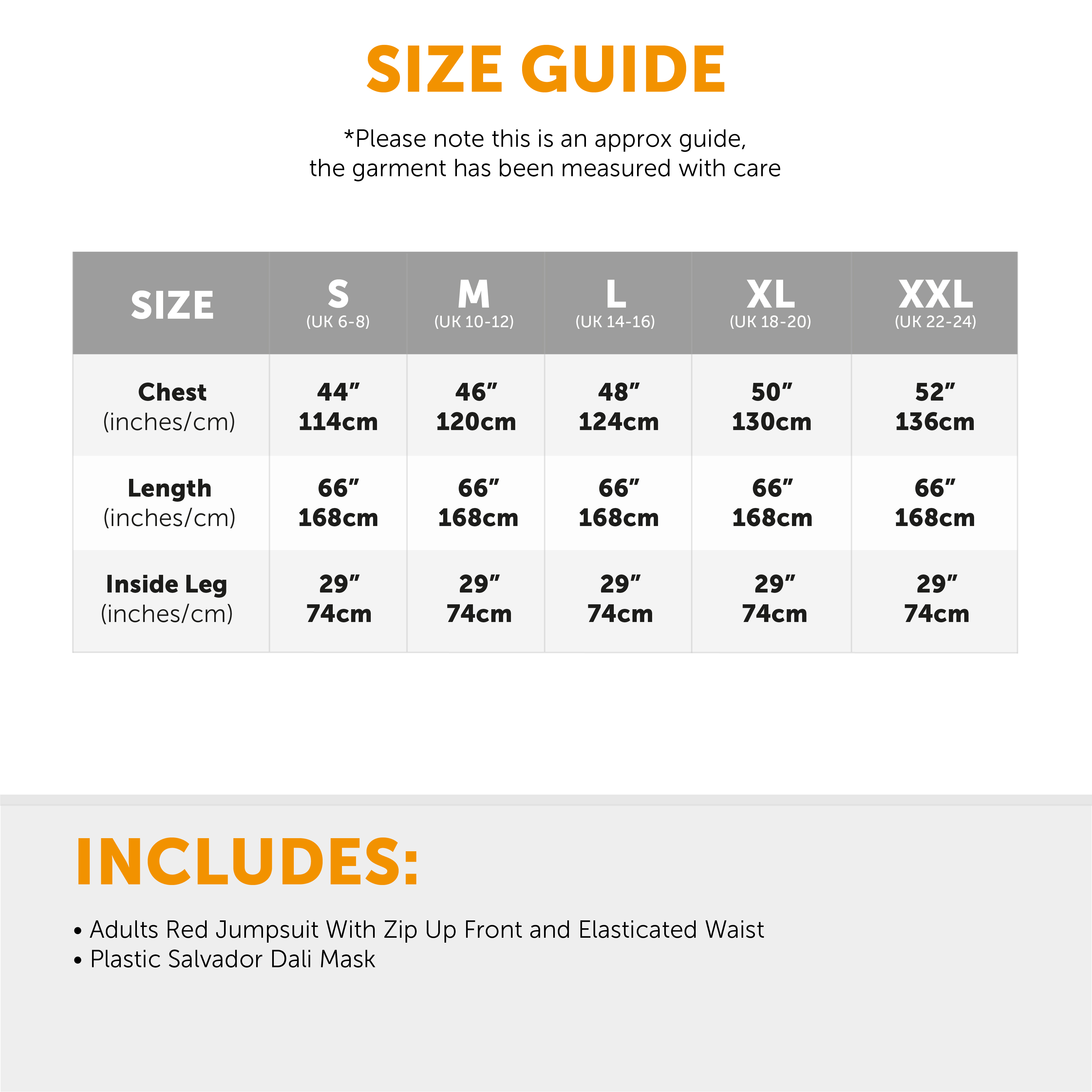 AVAILABLE IN MULTIPLE SIZES: Your Adults Money Heist Costumes are available in multiple sizes, from Small to XX-Large: Small: UK 6-8: Chest: 44"/114cm, Length: 66"/168cm, Inside Leg: 29"/74cm | Medium: UK 10-12: Chest: 46"/120cm, Length: 66"/168cm, Inside Leg: 29"/74cm | Large: UK 14-16: Chest: 48"/124cm, Length: 66"/168cm, Inside Leg: 29"/74cm | X-Large: UK 18-20: Chest: 50"/130cm, Length - 66"/168cm, Inside Leg: 29"/74cm | XX-Large: UK 22-24: Chest: 52"/136cm, Length: 66"/168cm, Inside Leg: 29"/74cm