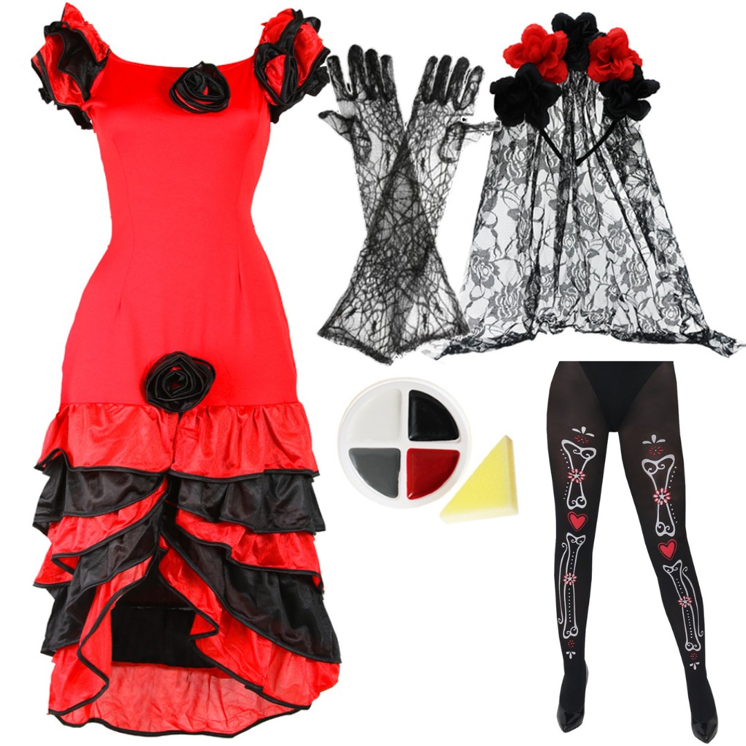 Ladies Day of The Dead Halloween Costume | 5 Pcs | Red Rumba Dress, Floral Veil, Spiderweb Gloves, Skeleton Tights & Face Paint