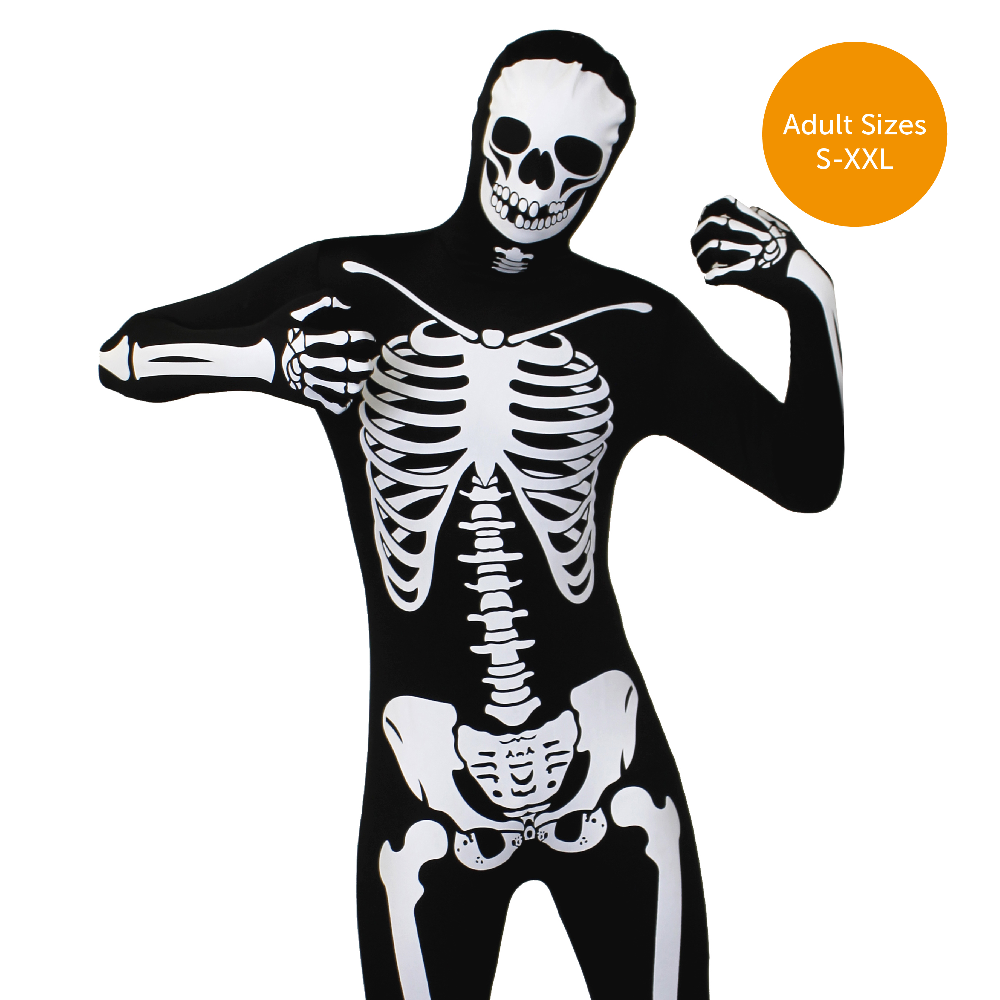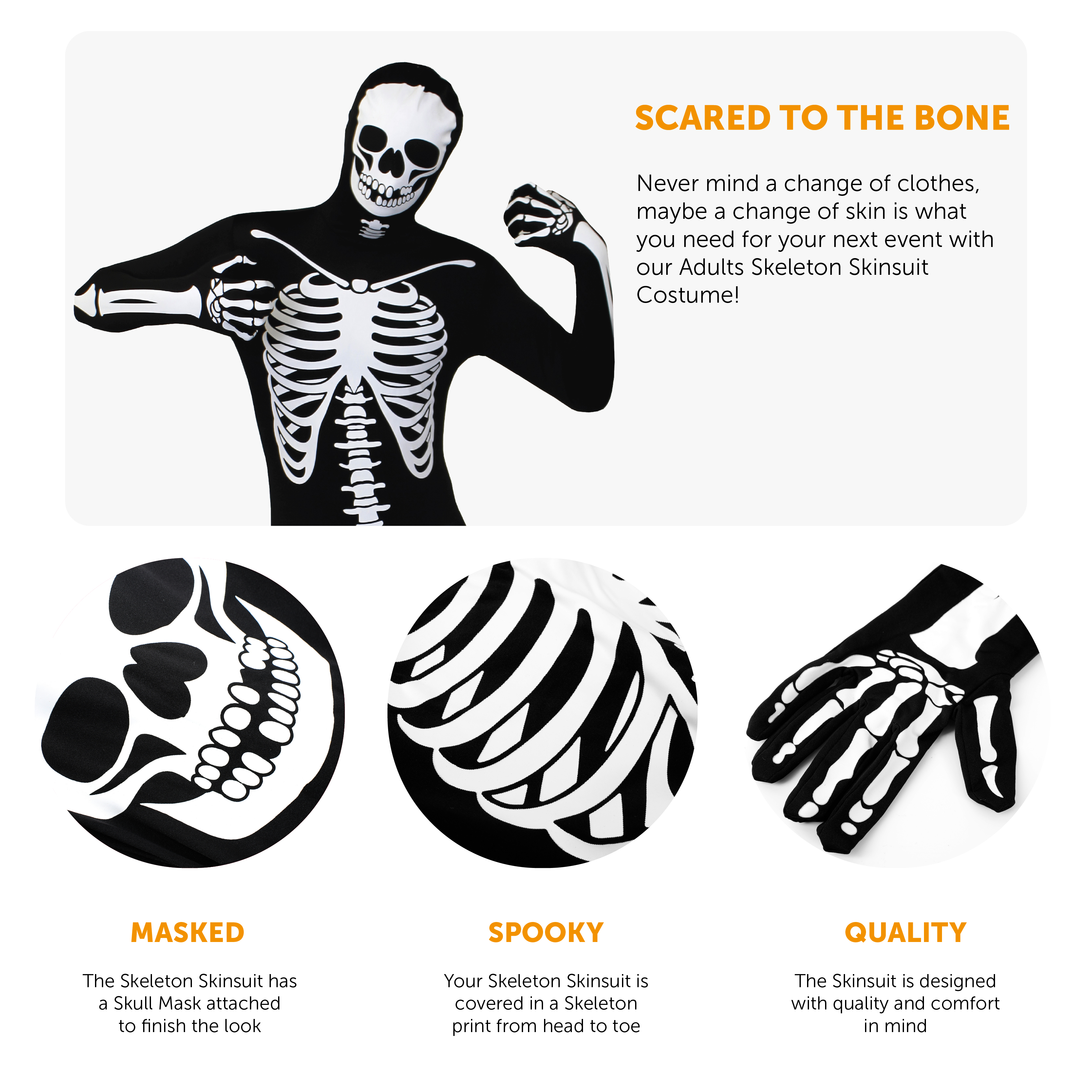 SKELETON SKINSUIT DETAILS: Your Adults Skeleton Skinsuit is a costume with a classic Skeleton design on the front, and a zipper on the back of the costume to allow for easy access to slip in and out comfortably!