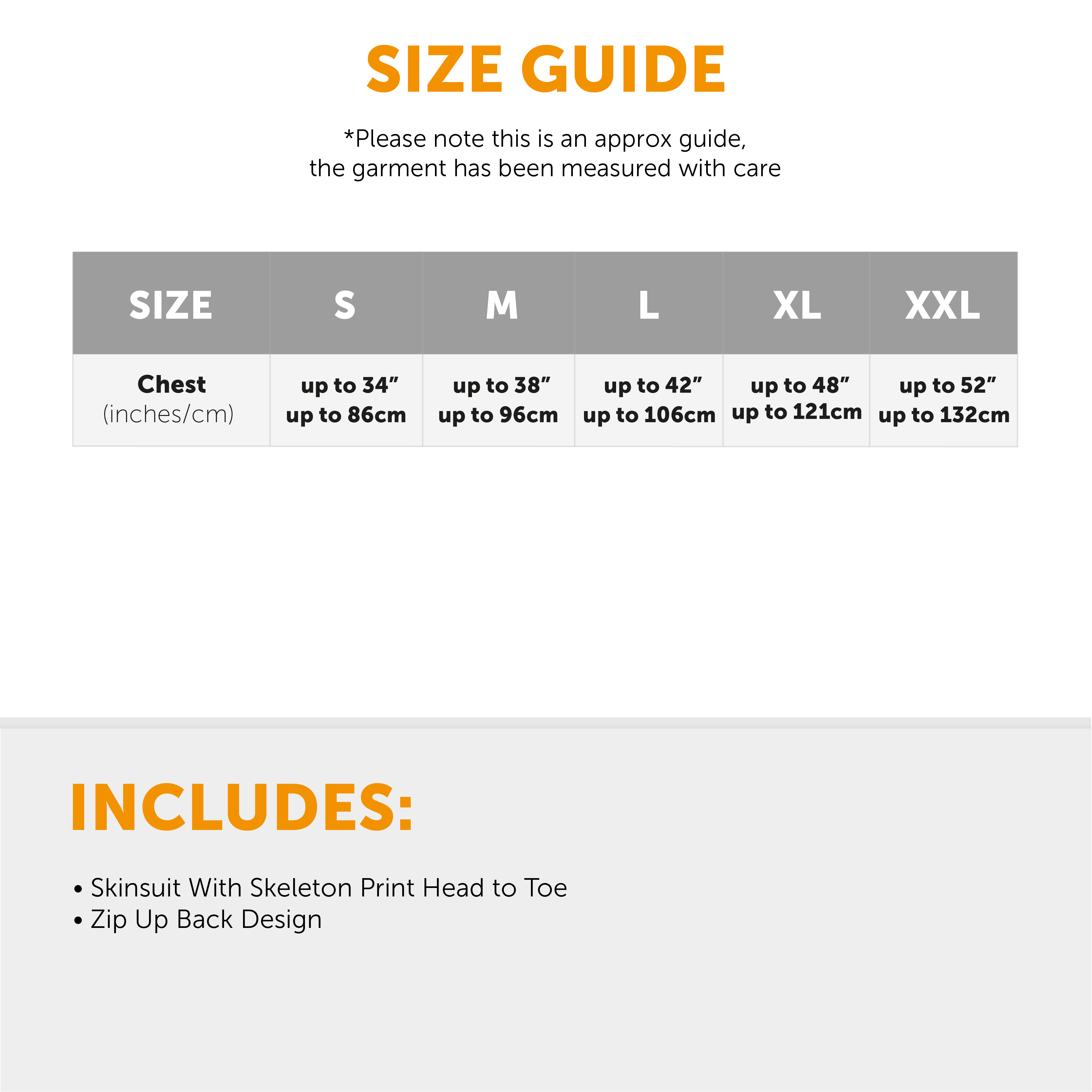 AVAILABLE IN MULTIPLE SIZES: Your Adults Skeleton Skinsuit costume is available in multiple sizes from Small to XX-Large: Small - Up To 34" Chest | Medium - Up To 38" Chest | Large - Up To 42" Chest | X-Large - Up To 48" Chest | XX-Large - Up To 52" Chest