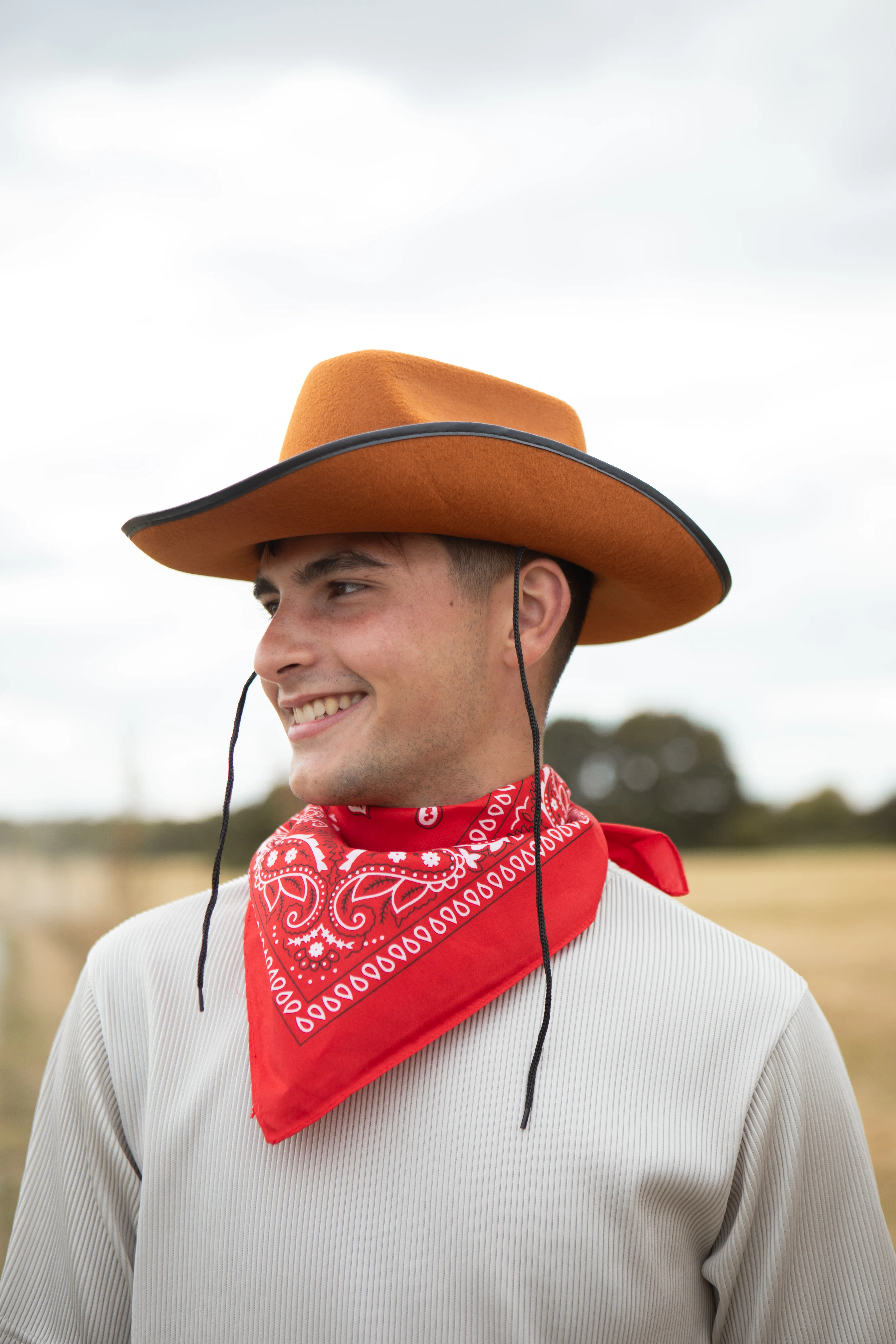 A Brown Star Studded Cowboy Hat, a Red Paisley Bandana, and a Silver Plastic Western Gun — the perfect trio for any gunslinging cowboy or cowgirl.
