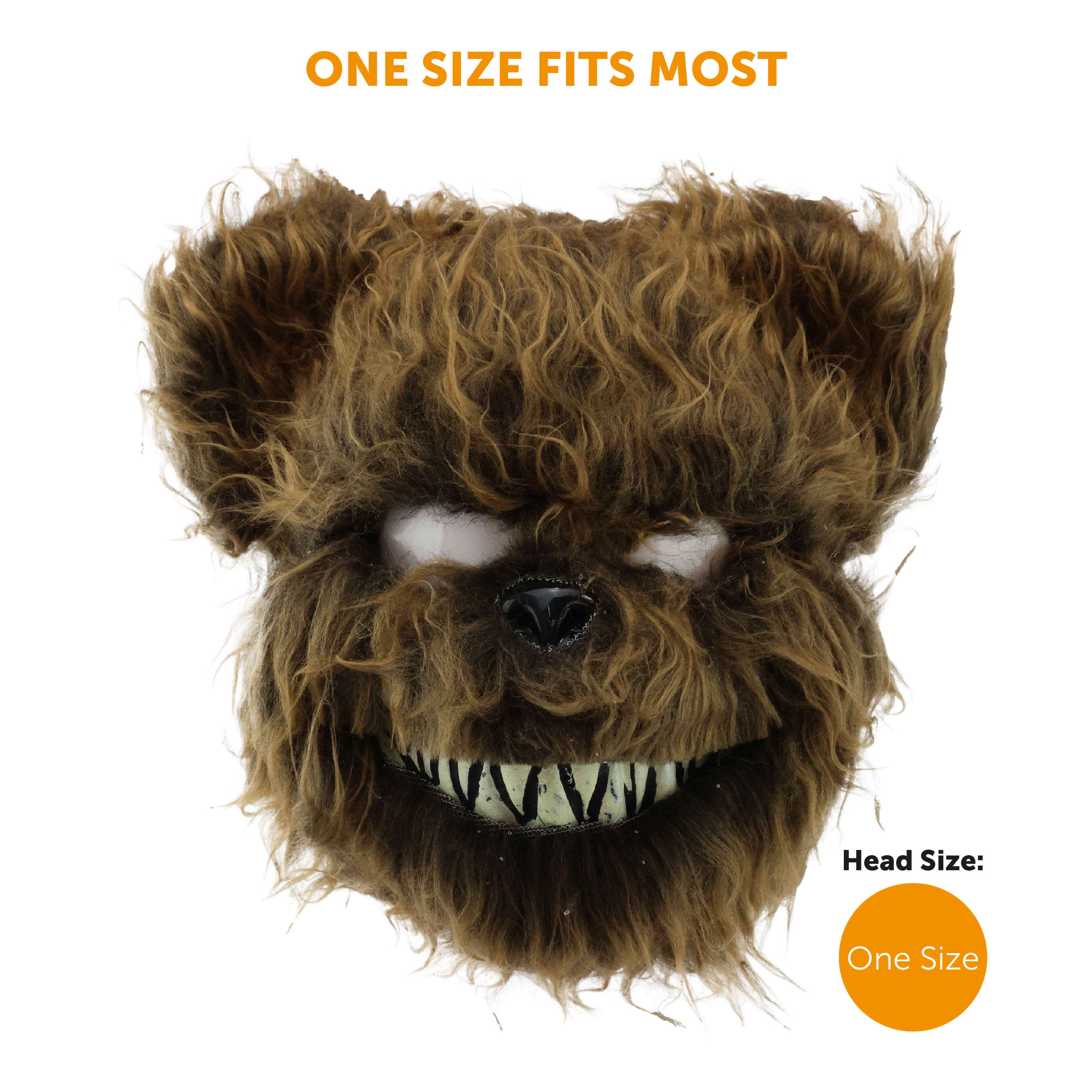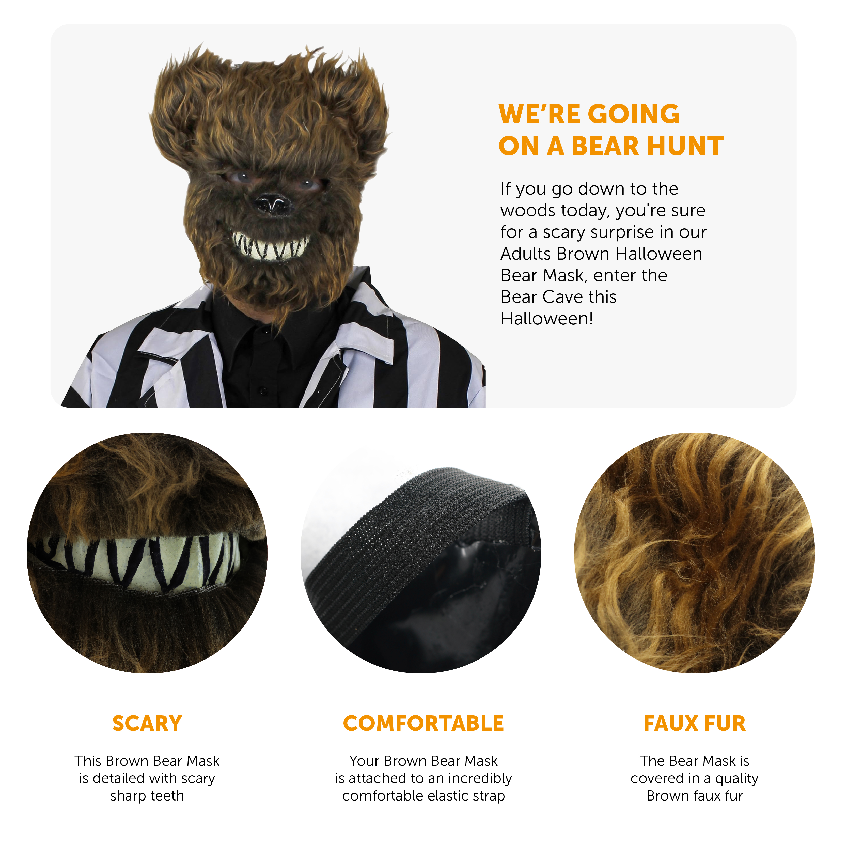 MASK DETAILS: This Halloween Bear Mask is covered in Brown Faux Fur, detailed with Sharp Teeth and attached to a comfortable elasticated strap!