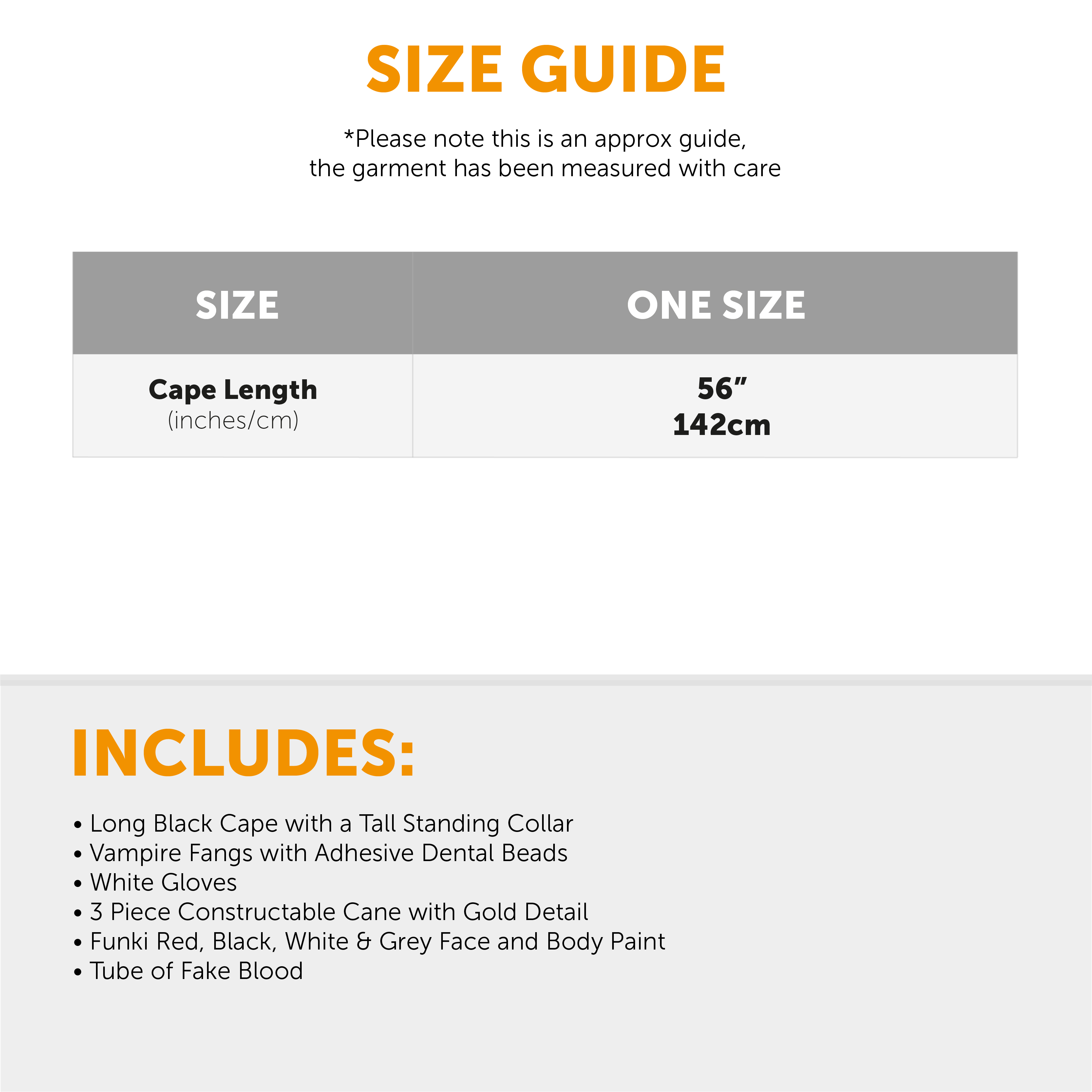 COSTUME INCLUDES: Your Adults Vampire Costume includes a Black Cape with a tall standing Collar, Vampire Fangs with Adhesive Dental Putty, a 3 Piece Cane with a Gold Detailed Top, White Gloves, and a palette of Face and Body Paint with White, Black, Grey and Red colours, and a Tube of Fake Blood!