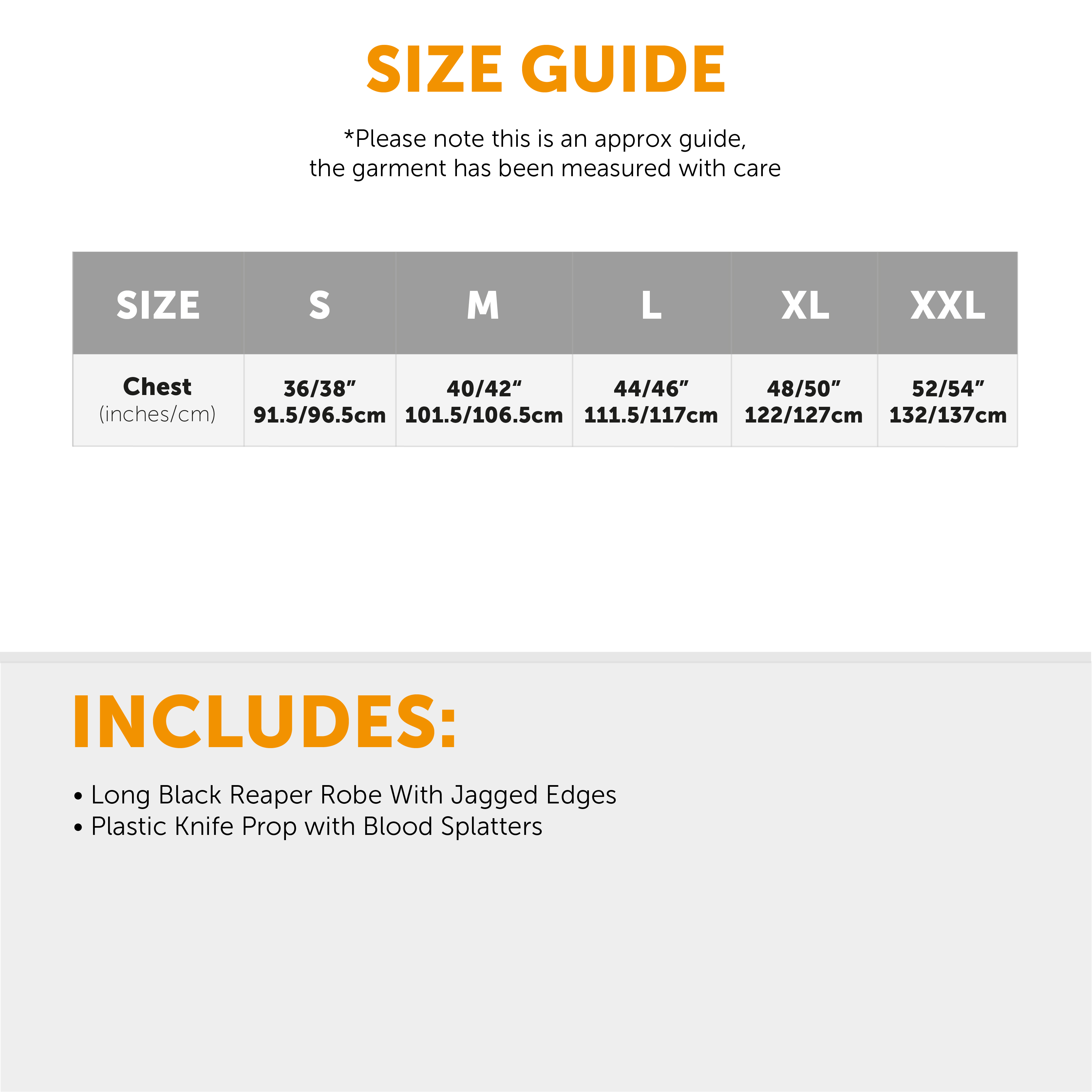 AVAILABLE IN MULTIPLE SIZES: Your Adults Reaper Robe Costume is available in multiple sizes from Small to XX-Large: Small - Chest: 36/38" (91.5/96.5cm) | Medium - Chest: 40/42" (101.5/106.5cm) | Large - Chest: 44/46" (111.5/117cm) | X-Large - Chest: 48/50" (122/127cm) | XX-Large - Chest: 52/54" (132/137cm)