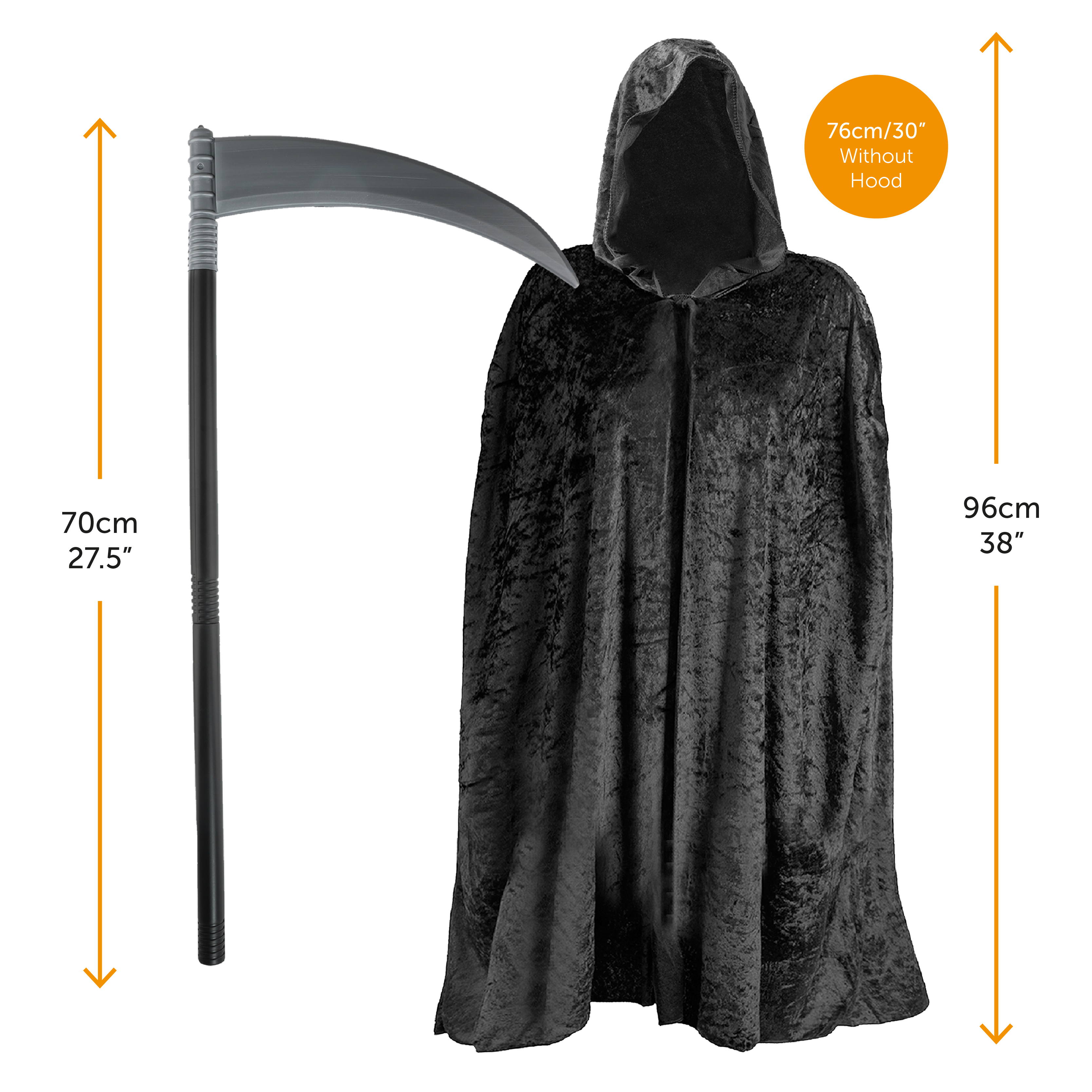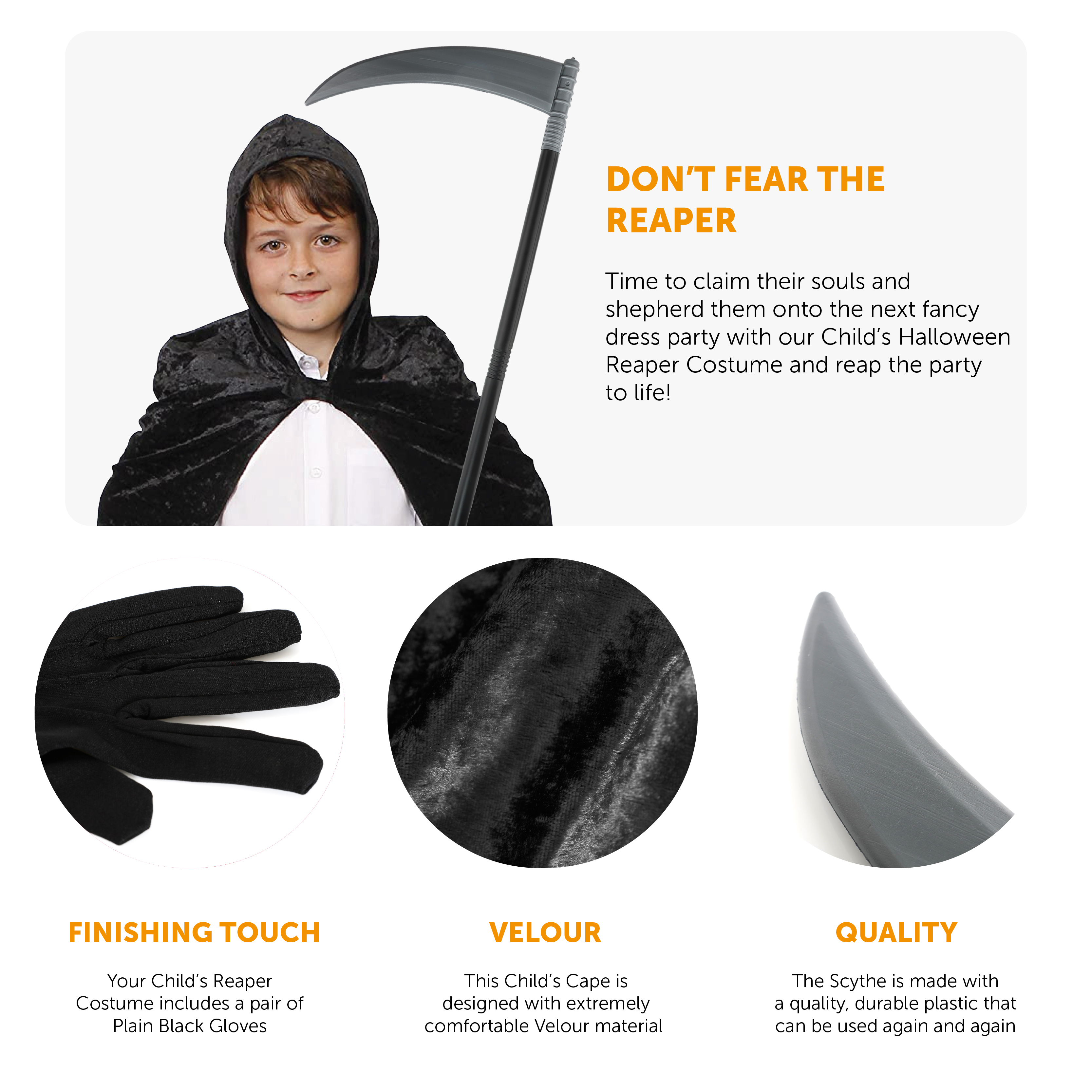 REAPER COSTUME DETAILS: Your Child Reaper Costume includes a long Black Velour Cape with an attached hood and easy hook and loop fastening, a pair of Black Gloves, and a Plastic Scythe with a screwable handle made up of 3 pieces!