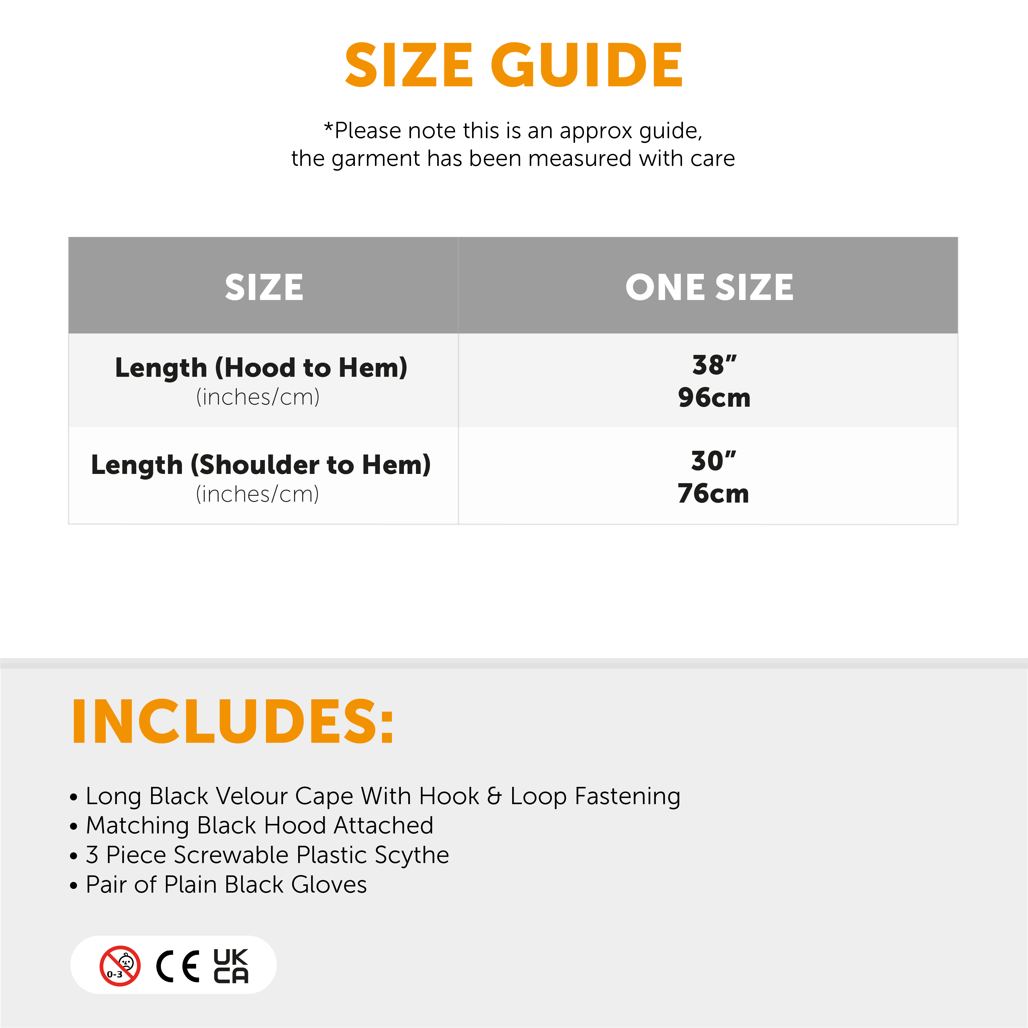 AVAILABLE IN ONE SIZE: Your Child's Reaper Costume is available in one size, with the hood up the Black Velour Cape measures a full length of 38" (96cm) and without the hood measures a length of 30" (76cm)