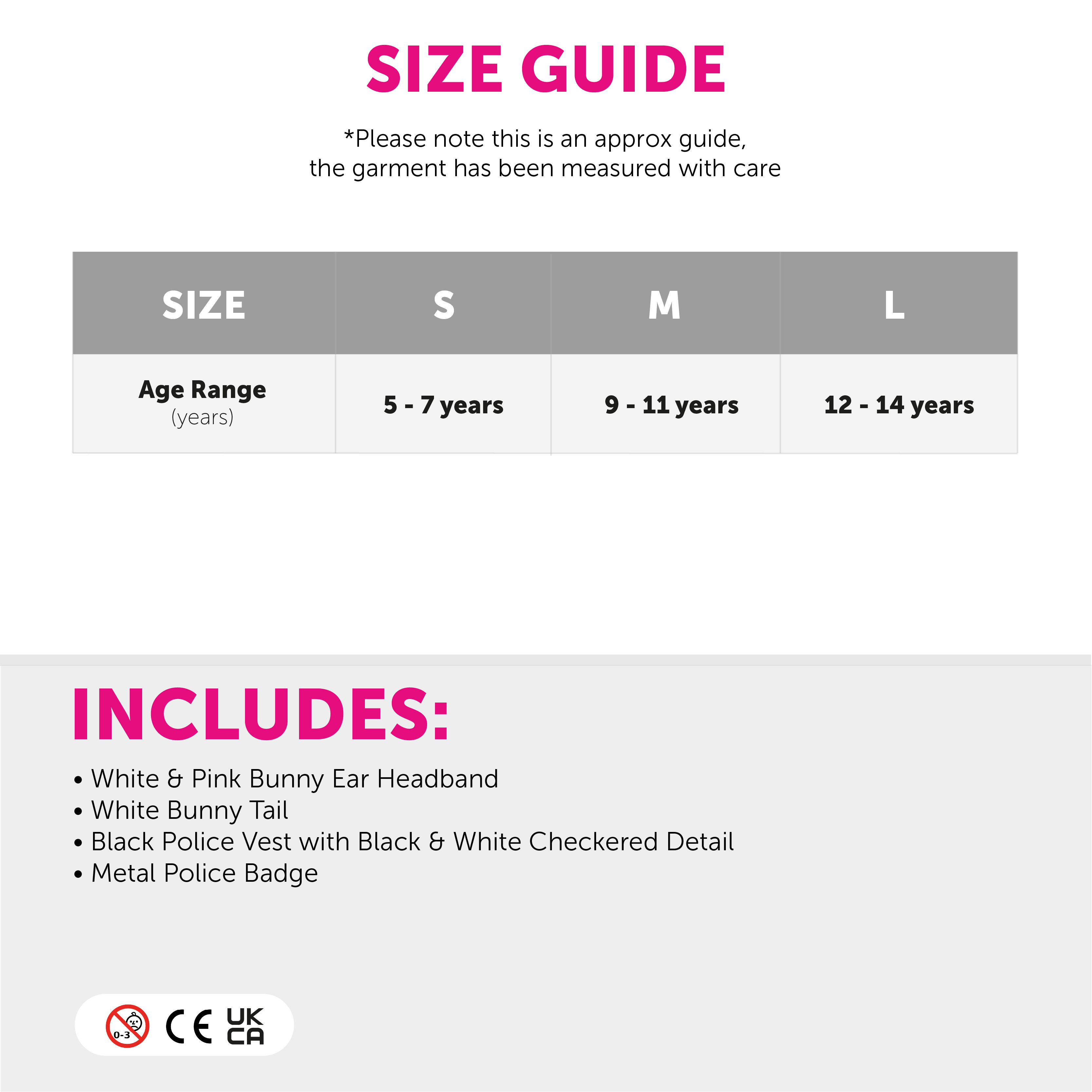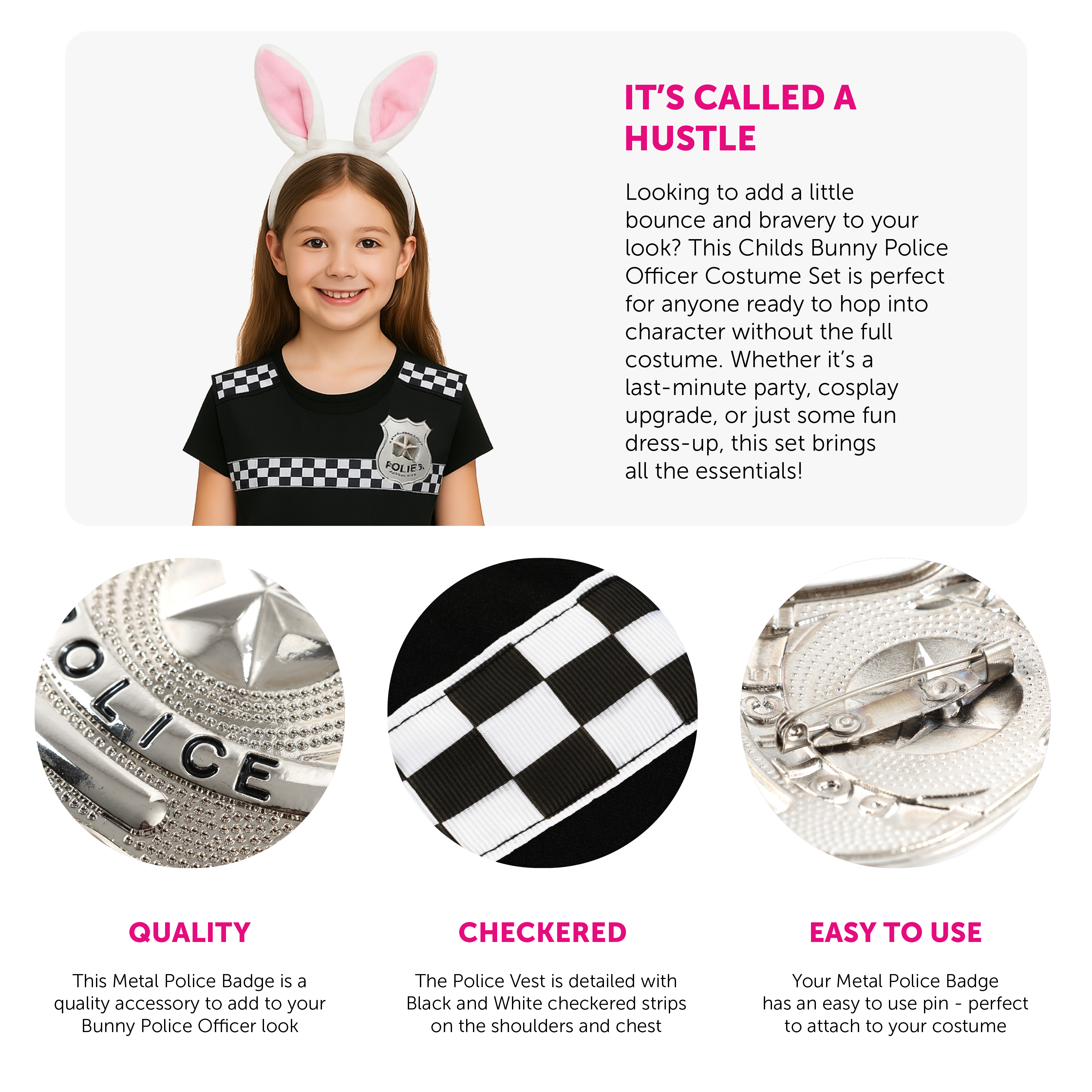 SET INCLUDES: This Childs Bunny Police Officer Accessory Set includes a White & Pink Bunny Ear Headband with a White Bunny Tail, a Black Police Vest with Checkered Black & White details, and a metal pin badge with a large star and 'Special Police' on the front,, the perfect way to finish off your outfit!