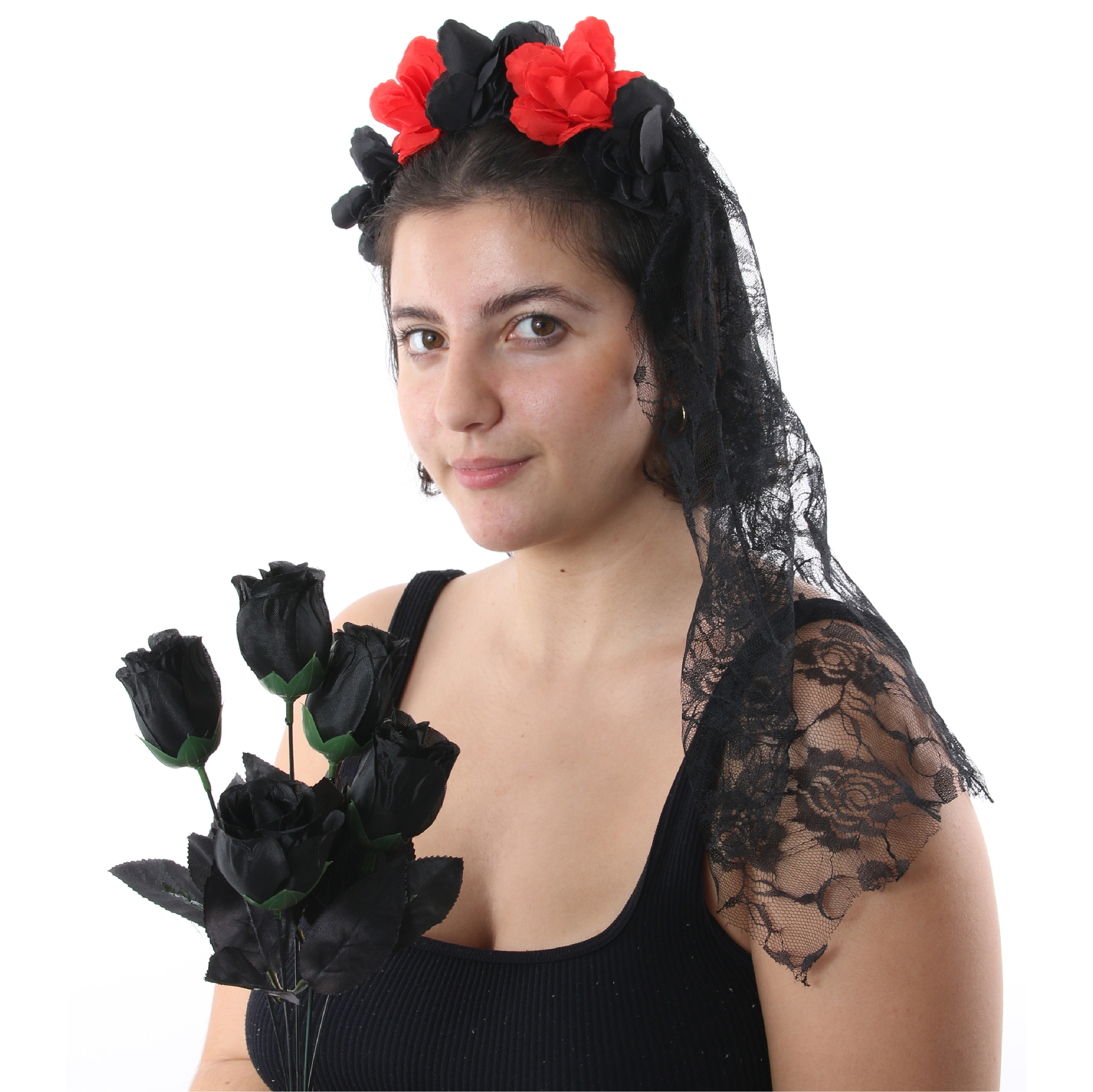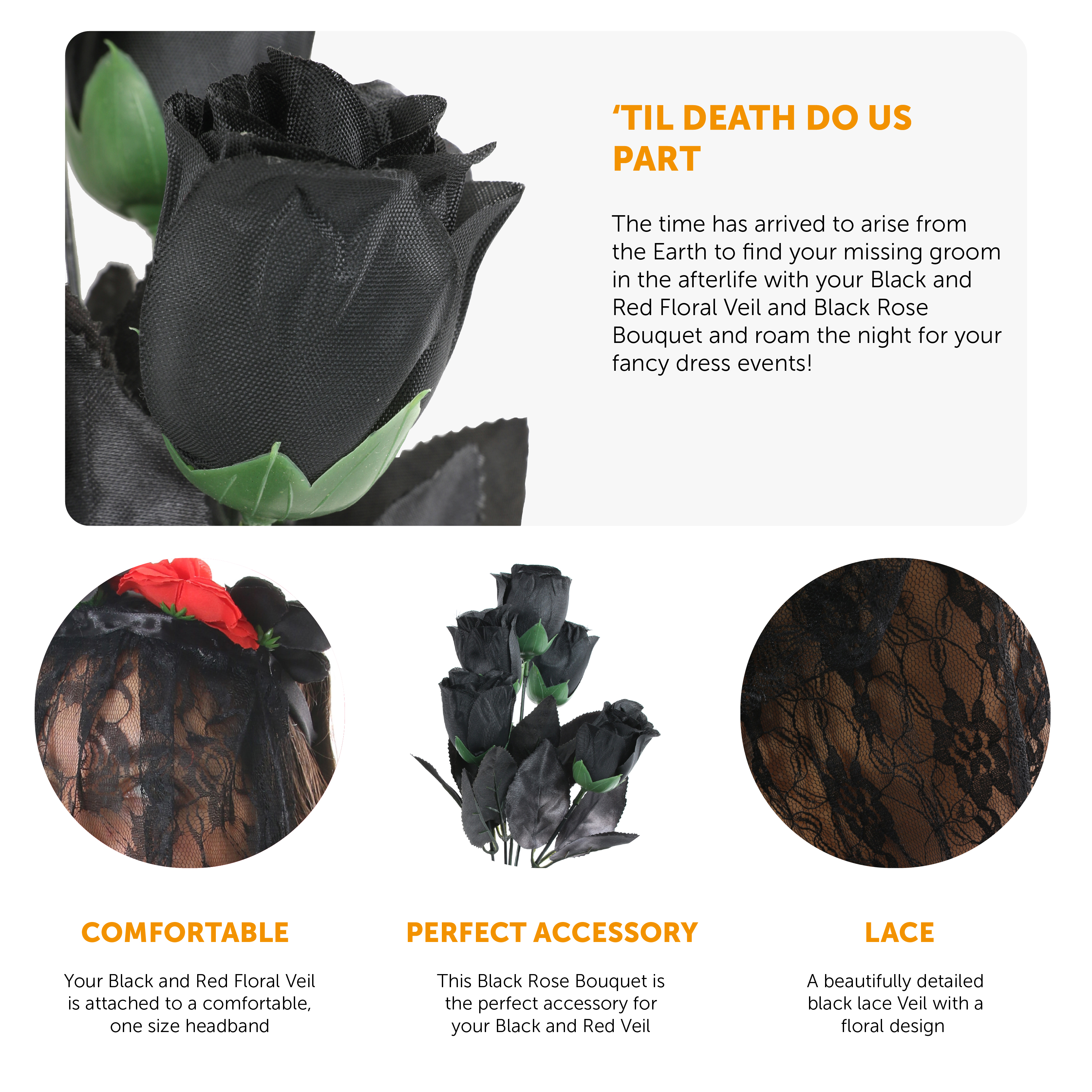 SET INCLUDES: Your Bride Accessory Set includes a Long Black Lace Veil with a delicate Floral Pattern, attached to a Headband with Black & Red Roses on top, and a small Bouquet of Black Roses, the perfect Accessory Set to accompany your look this Halloween!