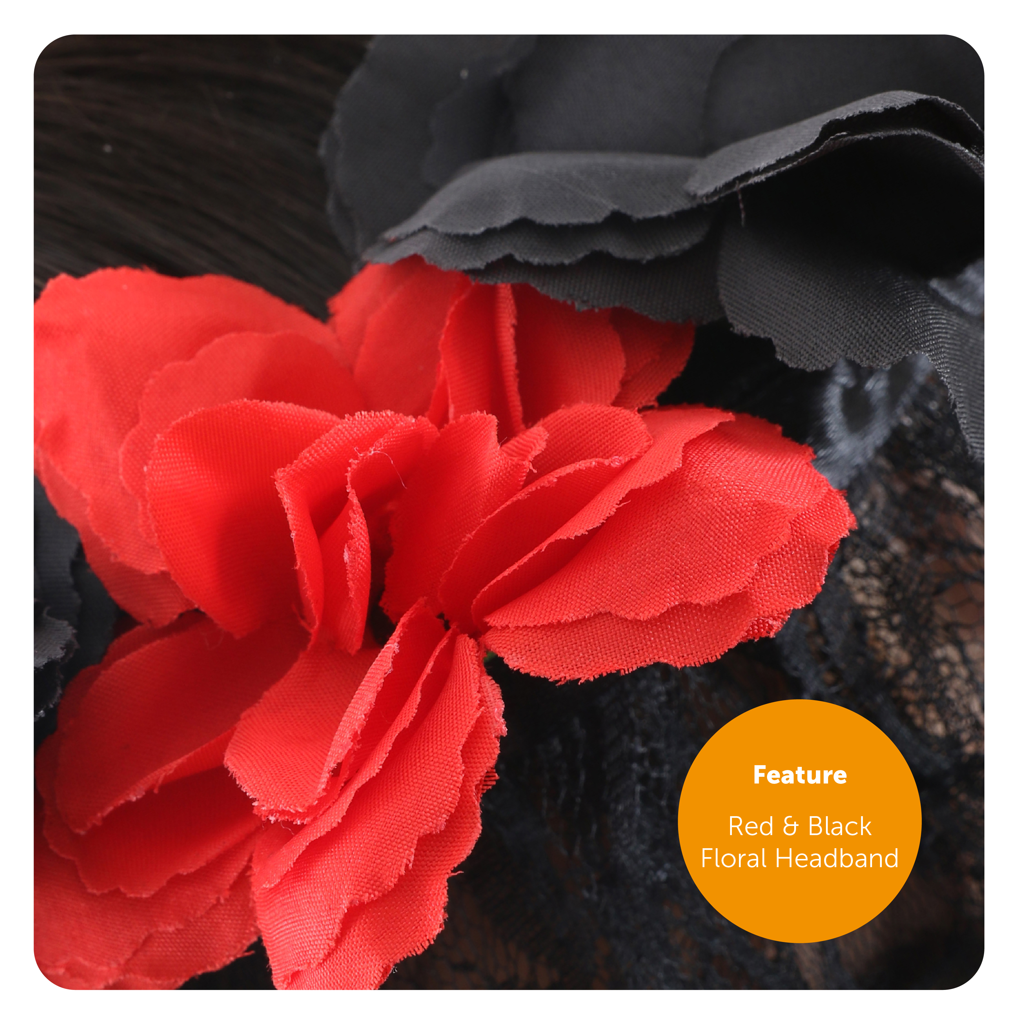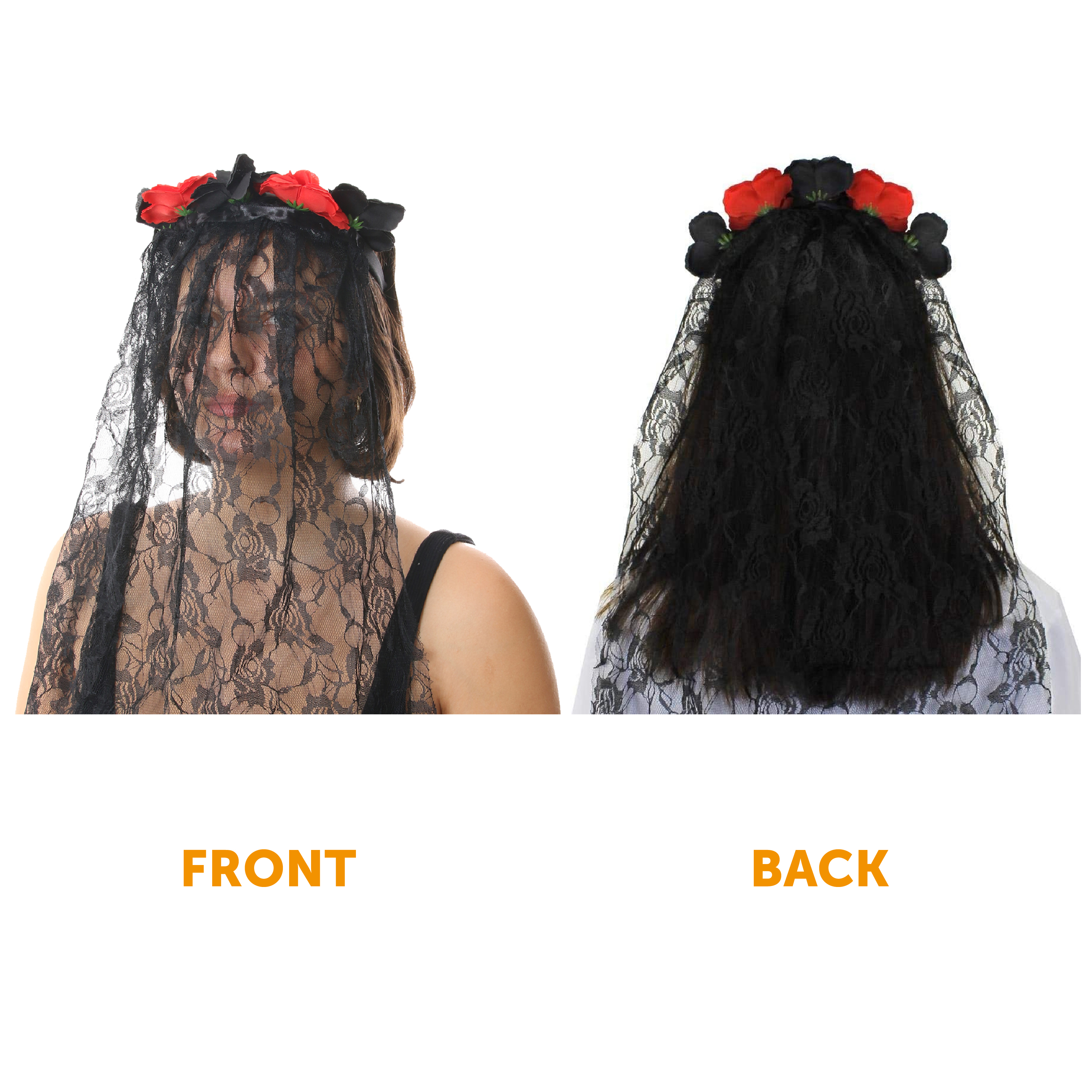 ONE SIZE FITS MOST: Attached to a comfortable one sized Headband, this Black & Red Rose Floral Lace Veil can be worn over the face or swept back, it is the perfect accessory for your Costume!