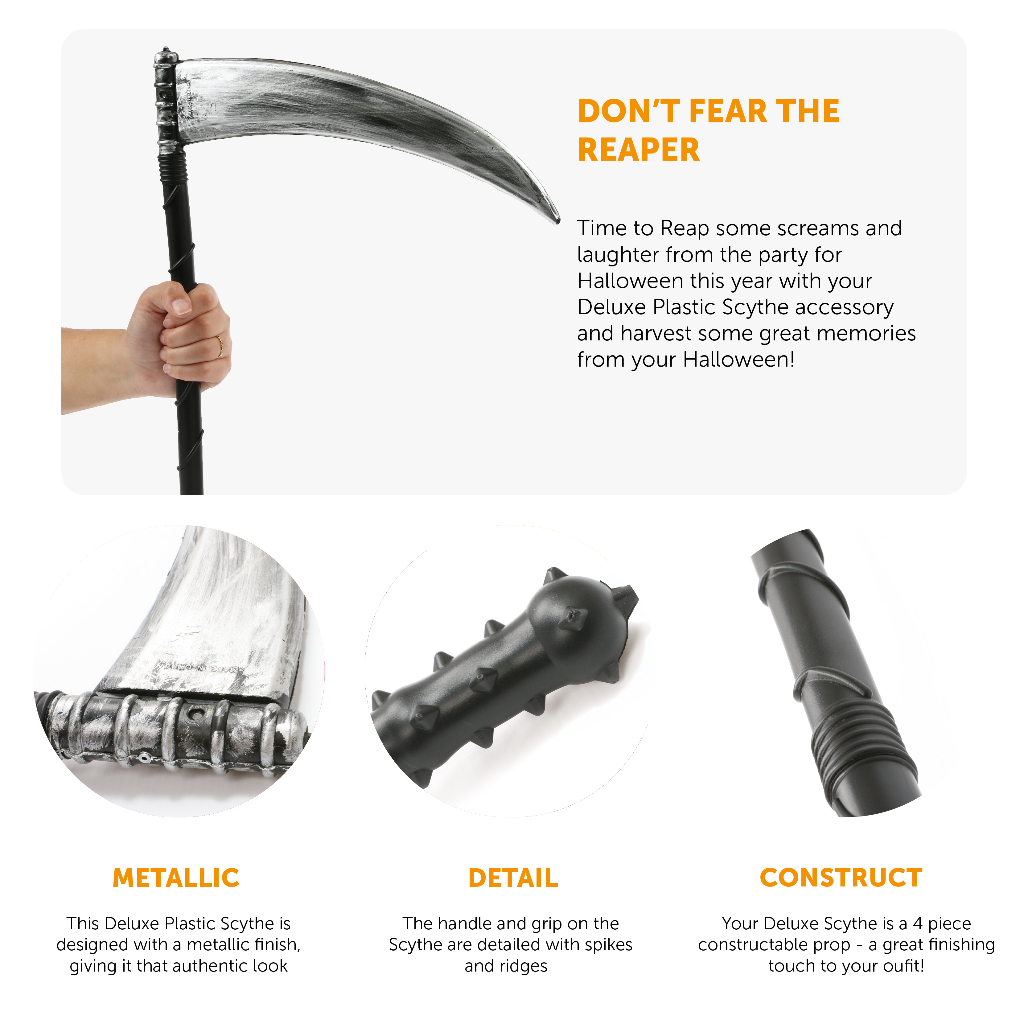 GRIM REAPER DELUXE SCYTHE: Time to Reap some screams and laughter from the party for Halloween this year with your Grim Reaper Deluxe Scythe accessory and harvest some great memories from your Halloween! GRIM REAPER SCYTHE DETAILS: Your Grim Reaper Scythe is a constructable scythe composed of 5 pieces, 4 black screw in handles, and 1 Grey screw in deluxe blade, and is 53”/134cm in length once fully constructed! AVAILABLE IN MULTIPLE PACKS: Your Grim Reapers Scythe is available in multiple packs, from Single, Packs of 2, Packs of 3, Packs of 6, and Packs of 12 for you to reap some good times with your friends together! COMPLETE ANY REAPER COSTUME: If you already have a Grim Reaper costume prepped and ready, then you need to look no further than to complete your look off perfectly than with a helping hand from our Grim Reapers Scythe! PERFECT FOR HALLOWEEN FANCY DRESS EVENTS: Whether you’re adding the finishing touches to your Halloween Costume, or looking for an accessory to accompany your costume, then our Prop Deluxe Grim Reapers Scythe is perfect for you!