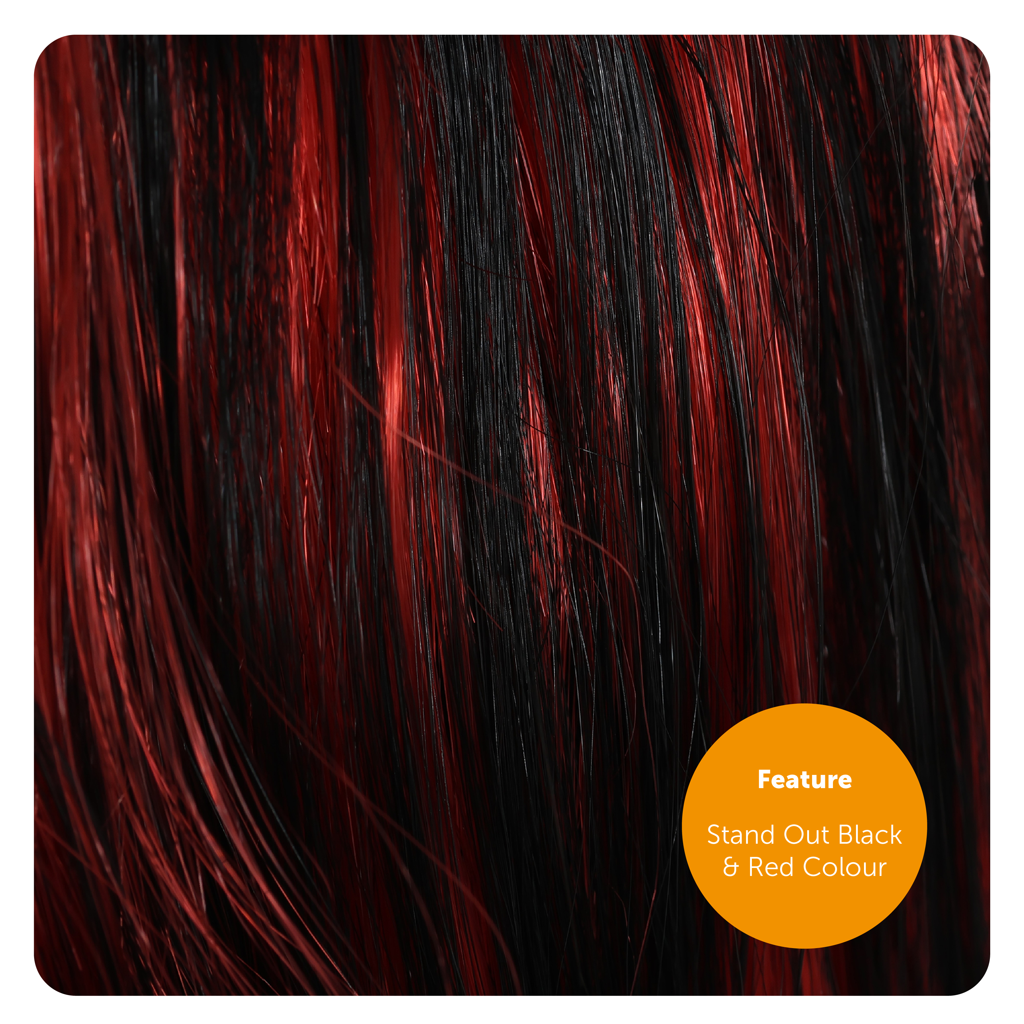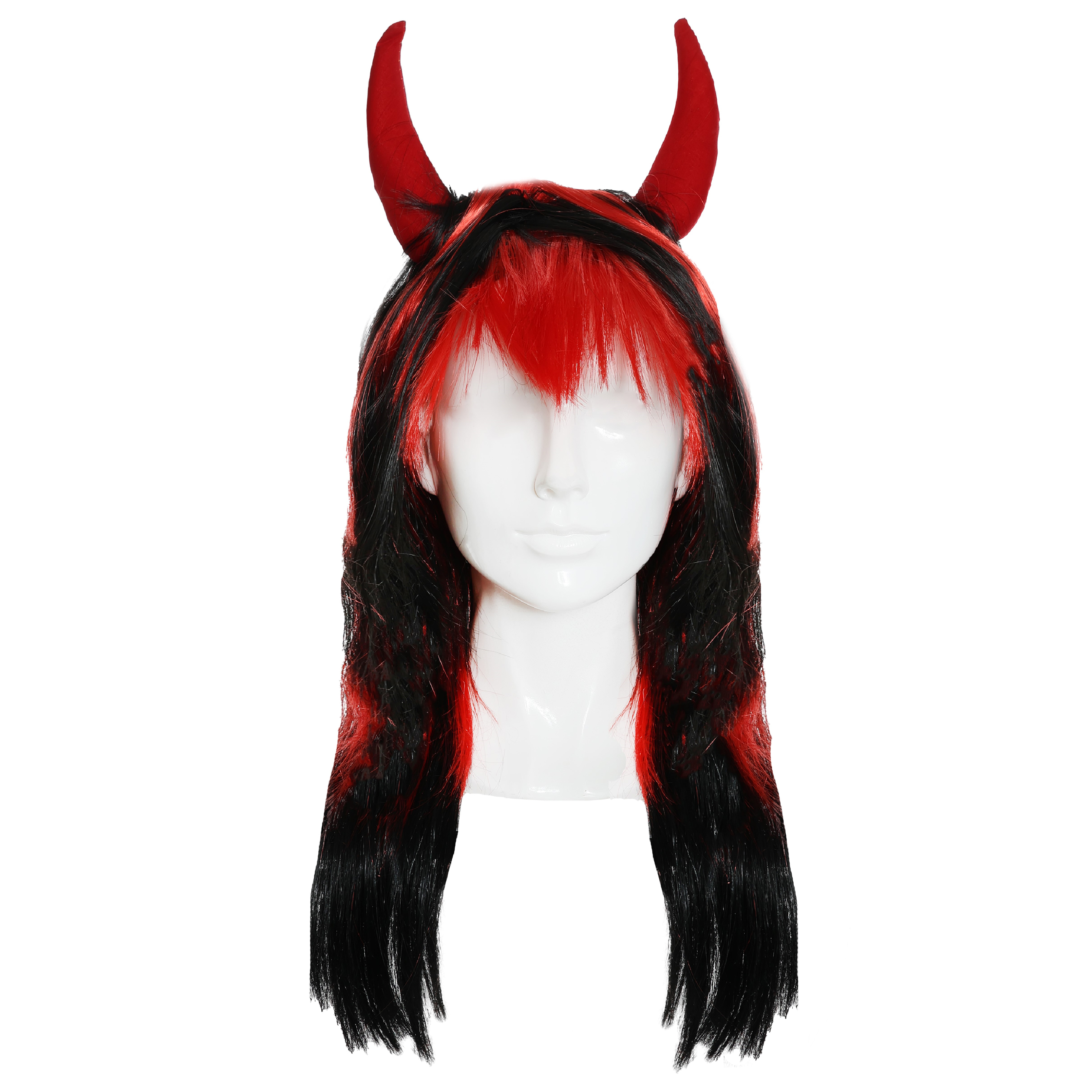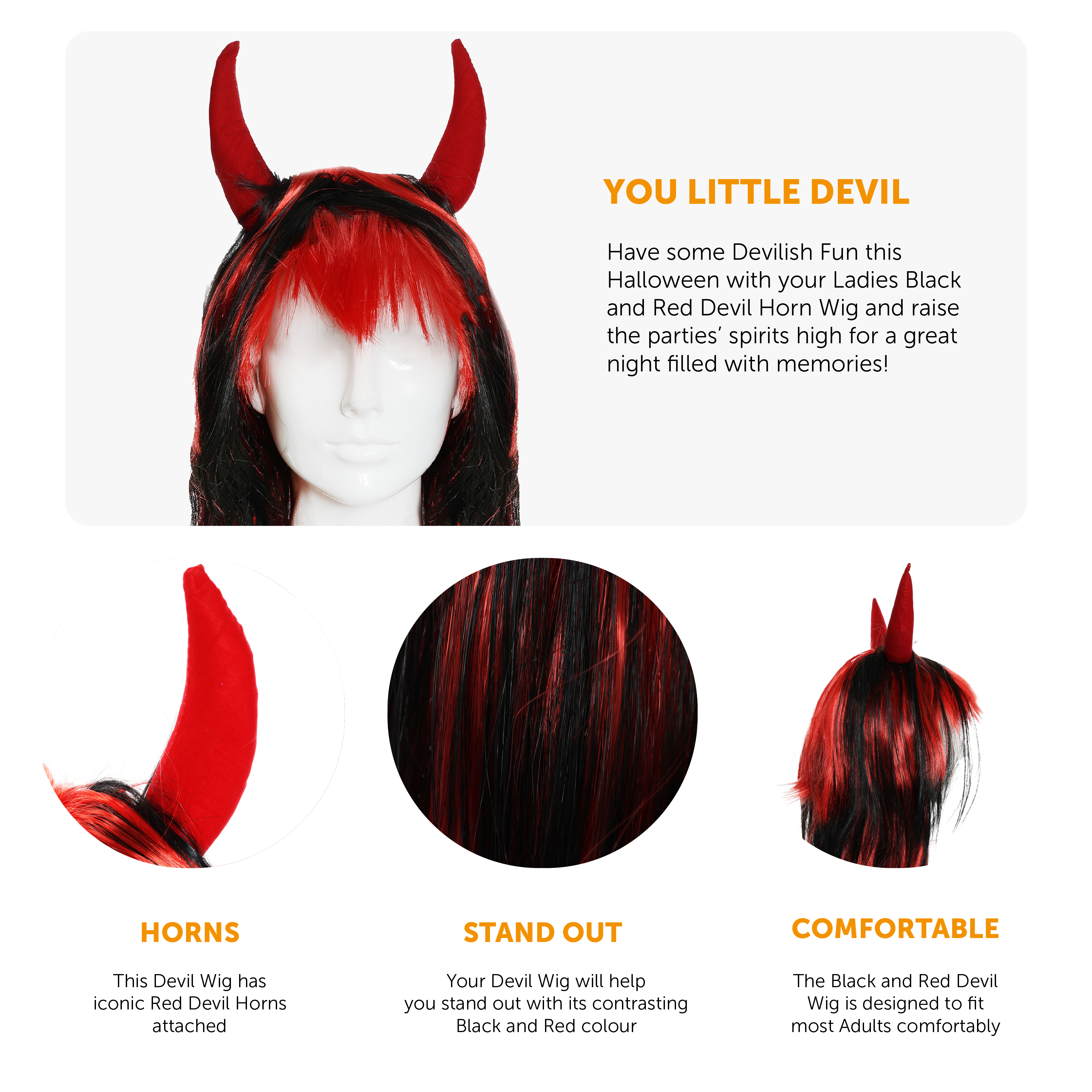 WIG DETAILS: This Ladies Devil Wig is a long Black Wig with a stand out Red Fringe, Red Highlights all over the back and with Red Devil Horns attached, the perfect accessory to act Devilish all night long!