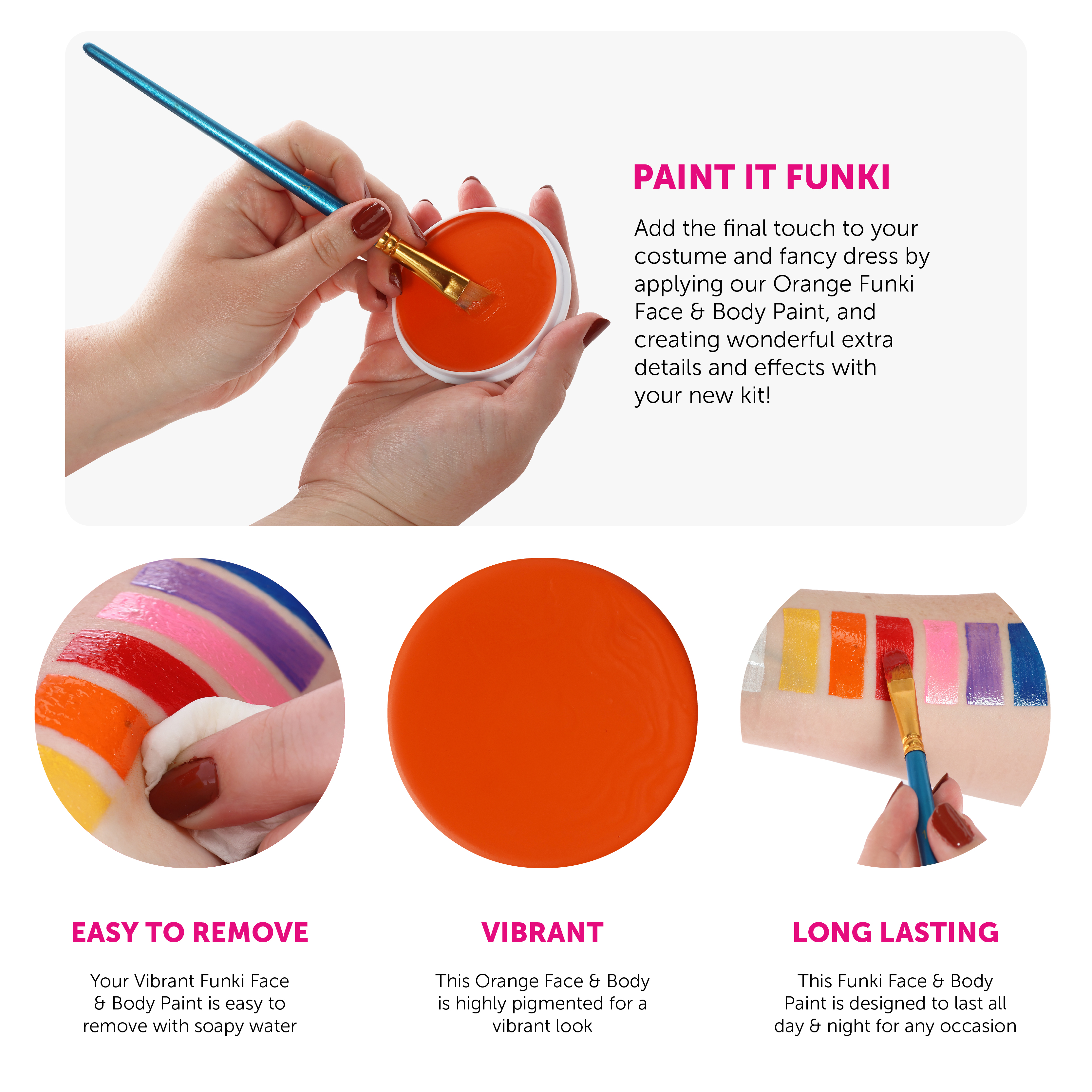 • ORANGE FUNKI FACE & BODY PAINT: Add the final touch to your costume and fancy dress by applying our Orange Funki Face & Body Paint and creating wonderful extra details and effects with your new kit!