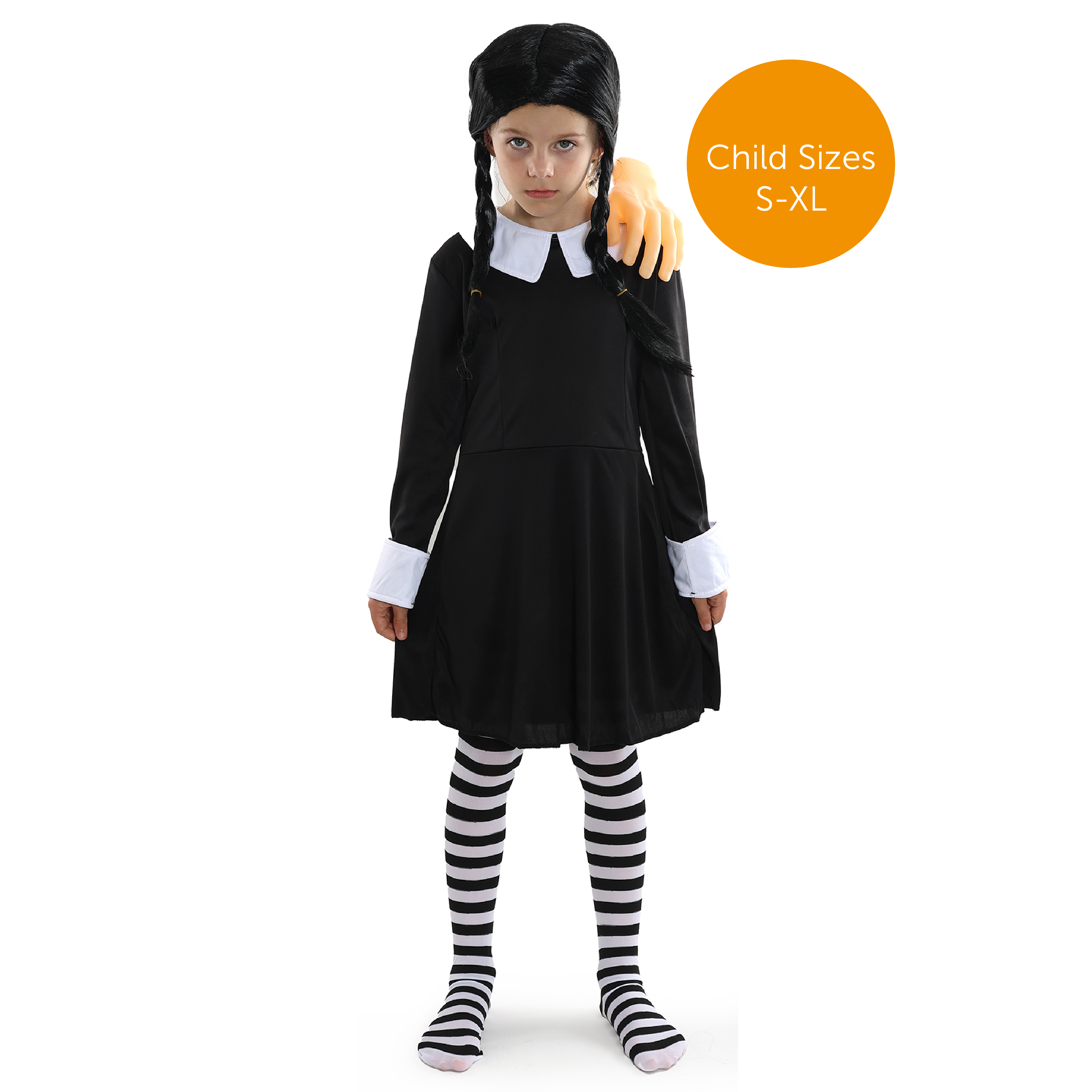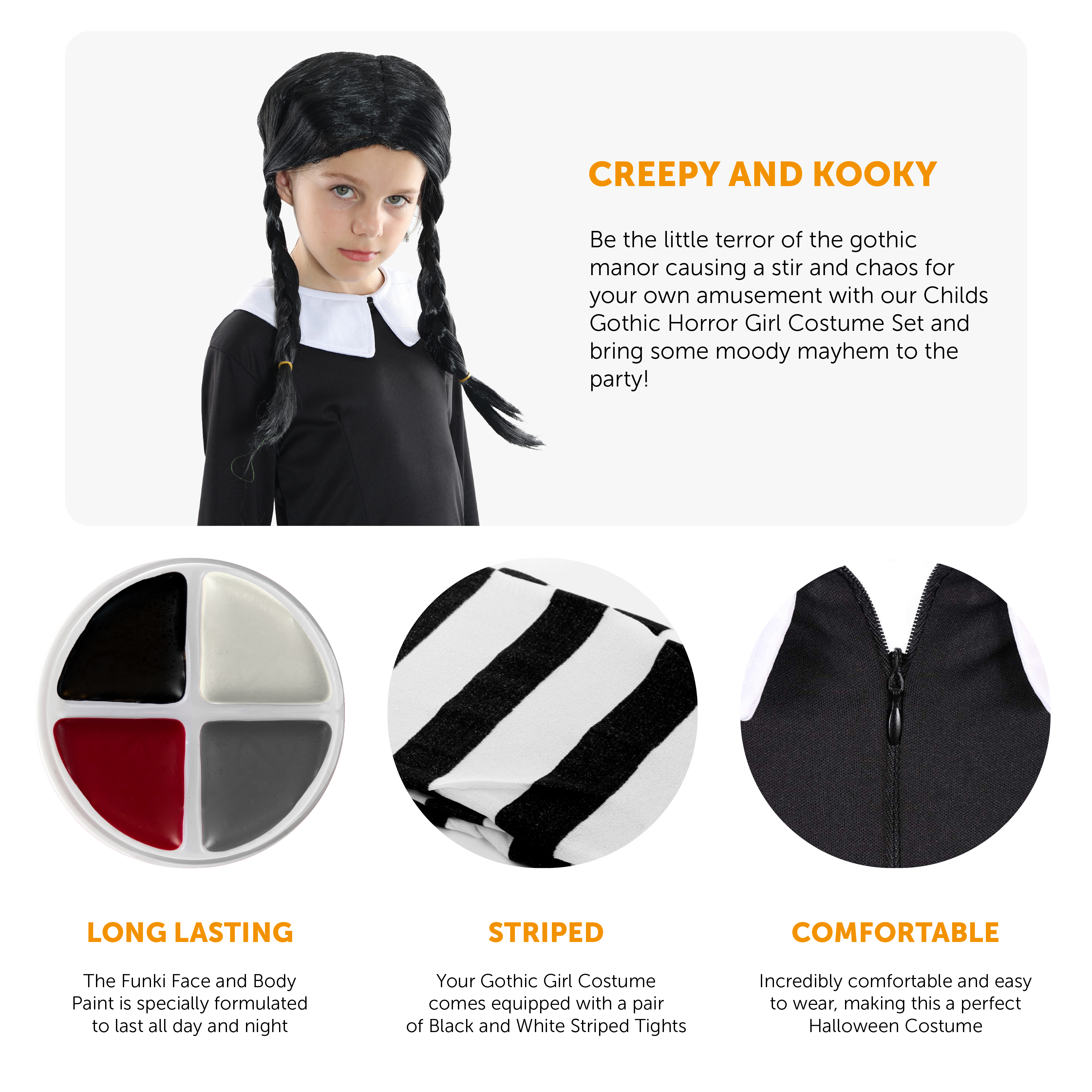 COSTUME DETAILS: Your Child's Gothic Horror Girl Costume includes a Long Sleeve Black Dress with a White Collar and a zip up back, a palette of Funki Face Paint, and a pair of Black and White Striped Tights, a great look for you this Halloween!