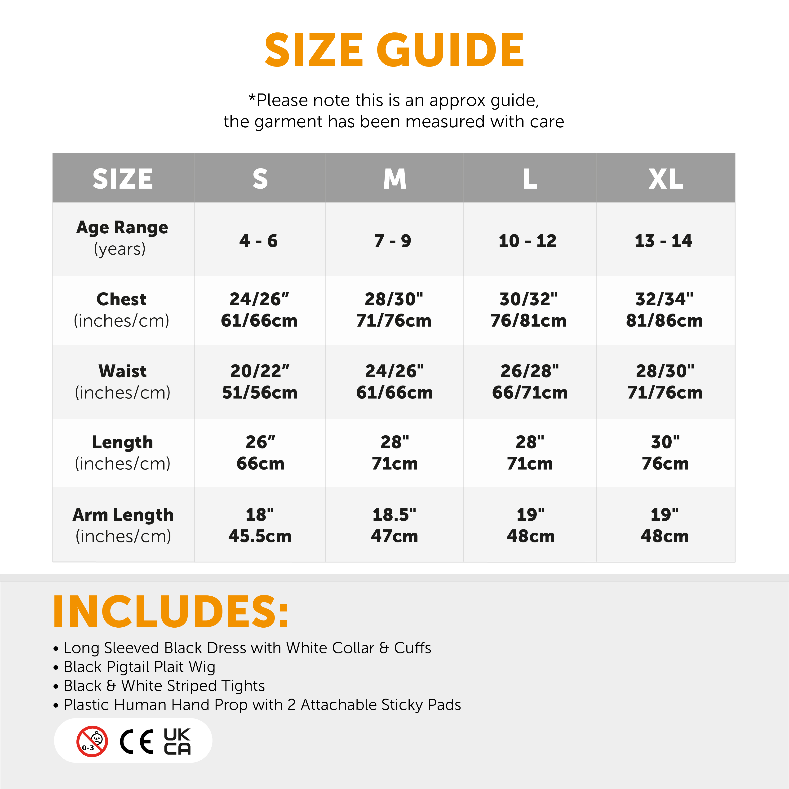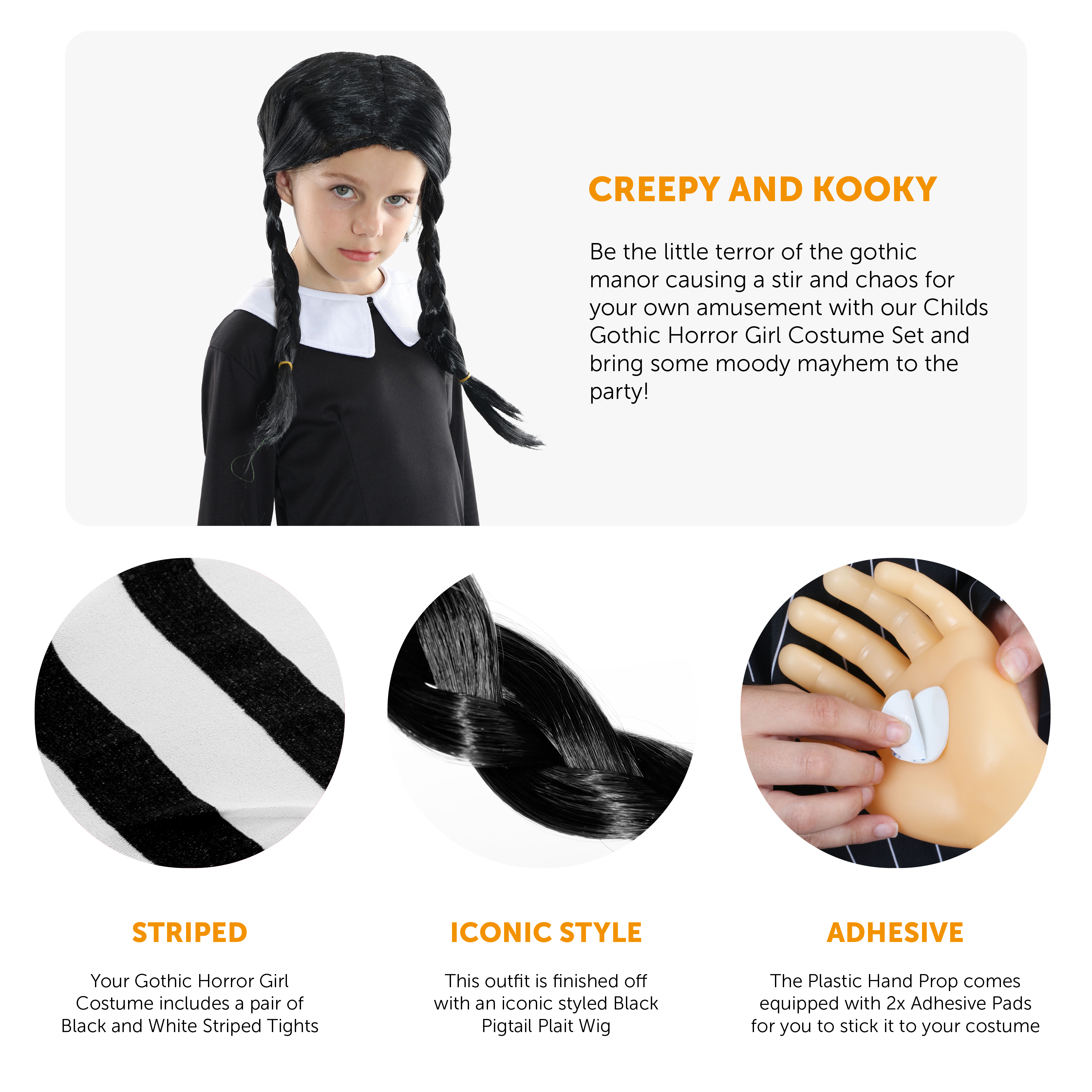 COSTUME DETAILS: Your Child's Gothic Horror Girl Costume includes a Long Sleeve Black Dress with a White Collar and Sleeve Cuffs and a zip up back, a pair of Black and White Striped Tights, Black Pigtail Plait Wig, and a Plastic Human Hand Prop with 2 attachable Sticky Pads for you to place on your costume!