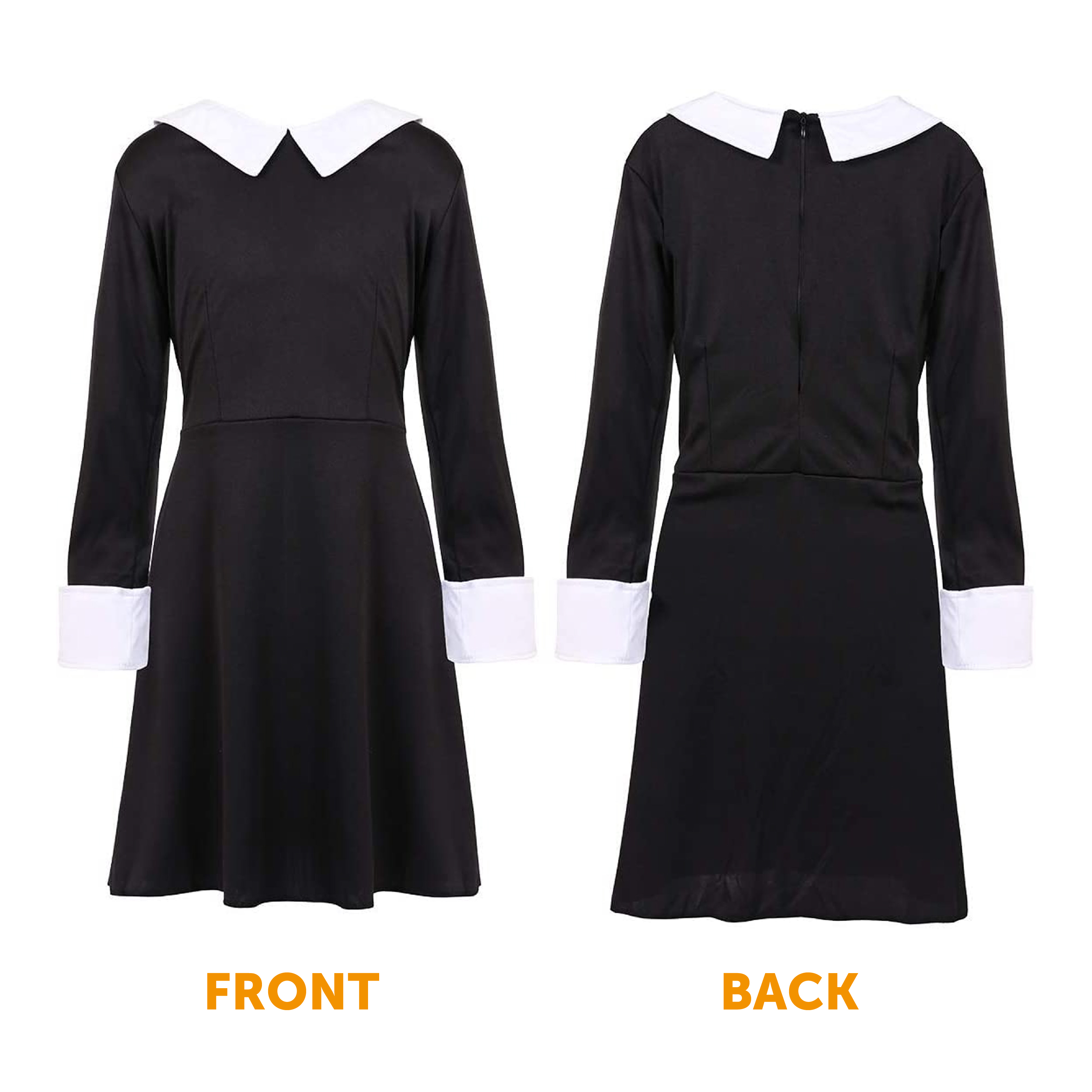 COSTUME DETAILS: Your Child's Gothic Horror Girl Costume includes a Long Sleeve Black Dress with a White Collar and a zip up back, and a Black Pigtail Plait Wig, a great look for you this Halloween!