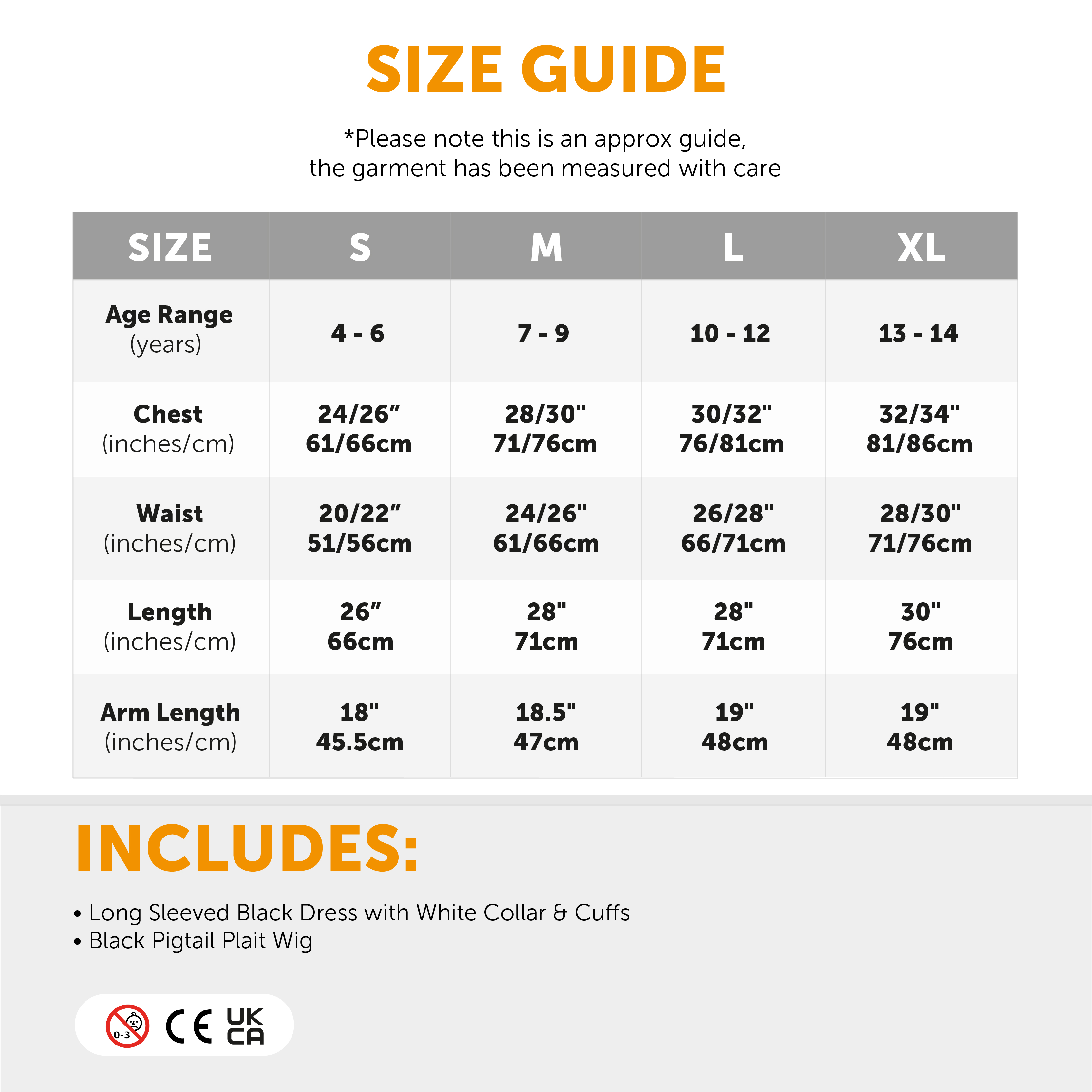 AVAILABLE IN MULTIPLE SIZES: Your Child's Gothic Horror Girl Dress is available in multiple sizes from Small to X-Large: Small - 4 - 6 Years - Chest 24/26" (61/66cm), Waist 20/22" (51/56cm), Length 26" (66cm), Arm Length 18" (45.5cm) | Medium - 7 - 9 Years - Chest 28/30" (71/76cm), Waist 24/26" (61/66cm), Length 28" (71cm), Arm Length 18.5" (47cm) | Large - 10 - 12 Years - Chest 30/32" (76/81cm), Waist 26/28" (66/71cm), Length 28" (71cm), Arm Length 19" (48cm) | X-Large - 13 - 14 Years - Chest 32/34" (81/86cm), Waist 28/30" (71/76cm), Length 30" (76cm), Arm Length 19" (48cm)