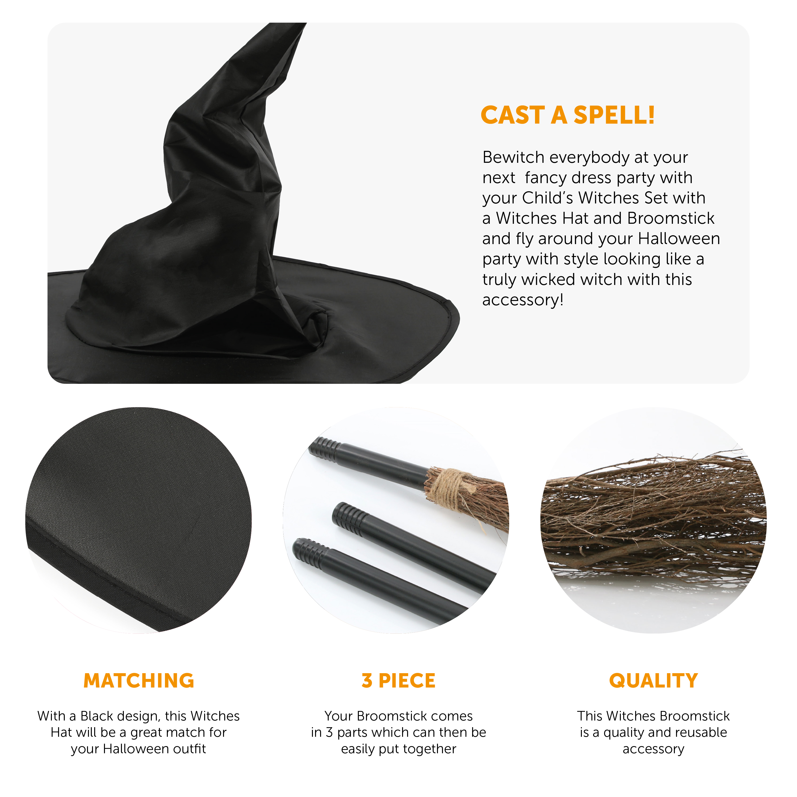 SET INCLUDES: The Witch Accessory Set includes a lightweight Black Witches Hat, and a 3 Piece Witches Broomstick prop with an authentic design, the perfect set to accompany your spooky Witch style!