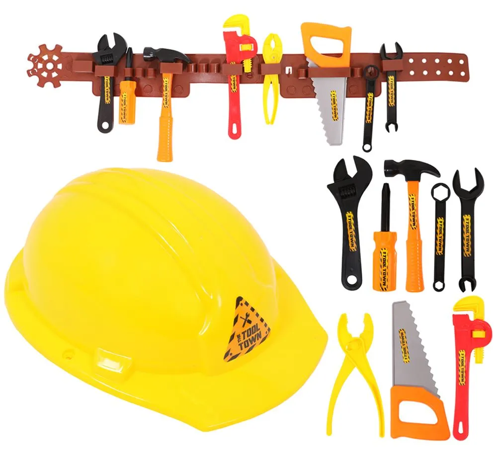 A Hard Hat, Adjustable Tool Belt, and 8 Toy Tools — including a Hand Saw, Pipe Wrench, 2x Spanners, Screwdriver, Hammer, Pliers, and Adjustable Spanner!