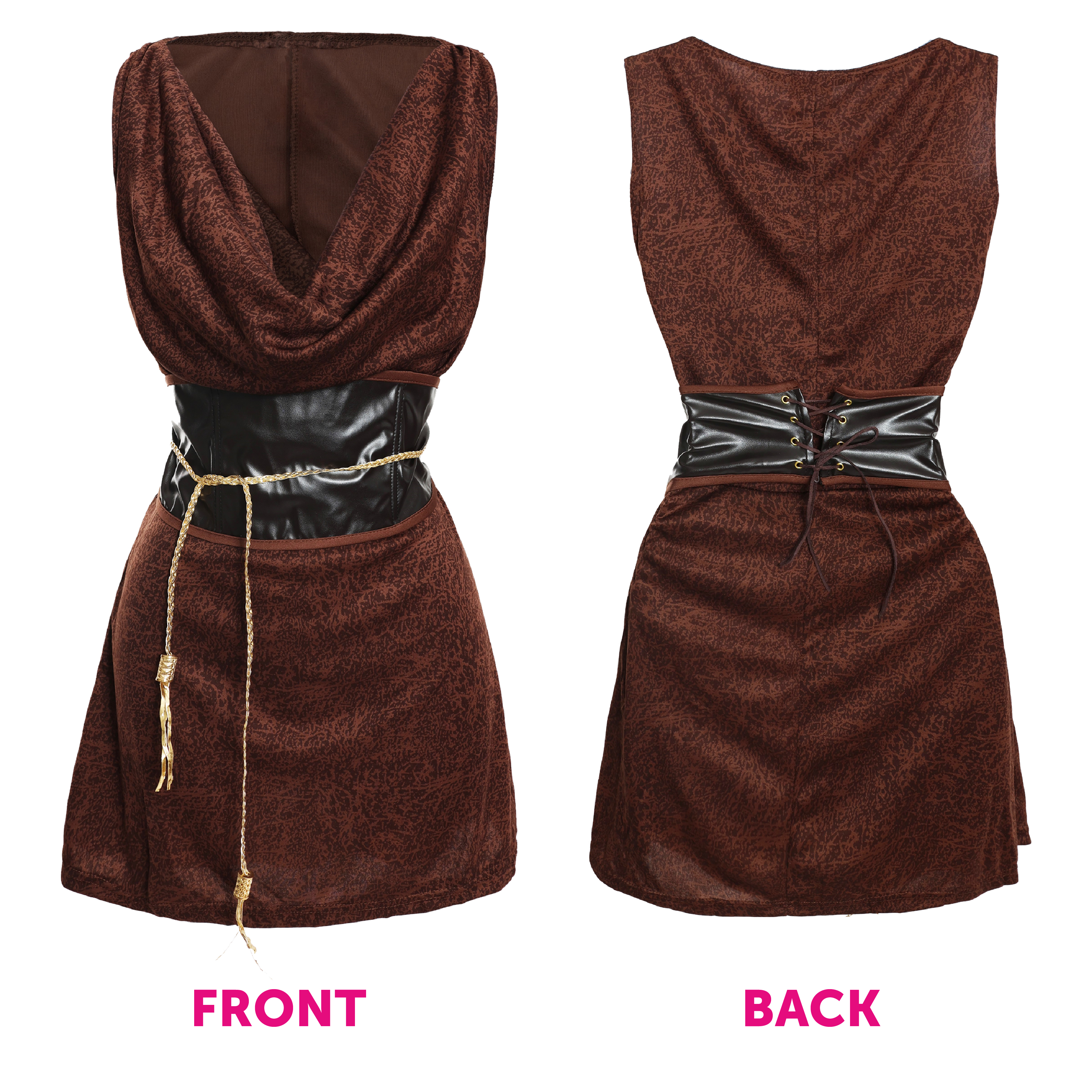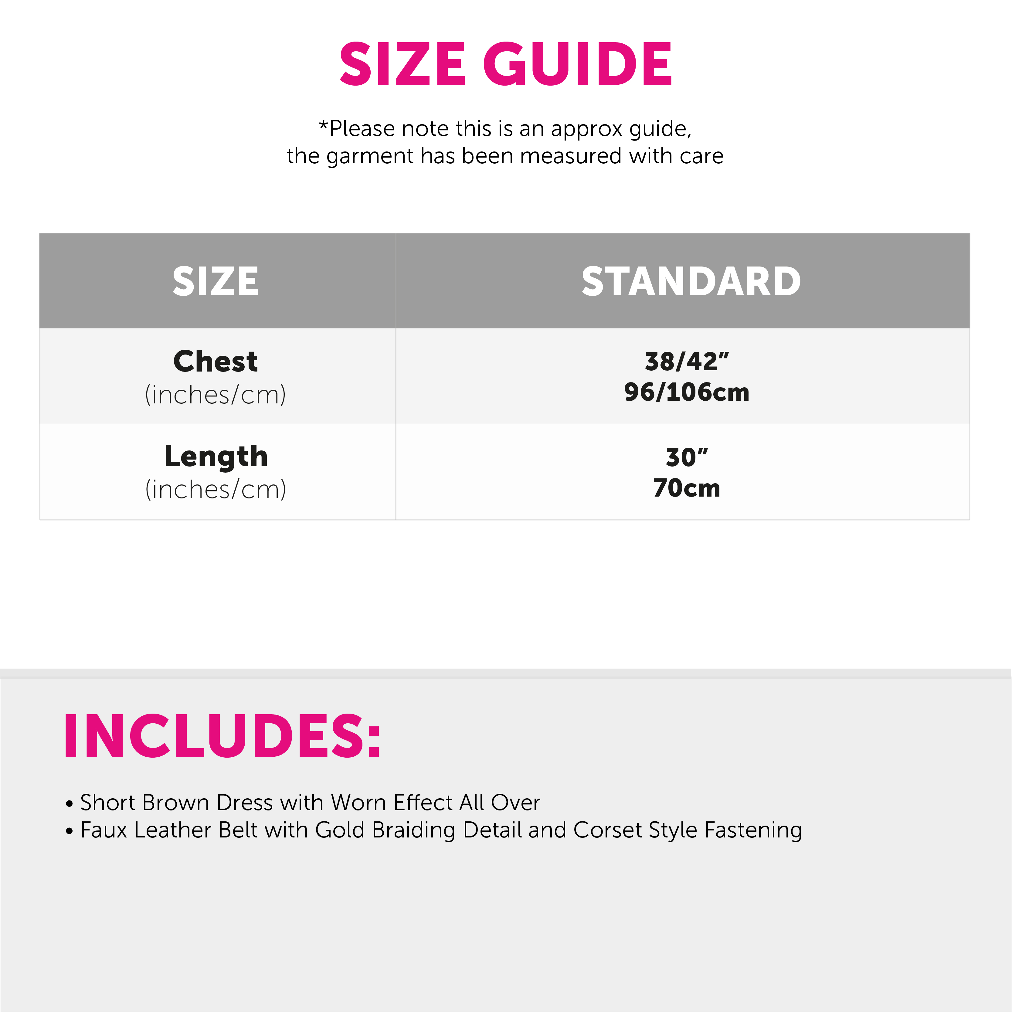 DRESS DETAILS: Your Ladies Dress is a loose fitting, short Brown Dress with a rough, worn effect all over, a Faux Leather Belt with Corset style fastening and Gold Braiding detail!