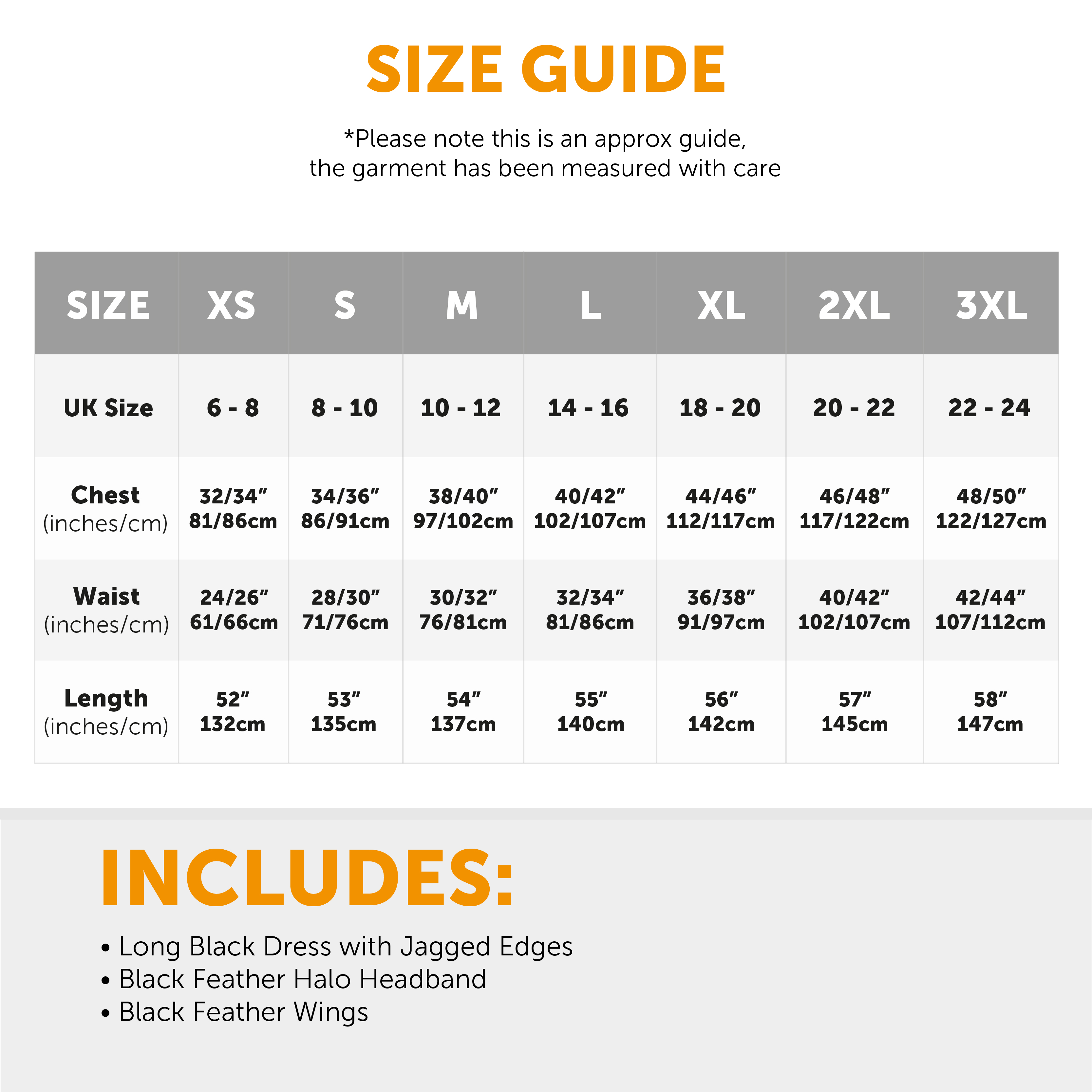 AVAILABLE IN MULTIPLE SIZES: This Ladies Dark Angel Costume is available in multiple sizes from X-Small to XXX-Large: X-Small (UK 6-8) - Chest: 32/34" (81/86cm), Waist: 24/26" (61/66cm), Length: 52" (132cm) | Small (UK 8-10) - Chest: 34/36" (86/91cm), Waist: 28/30" (71/76cm), Length: 53" (135cm) | Medium (UK 10-12) - Chest: 38/40" (97/102cm), Waist: 30/32" (76/81cm), Length: 54" (137cm) | Large (UK 14-16) - Chest: 40/42" (102/107cm), Waist: 32/34" (81/86cm), Length: 55" (140cm) | X-Large (UK 18-20) - Chest: 44/46" (112/117cm), Waist: 36/38" (91/97cm), Length: 56" (142cm) | XX-Large (UK 20-22) - Chest: 46/48" (117/122cm), Waist: 40/42" (102/107cm), Length: 57" (145cm) | XXX-Large (UK 22-24) - Chest: 48/50" (122/127cm), Waist: 42/44" (107/112cm), Length: 58" (147cm)
