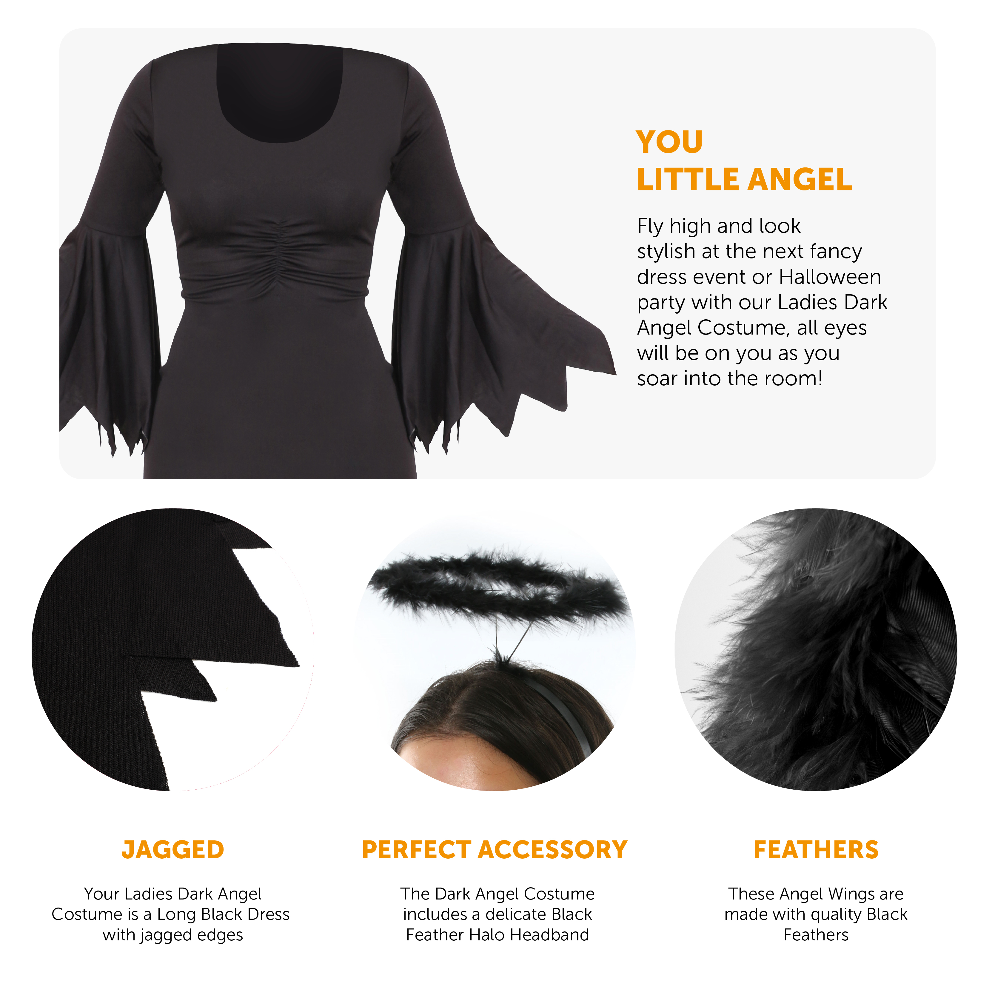 COSTUME INCLUDES: Your Ladies Dark Angel Costume includes a Long Black Dress with tattered edges, a Black Halo Headband, and Black Feather Wings with comfortable straps, the perfect look for any fancy dress event!