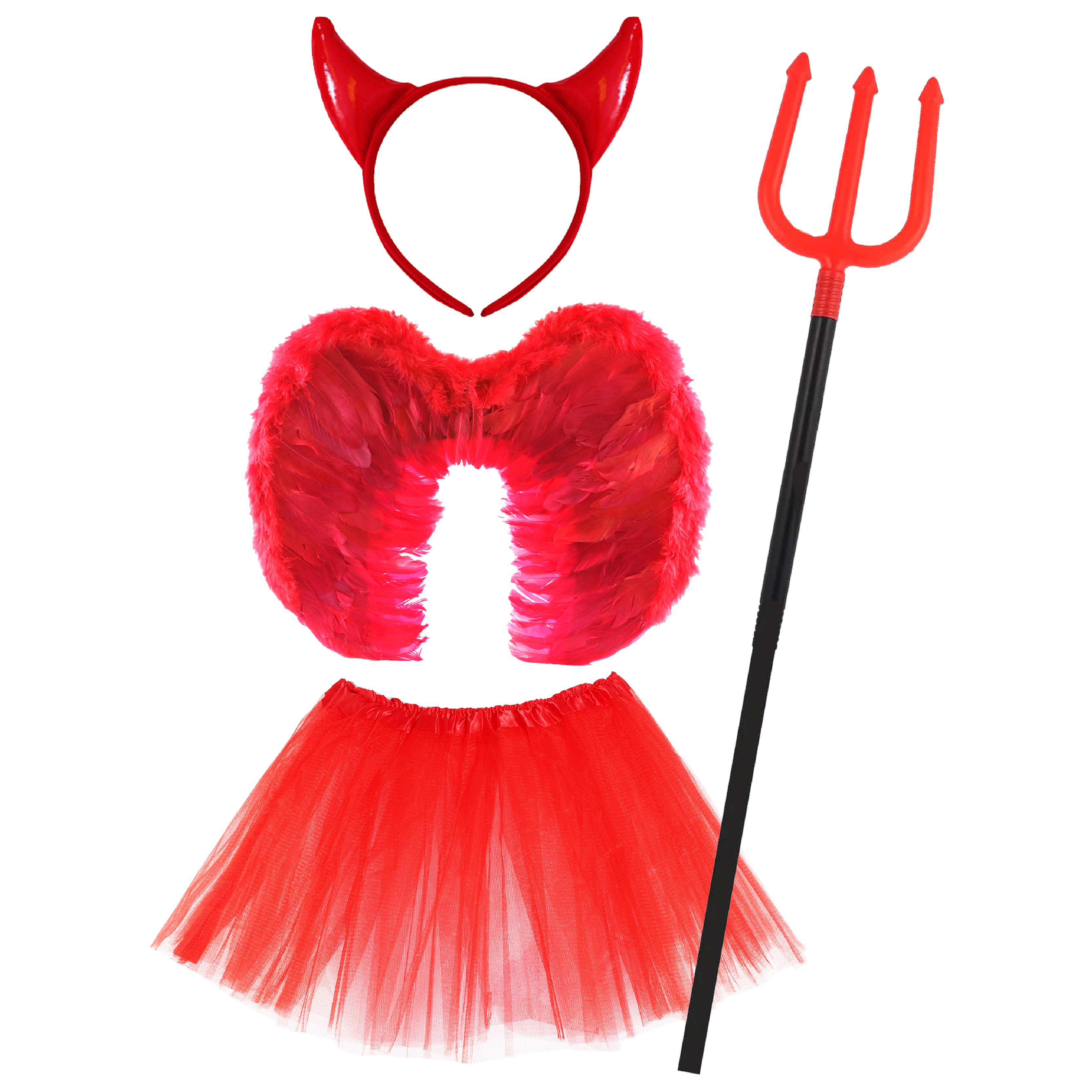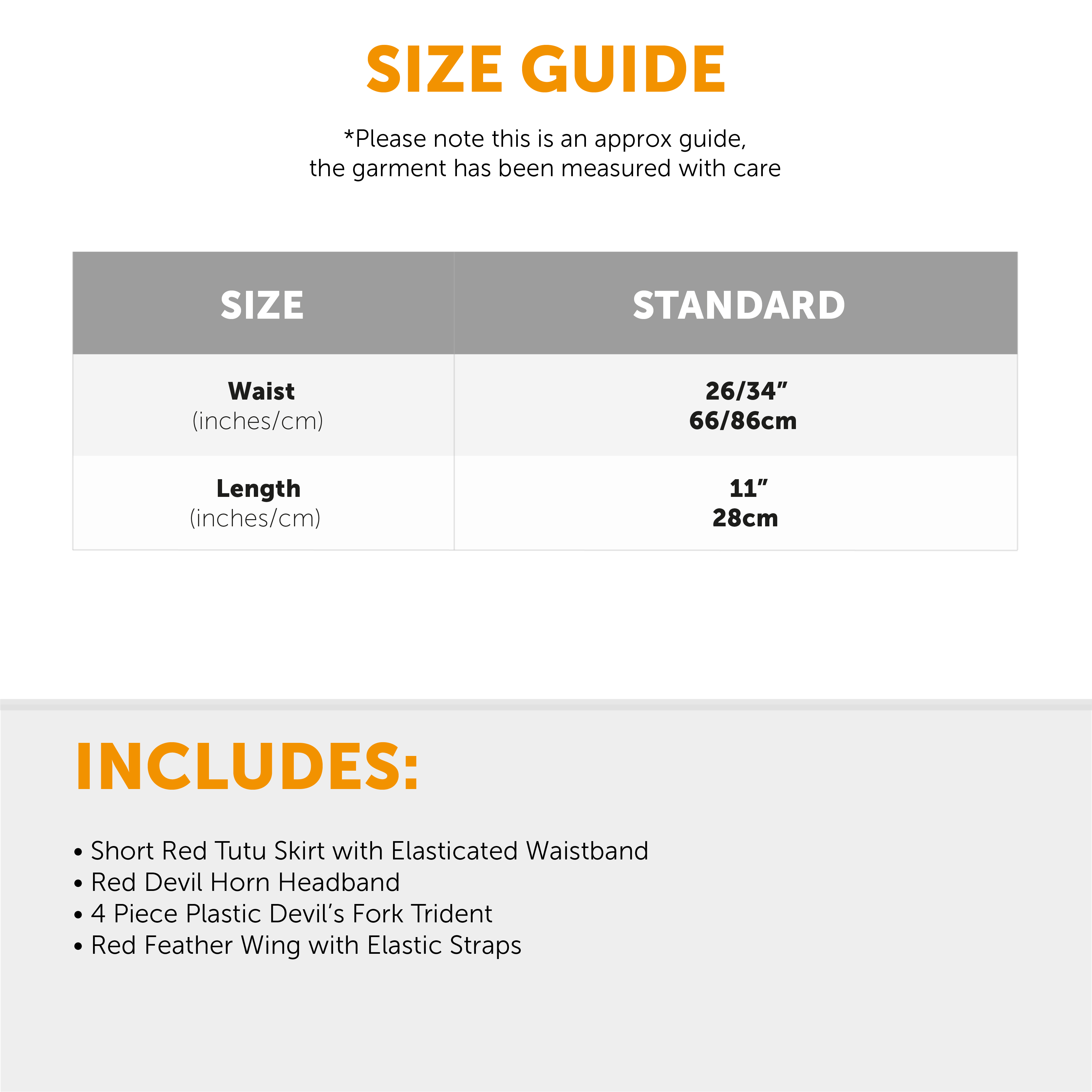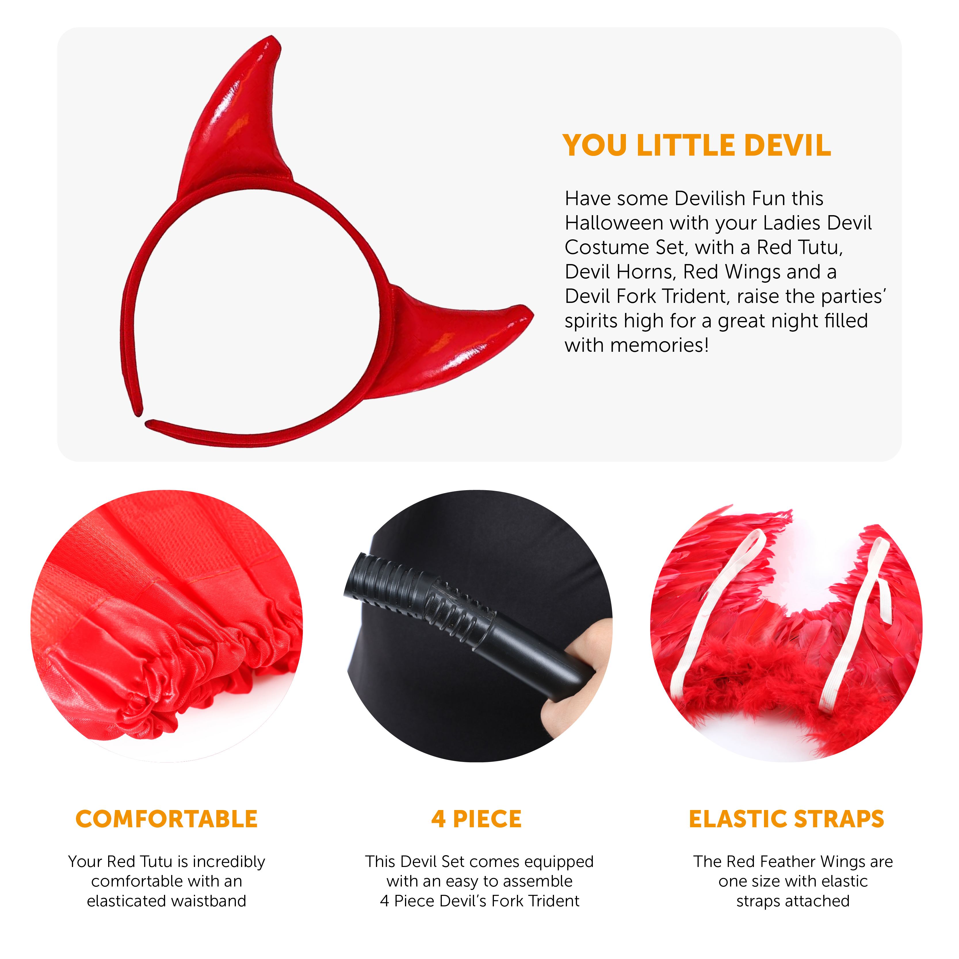 COSTUME DETAILS: This Ladies Devil Costume Set includes a vibrant Red Tutu with netted layers and an elasticated waistband, a Red Devil Horn Headband, Red Feather Wings with elasticated straps and an easy to assemble 4 Piece Plastic Devil Fork Trident, the perfect Costume to act Devilish all night long!