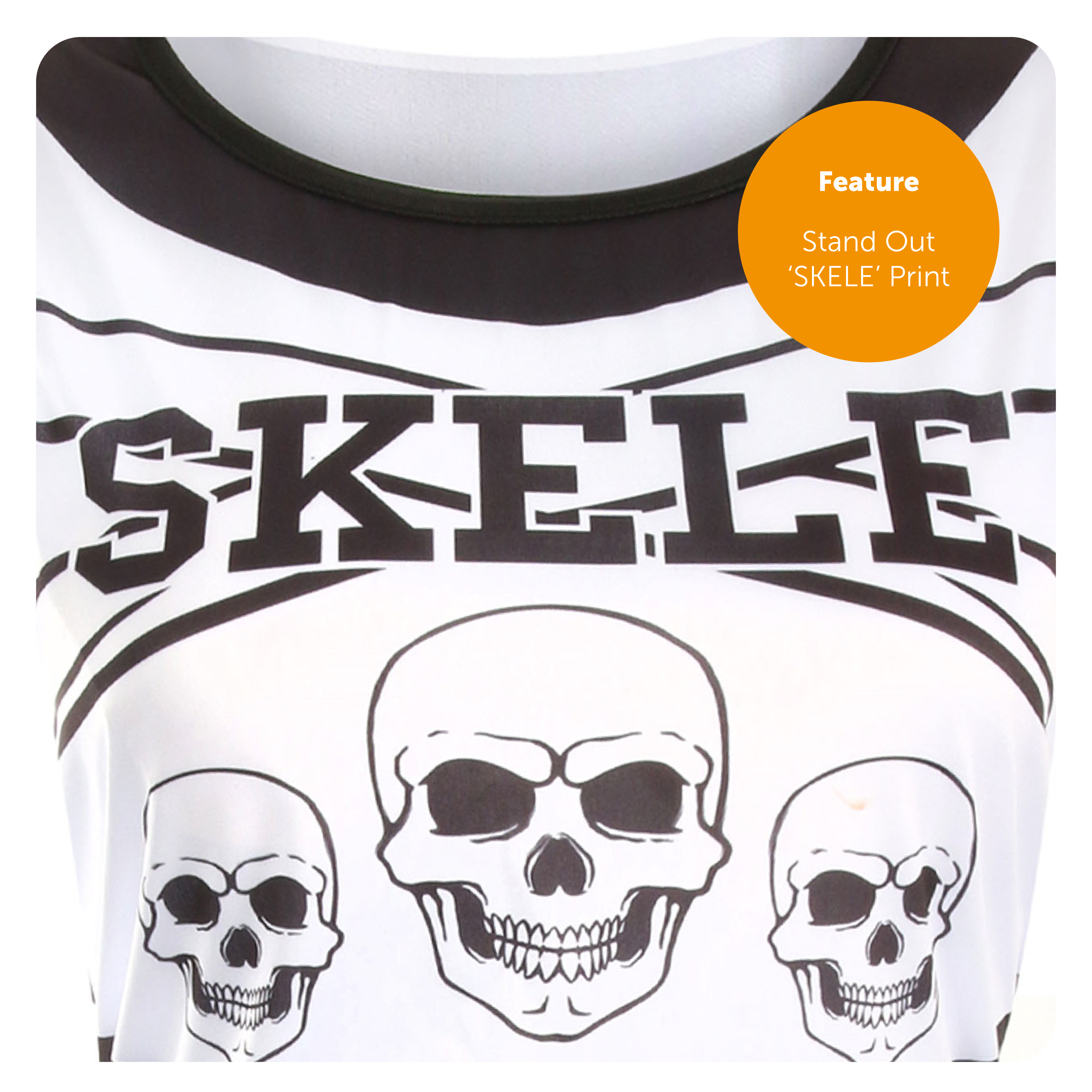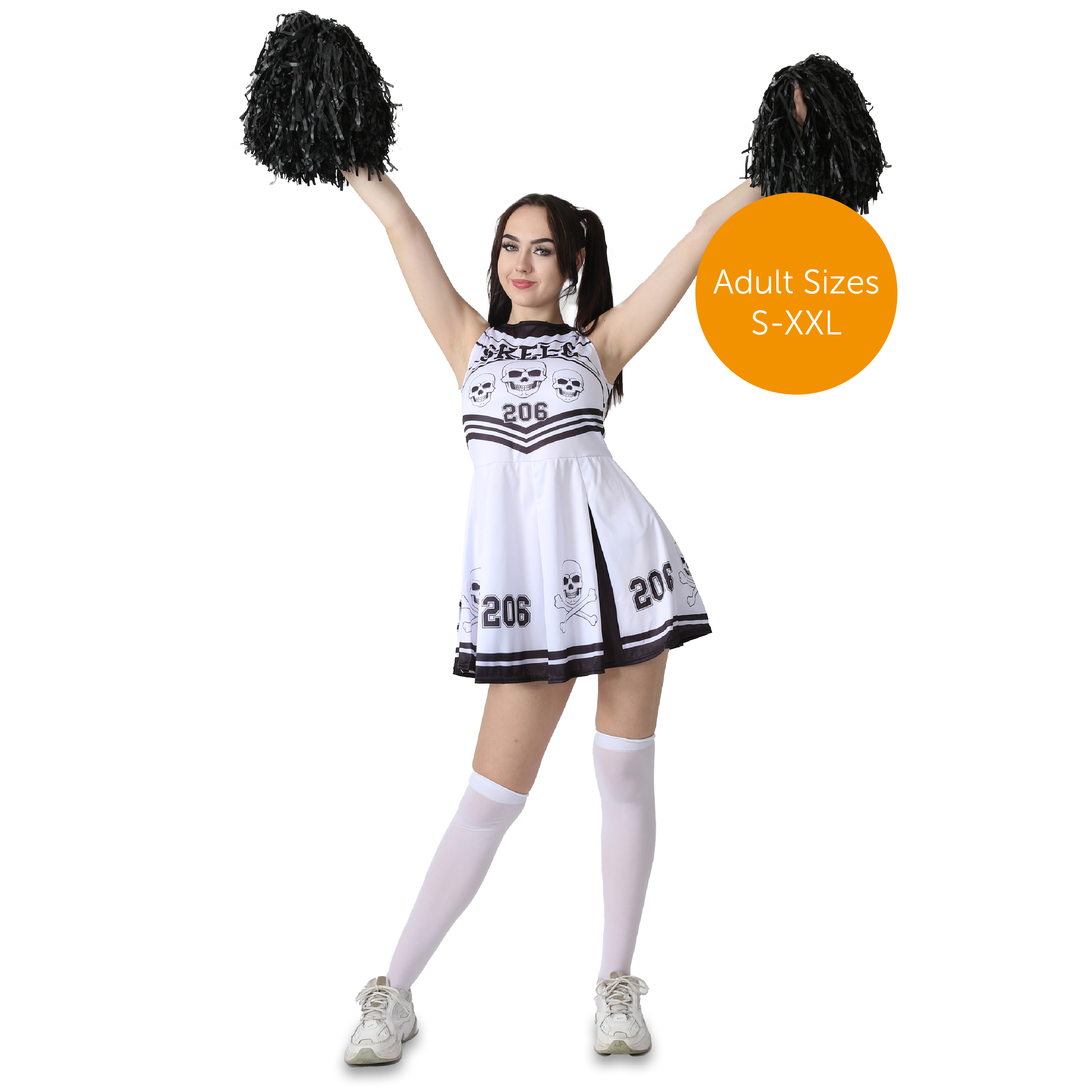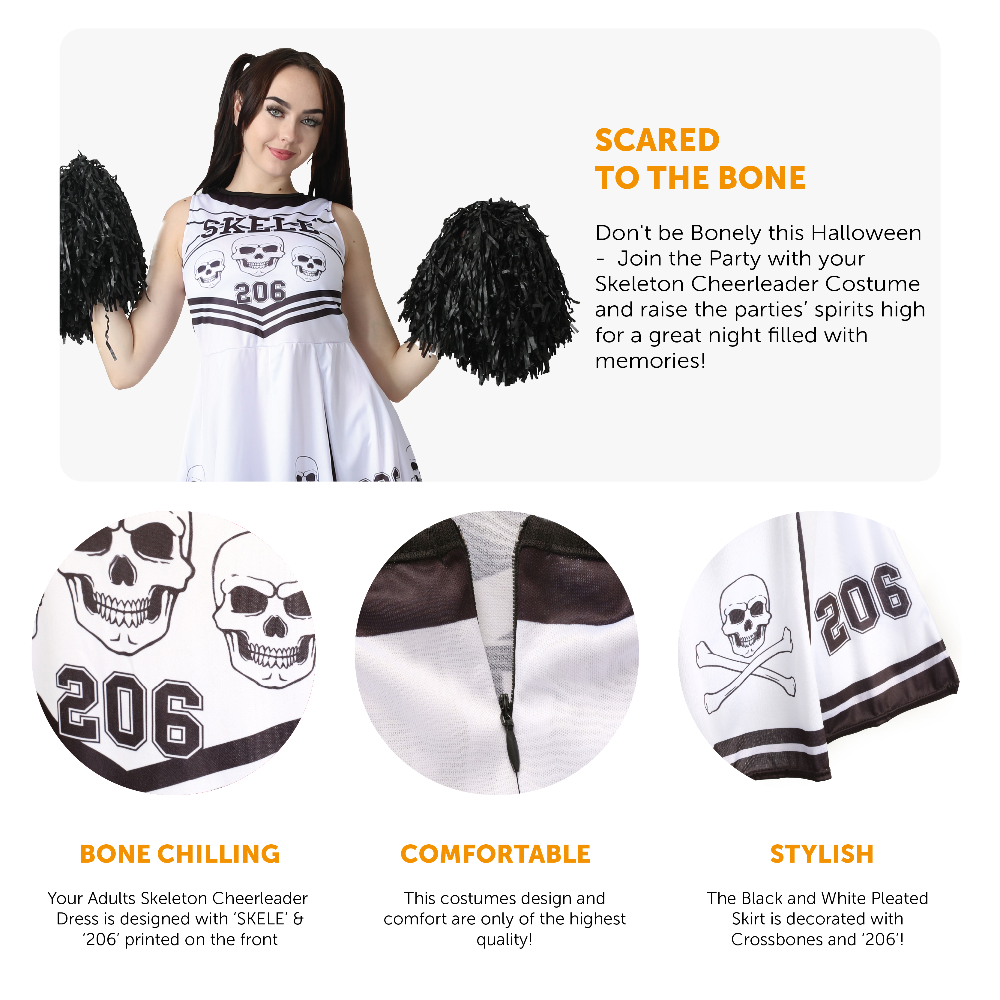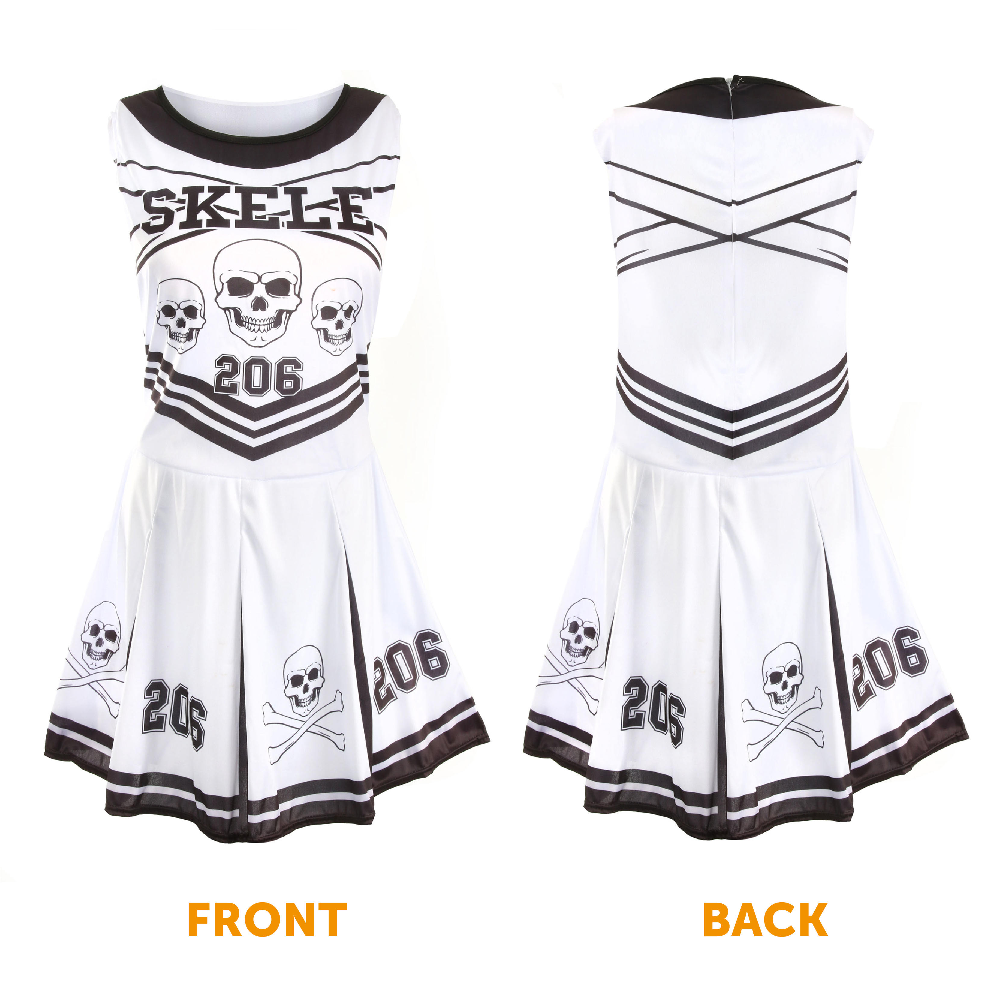 SKELETON CHEERLEADER DETAILS: Your Skeleton Cheerleader Costume includes a Black and White Dress with Pleated Skirt Decorated with Skull & Crossbones and '206' and 'SKELE' Print on Top!