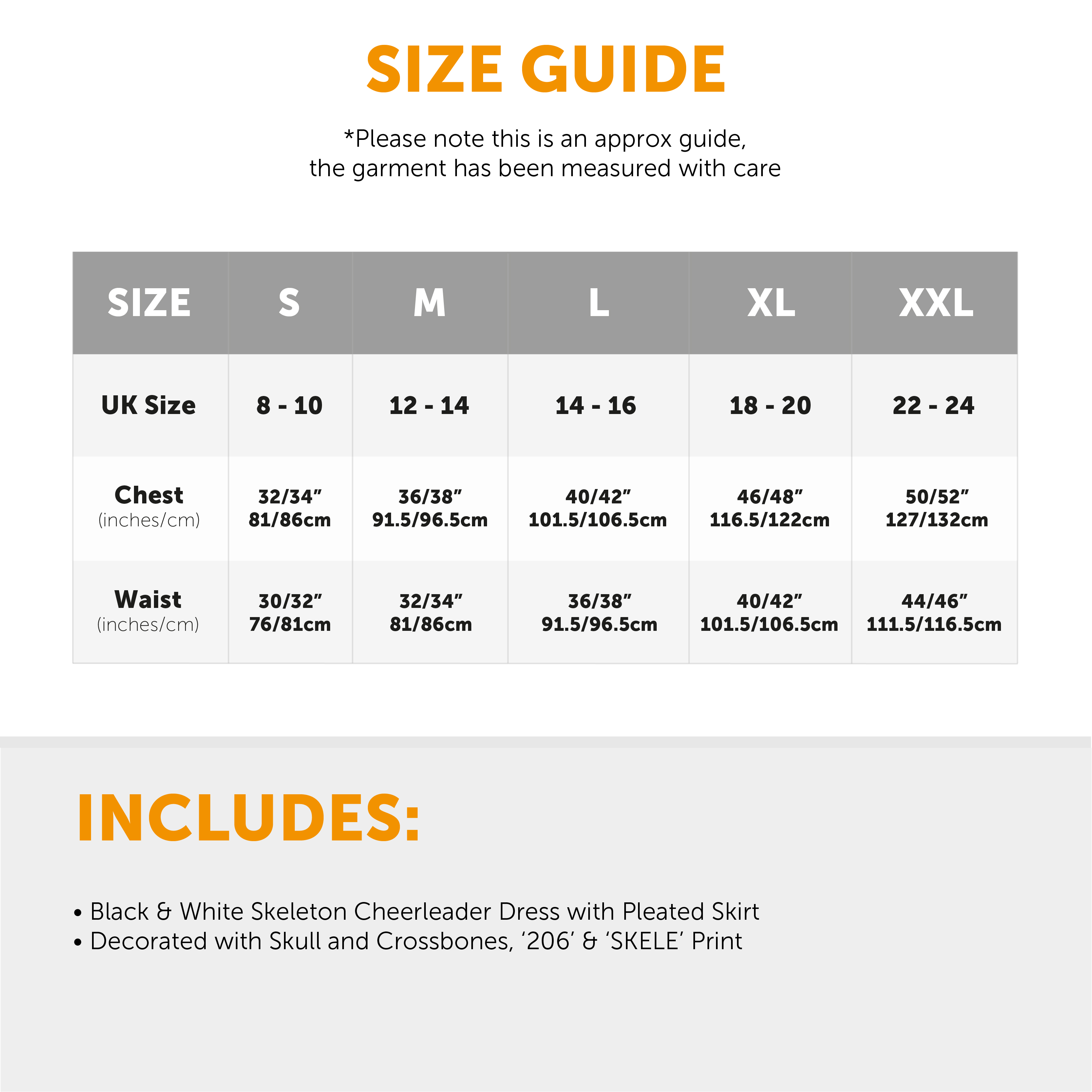 AVAILABLE IN MULTIPLE SIZES: Your Ladies Skeleton Cheerleader Costume is available in multiple sizes from Small to XX-Large: Small (UK 8-10), Chest: 32/34" (81/86cm), Waist: 30/32" (76/81cm) | Medium (UK 12-14), Chest: 36/38" (91.5/96.5cm), Waist: 32/34" (81/86cm) | Large (UK 14-16), Chest: 40/42" (101.5/106.5cm), Waist: 36/38" (91.5/96.5cm) | X-Large (UK 18-20), Chest: 46/48" (116.5/122cm), Waist: 40/42" (101.5/106.5cm) | XX-Large (UK 22-24), Chest: 50/52" (127/132cm), Waist: 44/46" (111.5/116.5cm)