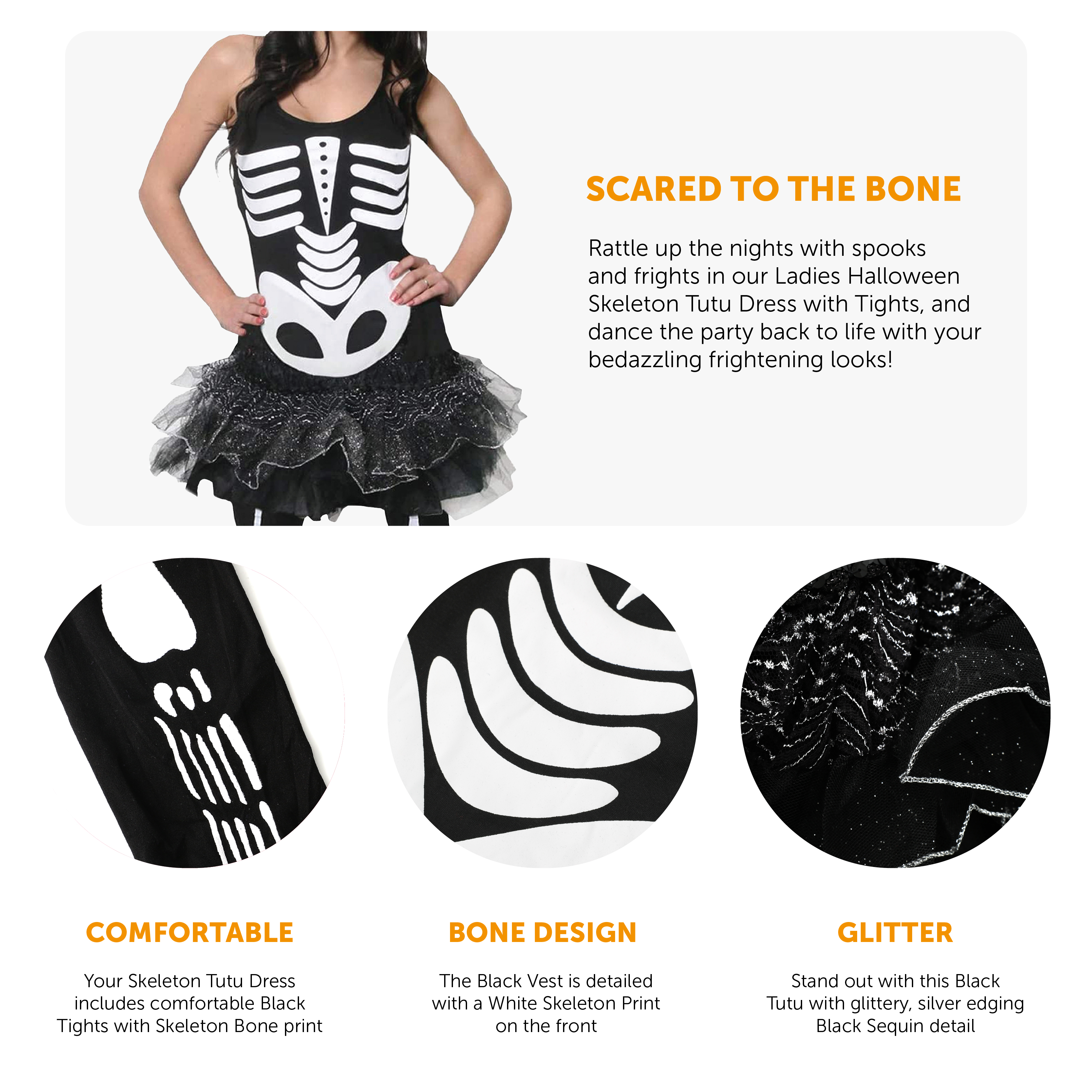 LADIES SKELETON TUTU DRESS WITH TIGHTS: Rattle up the nights with spooks and frights in our Ladies Halloween Skeleton Tutu Dress with Tights, and dance the party back to life with your bedazzling frightening looks!