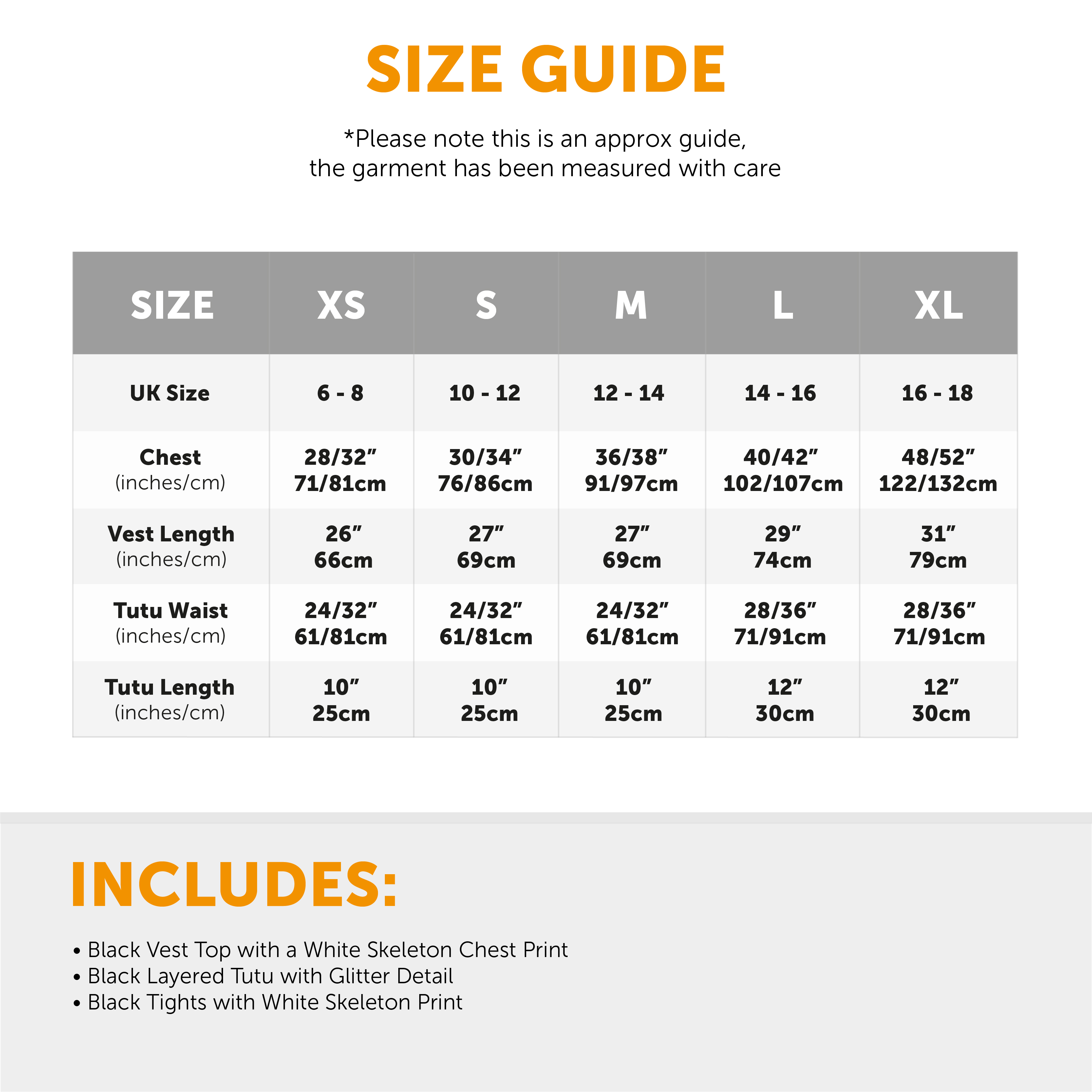 AVAILABLE IN MULTIPLE SIZES: The Ladies Skeleton Tutu Dress Costume is available in sizes ranging from X-Small to X-Large: X-Small - UK 6 - 8 - Chest 28/32" (71/81cm), Vest Length: 26" (66cm), Tutu Waist: 24/32" (61/81cm), Tutu Length: 10" (25cm) | Small - UK 10 - 12 - Chest: 30/34" (76/86cm), Vest Length: 27" (69cm), Tutu Waist: 24/32" (61/81cm), Tutu Length: 10" (25cm) | Medium - UK 12 - 14 - Chest: 36/38" (91/97cm), Vest Length: 27" (69cm), Tutu Waist: 24/32" (61/81cm), Tutu Length: 10" (25cm) | Large - UK 14 - 16 - Chest: 40/42" (102/107cm), Vest Length: 29" (74cm), Tutu Waist: 28/36" (71/91cm), Tutu Length: 12" (30cm) | X-Large - UK 16 - 18 - Chest: 48/52" (122/132cm), Vest Length: 31" (79cm), Tutu Waist: 28/36" (71/91cm), Tutu Length: 12" (30cm)