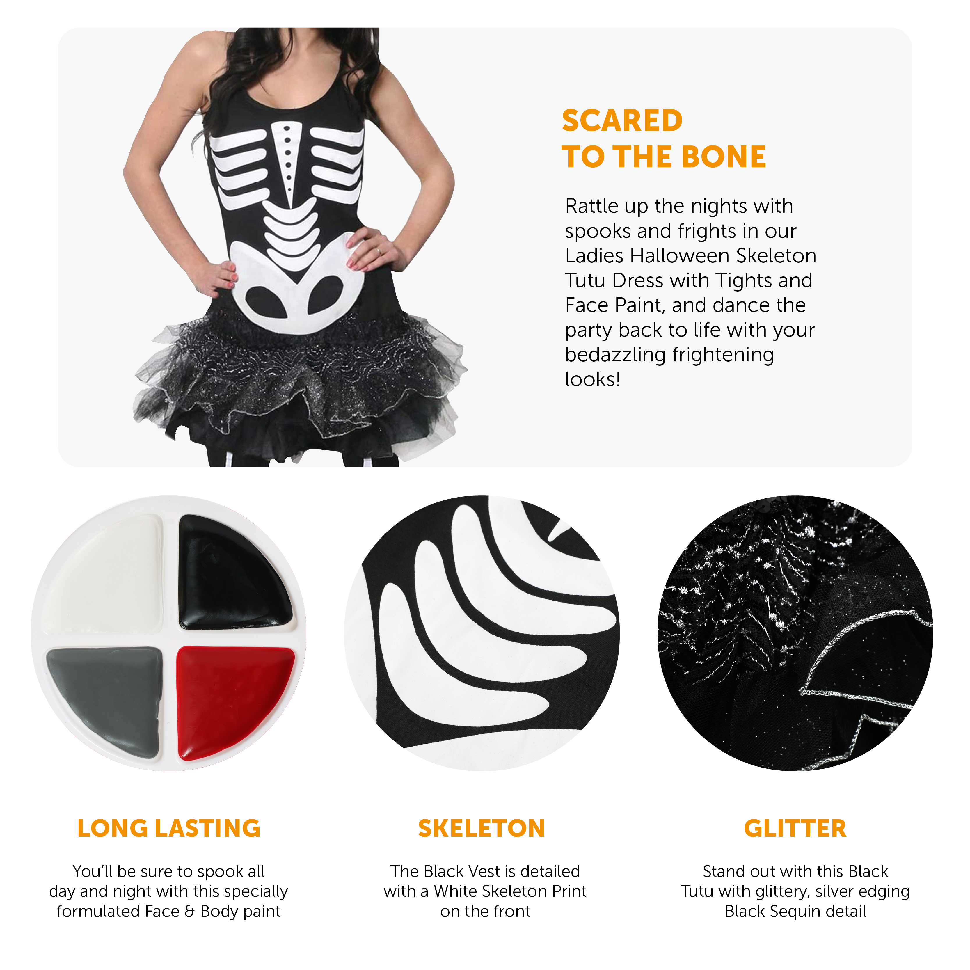 LADIES SKELETON TUTU DRESS WITH TIGHTS & FACE PAINT: Rattle up the nights with spooks and frights in our Ladies Halloween Skeleton Tutu Dress with Tights and Face Paint, and dance the party back to life with your bedazzling frightening looks!