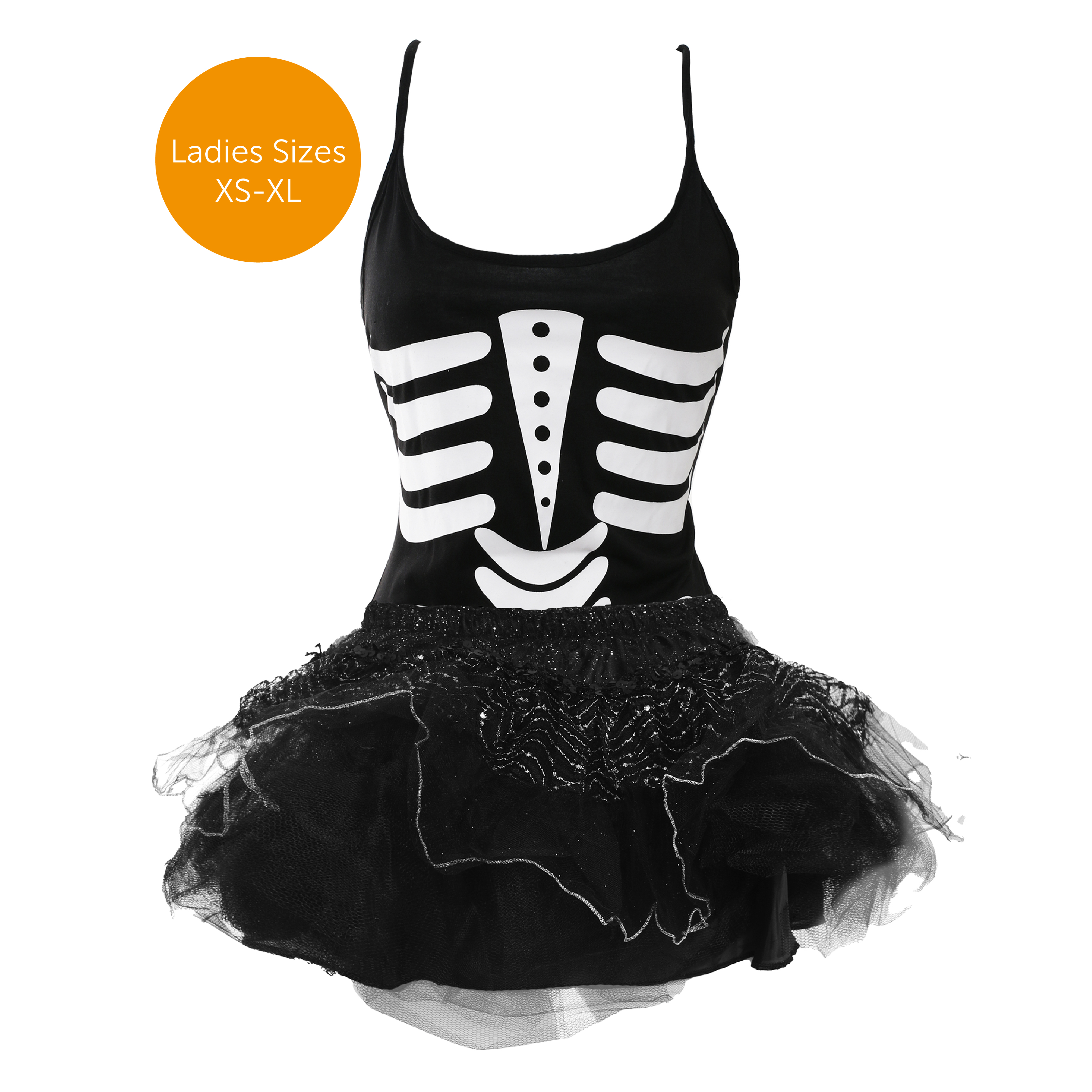 AVAILABLE IN MULTIPLE SIZES: The Ladies Skeleton Tutu Dress Costume is available in sizes ranging from X-Small to X-Large: X-Small - UK 6 - 8 - Chest 28/32" (71/81cm), Vest Length: 26" (66cm), Tutu Waist: 24/32" (61/81cm), Tutu Length: 10" (25cm) | Small - UK 10 - 12 - Chest: 30/34" (76/86cm), Vest Length: 27" (69cm), Tutu Waist: 24/32" (61/81cm), Tutu Length: 10" (25cm) | Medium - UK 12 - 14 - Chest: 36/38" (91/97cm), Vest Length: 27" (69cm), Tutu Waist: 24/32" (61/81cm), Tutu Length: 10" (25cm) | Large - UK 14 - 16 - Chest: 40/42" (102/107cm), Vest Length: 29" (74cm), Tutu Waist: 28/36" (71/91cm), Tutu Length: 12" (30cm) | X-Large - UK 16 - 18 - Chest: 48/52" (122/132cm), Vest Length: 31" (79cm), Tutu Waist: 28/36" (71/91cm), Tutu Length: 12" (30cm)