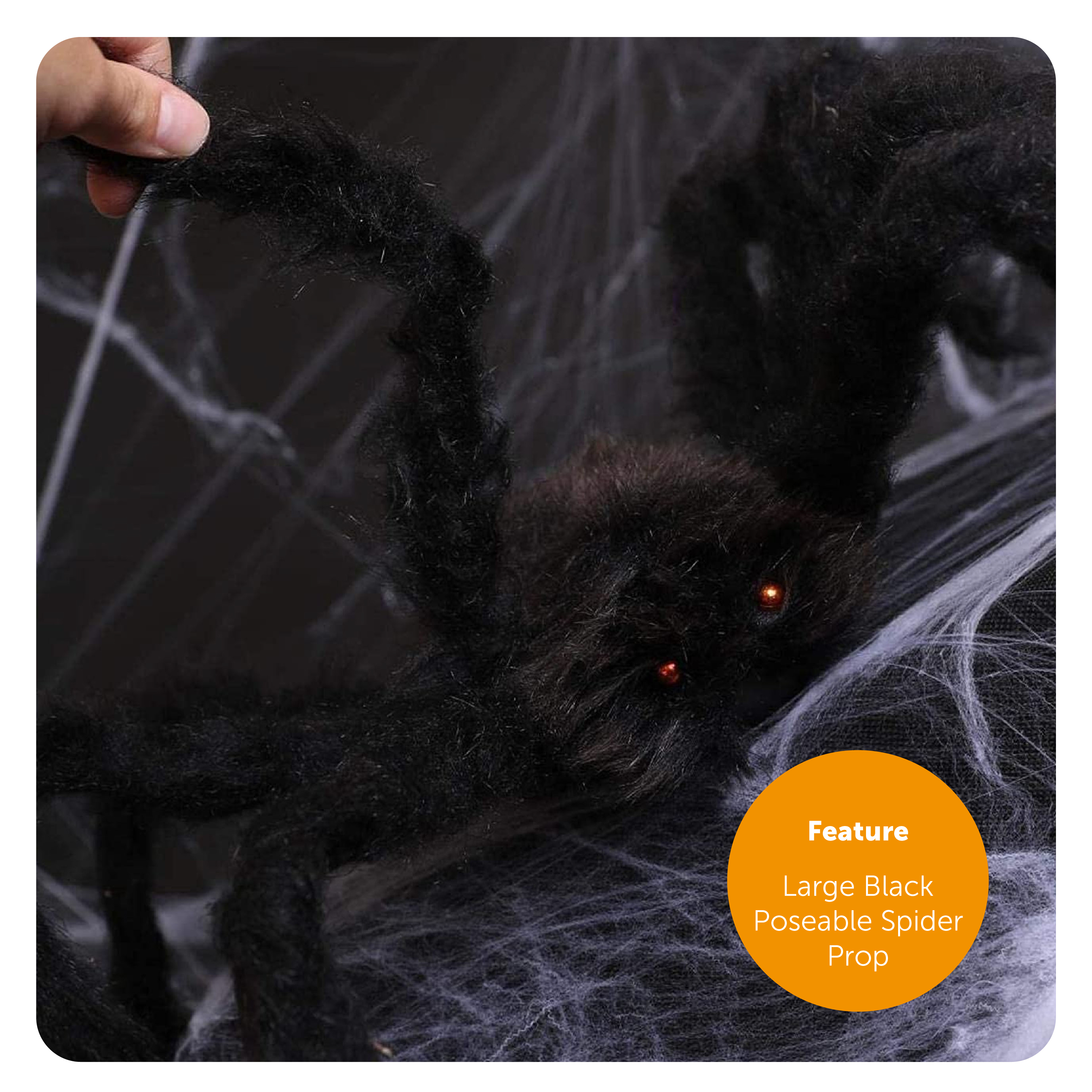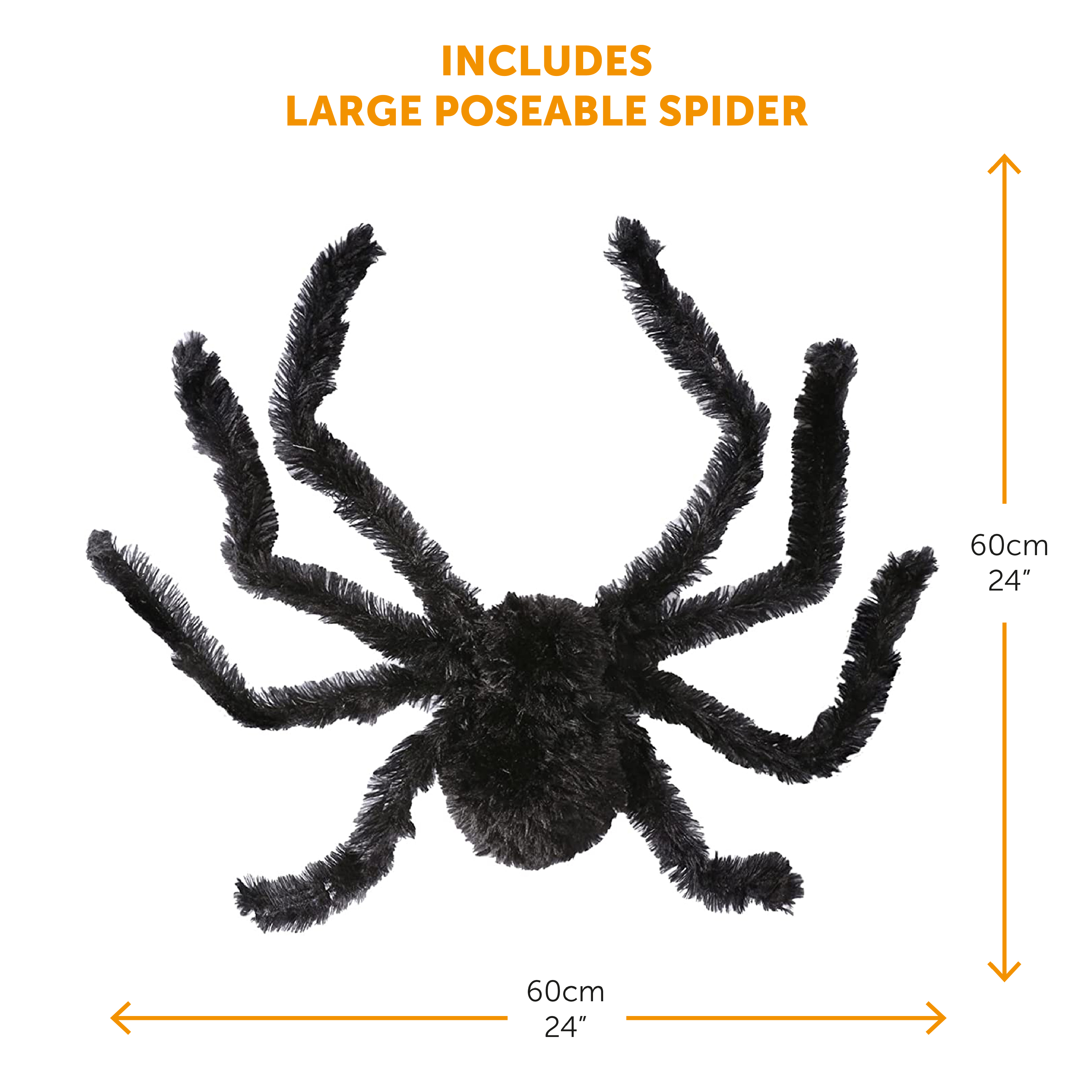 SPIDER DIMENSIONS: Your Large Poseable Spider measures 60cm (24”) X 60cm (24”), a large, terrifying creature that your guests and friends will find hard to miss with its massive body and legs!