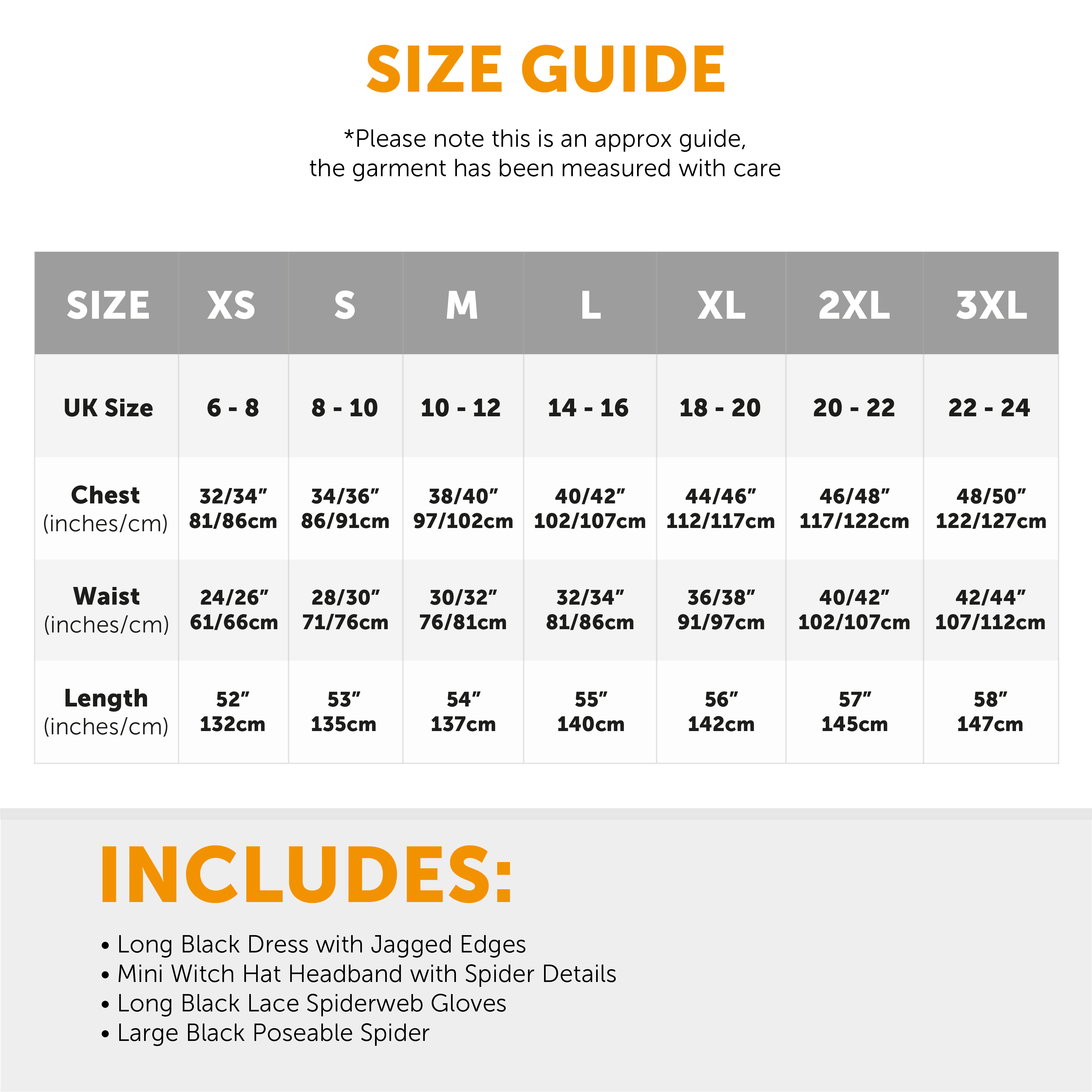 AVAILABLE IN MULTIPLE SIZES: This Ladies Spider Witch Dress is available in multiple sizes from X-Small to XXX-Large: X-Small (UK 6-8) - Chest: 32/34" (81/86cm), Waist: 24/26" (61/66cm), Length: 52" (132cm) | Small (UK 8-10) - Chest: 34/36" (86/91cm), Waist: 28/30" (71/76cm), Length: 53" (135cm) | Medium (UK 10-12) - Chest: 38/40" (97/102cm), Waist: 30/32" (76/81cm), Length: 54" (137cm) | Large (UK 14-16) - Chest: 40/42" (102/107cm), Waist: 32/34" (81/86cm), Length: 55" (140cm) | X-Large (UK 18-20) - Chest: 44/46" (112/117cm), Waist: 36/38" (91/97cm), Length: 56" (142cm) | XX-Large (UK 20-22) - Chest: 46/48" (117/122cm), Waist: 40/42" (102/107cm), Length: 57" (145cm) | XXX-Large (UK 22-24) - Chest: 48/50" (122/127cm), Waist: 42/44" (107/112cm), Length: 58" (147cm)