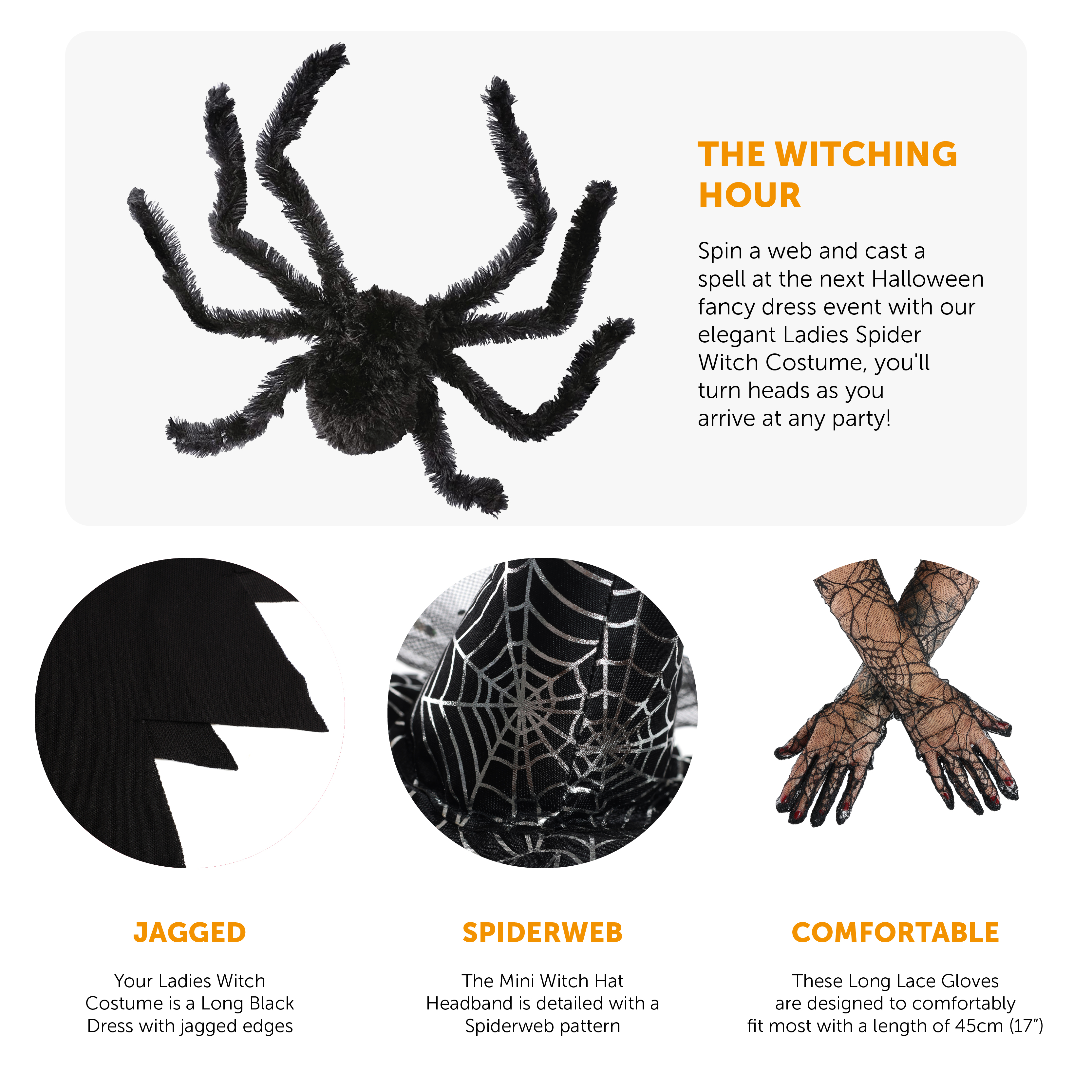 COSTUME INCLUDES: Your Ladies Spider Witch Costume includes a Long Black Dress with tattered edges, a pair of elegant Long Black Gloves with a lace design, styled with a Spiderweb pattern all over, a Mini Witch Hat Headband, and a poseable Black Spider Prop, the perfect look for Halloween events!