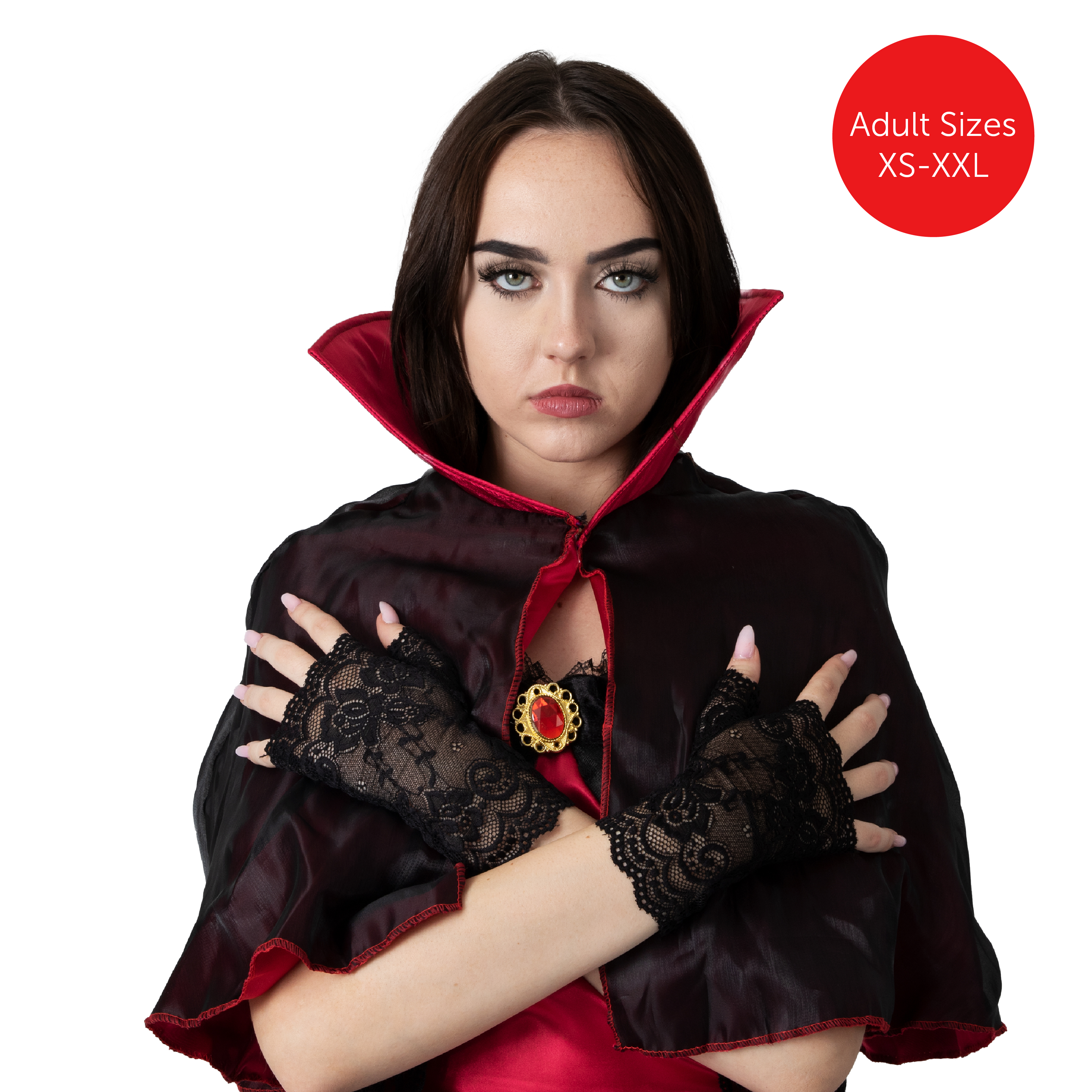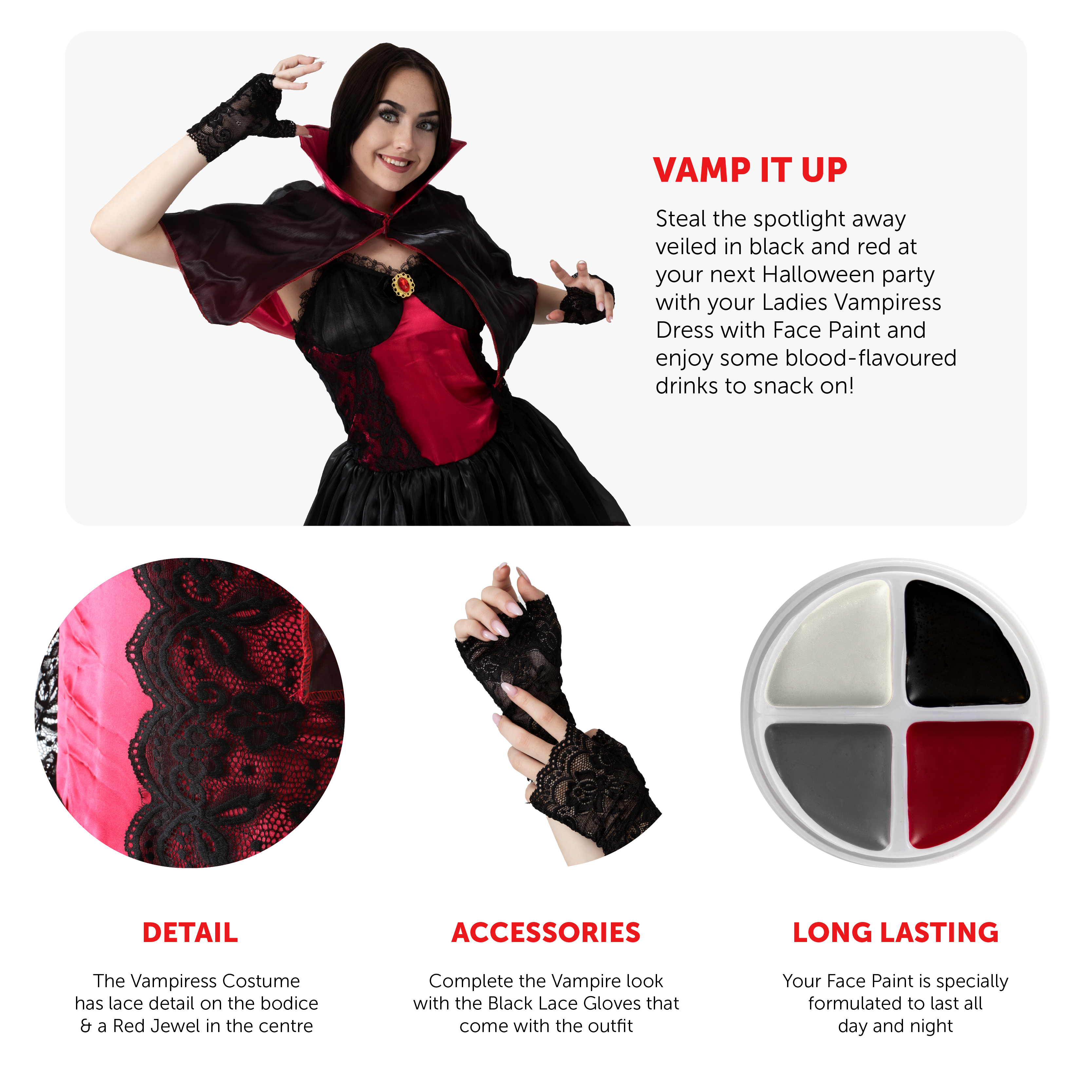 COSTUME INCLUDES: Your Ladies Vampiress Dress includes a Black & Red Bodice with Lace Detail, a Black Netted Skirt, a detachable Black and Red Cape with a High Stand Collar, a pair of Black Lace Gloves, and a palette of Face and Body Paint!