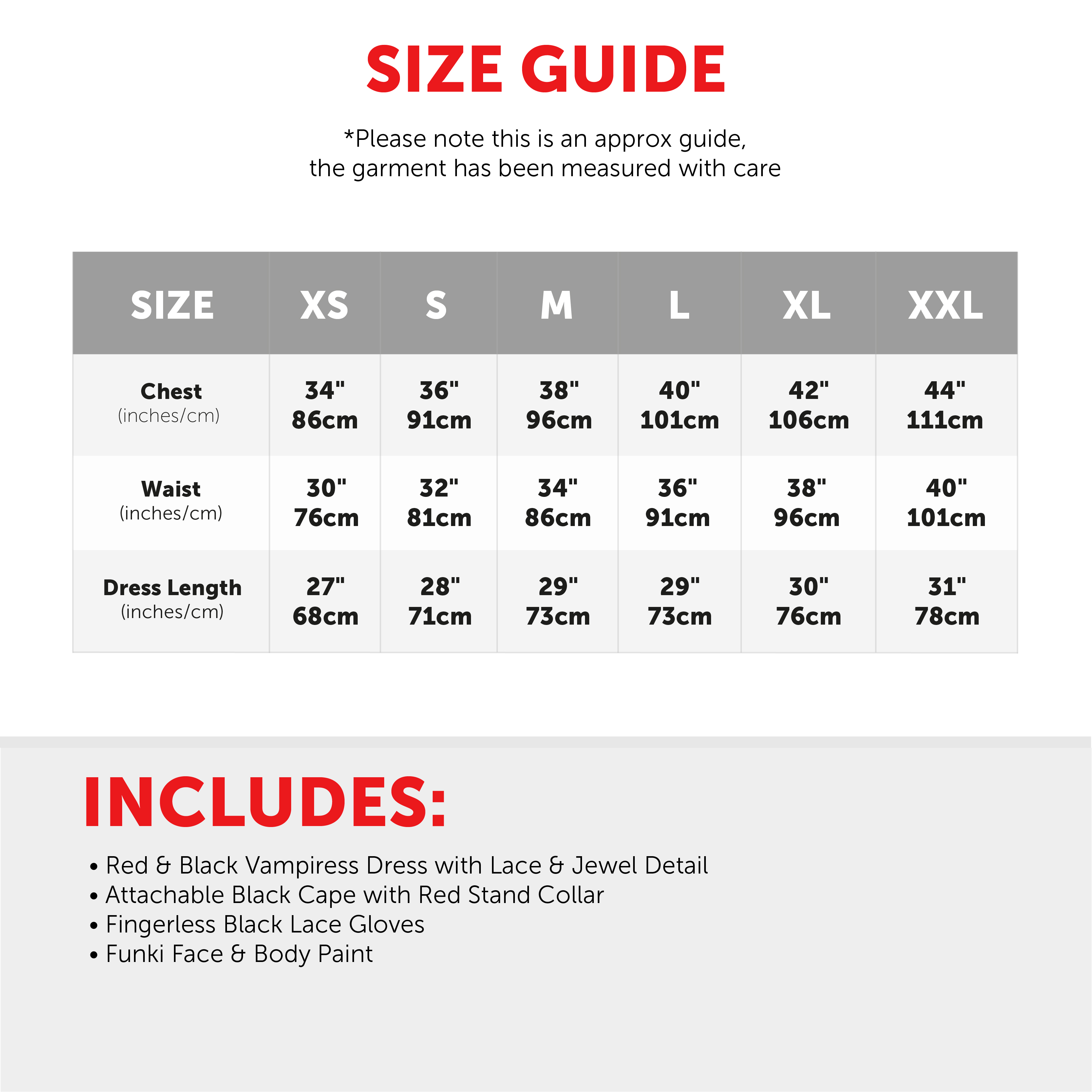 AVAILABLE IN MULTIPLE SIZES: Your Ladies Vampiress Dress is available in multiple sizes from X-Small to XX-Large: X-Small - Chest 34" (86cm), Waist 30" (76cm), Dress Length 27" (68cm)| Small - Chest 36" (91cm), Waist 32" (81cm), Dress Length 28" (71cm) | Medium - Chest 38" (96cm), Waist 34" (86cm), Dress Length 29" (73cm) | Large - Chest 40" (101cm), Waist 36" (91cm), Dress Length 29" (73cm) | X-Large - Chest 42" (106cm), Waist 38" (96cm), Dress Length 30" (76cm) | XX-Large - Chest 44" (111cm), Waist 40" (101cm), Dress Length 31" (78cm)