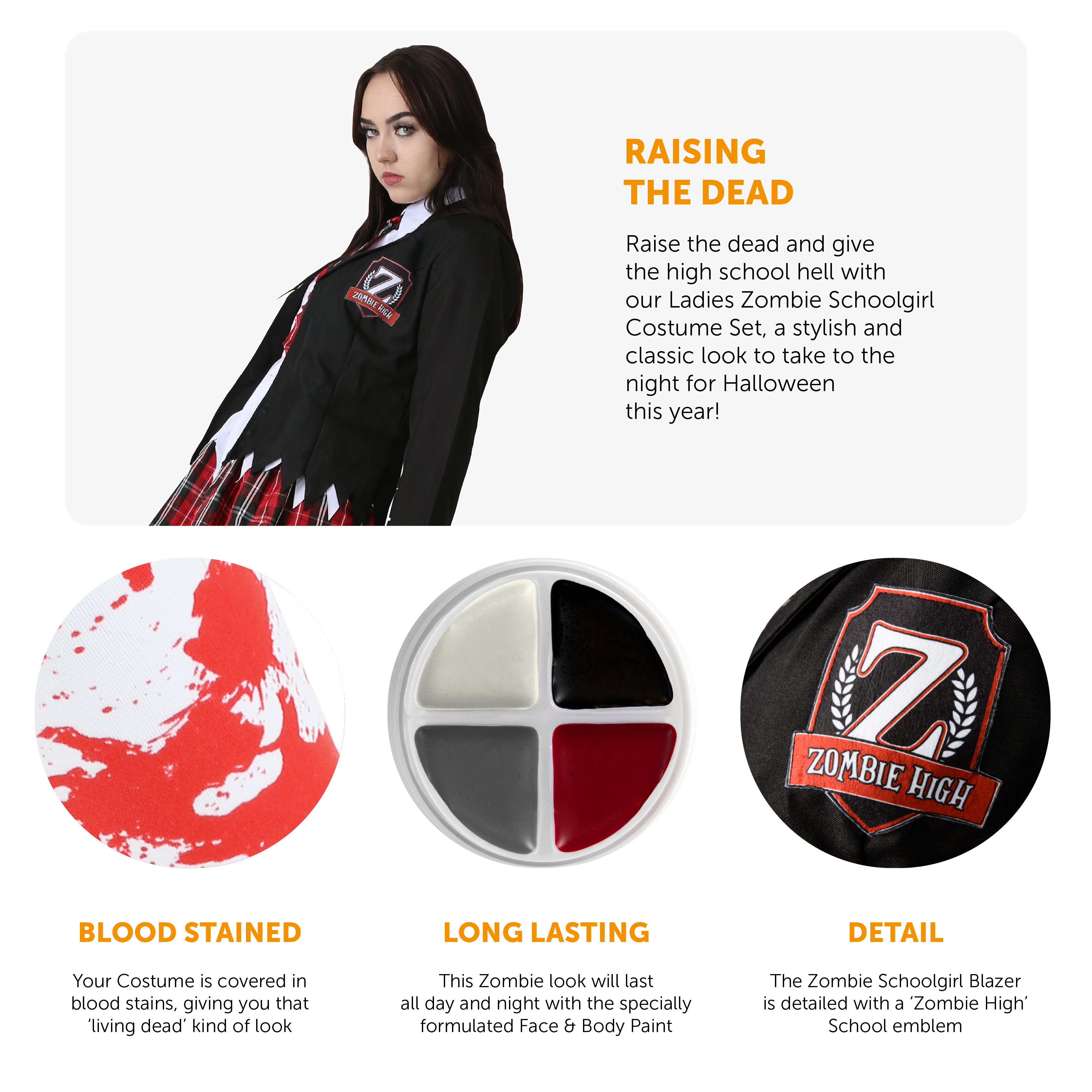 COSTUME INCLUDES: Your Ladies Zombie Schoolgirl outfit includes a jagged and clawed Black Blazer with a 'Zombie High' badge, a White Shirt with jagged edges and blood stains, a Tartan Tie, a Tartan Schoolgirl Skirt, a pair of White Blood Stained Stockings, and a palette of Face and Body Paint!