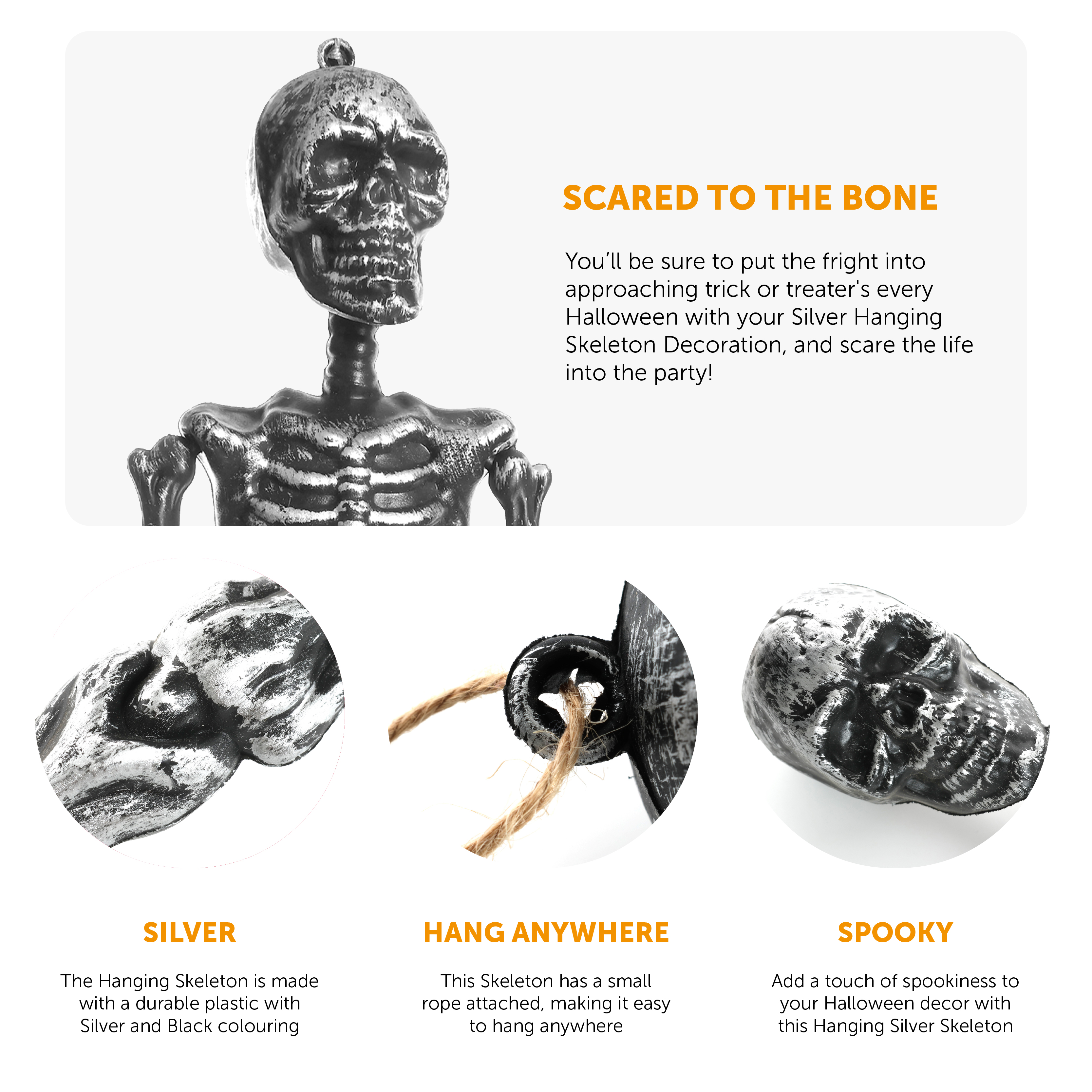 SKELETON DETAILS: Your Hanging Skeleton Decoration is a Silver Skeleton with an easy hanging design, the Skeleton's arms and legs have flexible joints allowing it to wriggle around as the decoration hangs to create a spooky Halloween display for your celebrations!