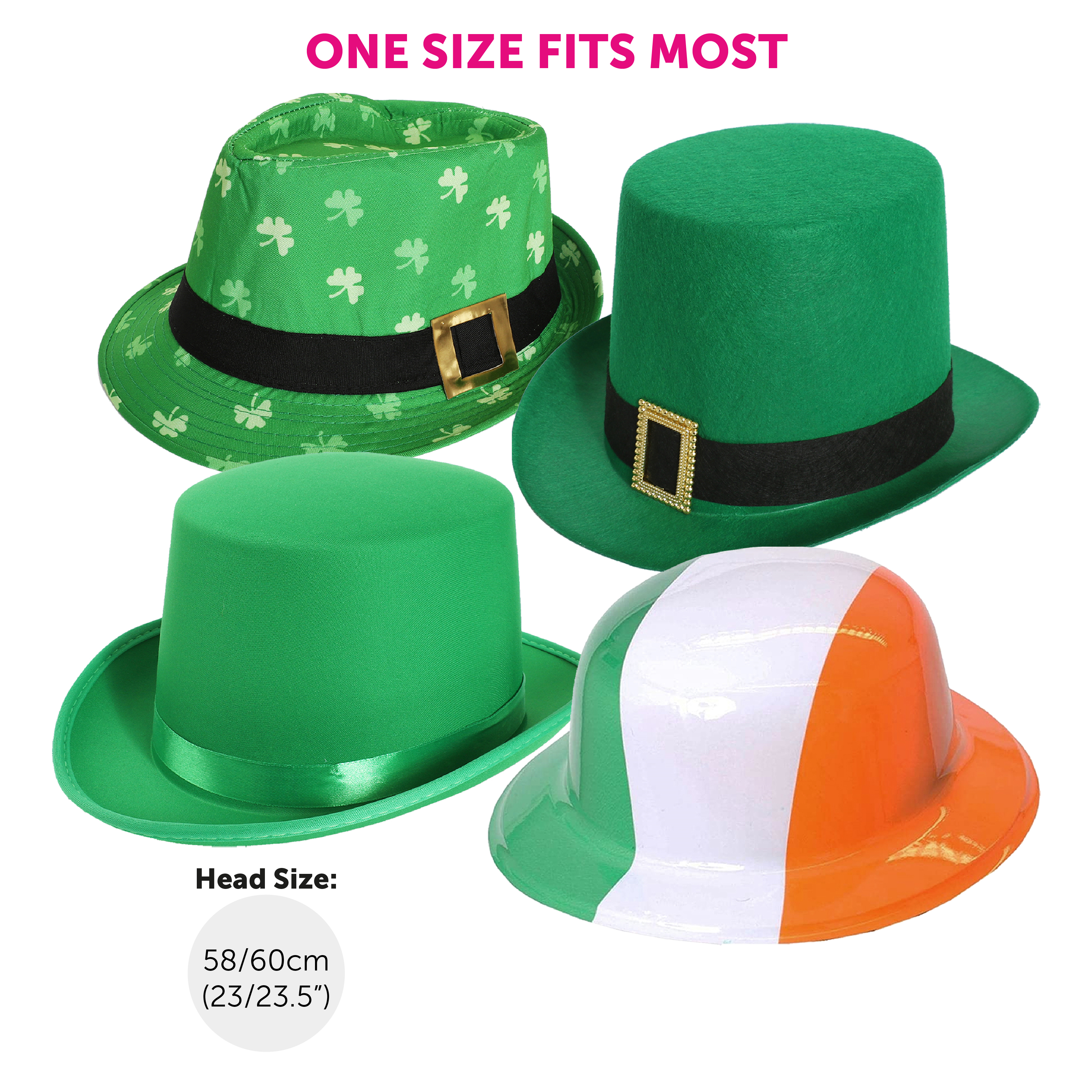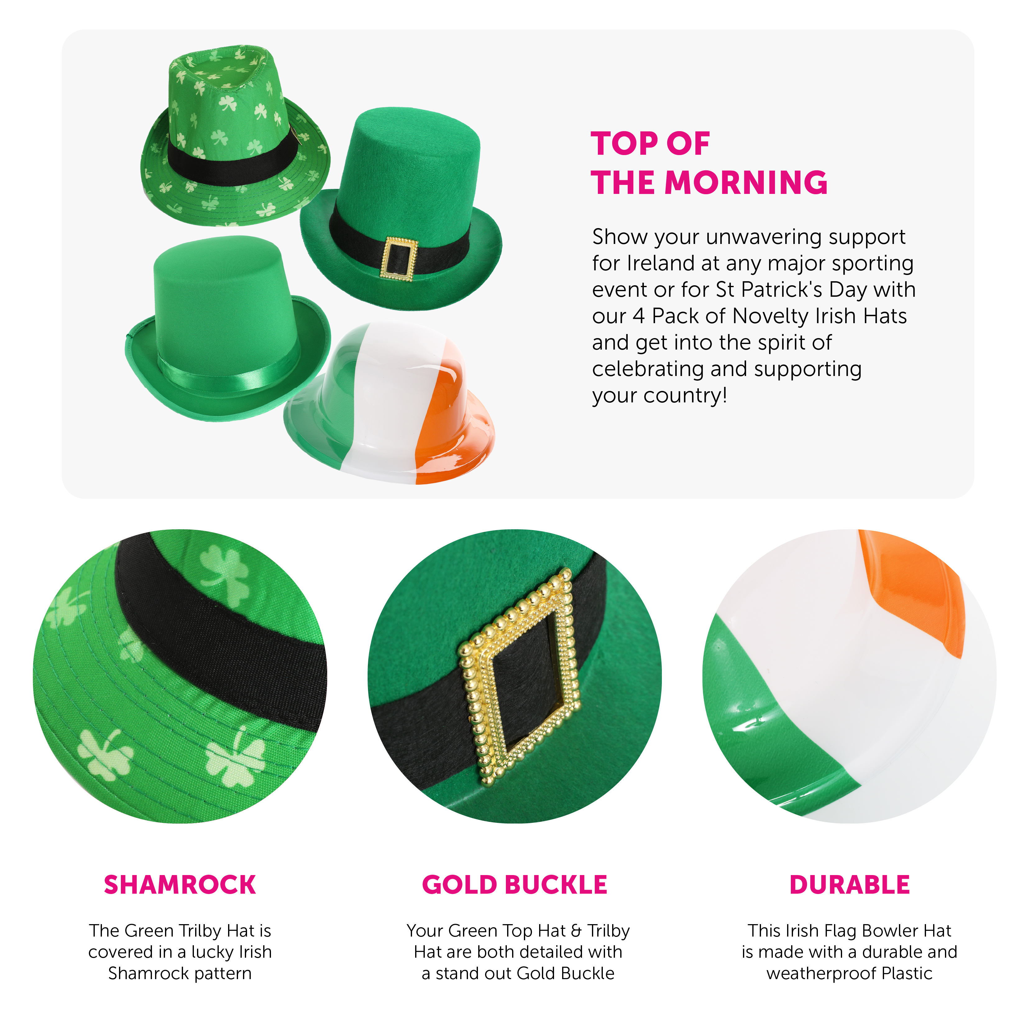 HAT SET INCLUDES: Your Irish Hat Set includes 4x different Novelty Hats including, 1x Dark Green Top Hat with a Gold Buckle, 1x Plastic Bowler Hat with the tri coloured Irish Flag printed all over the top, 1x Green Trilby Hat covered in a Shamrock pattern with a Gold Buckle, and 1x Satin Green Top Hat, the perfect set to celebrate all things Irish!