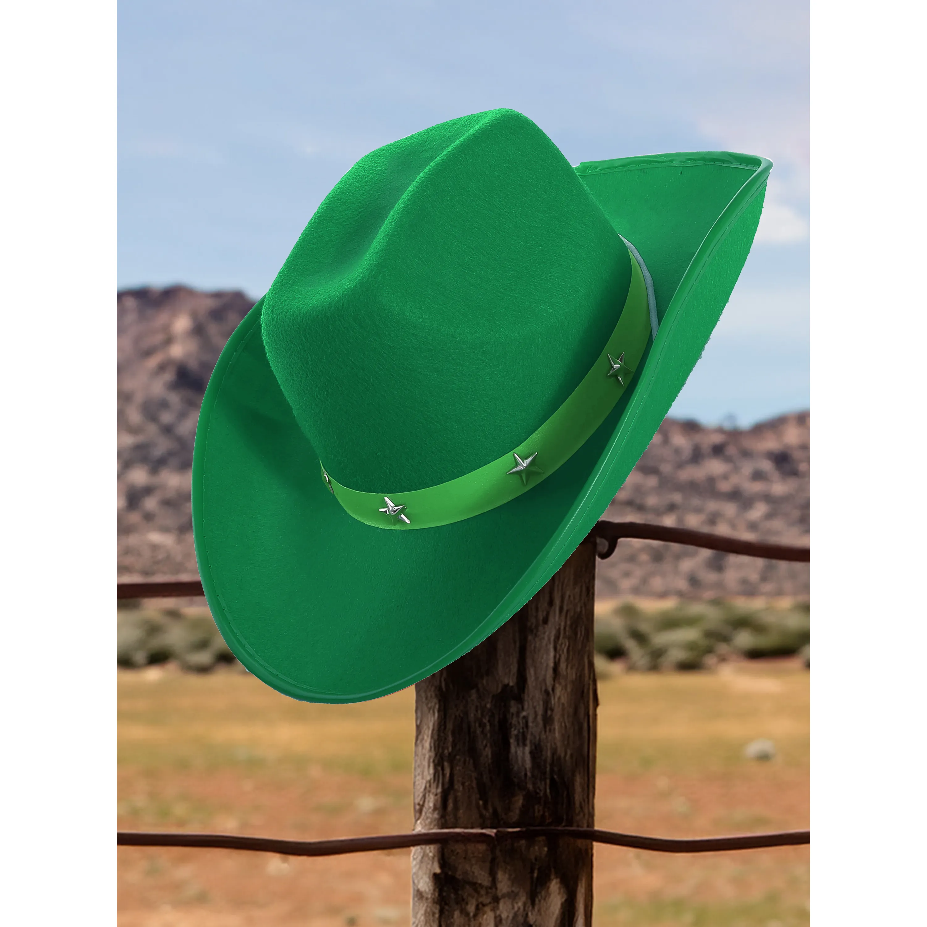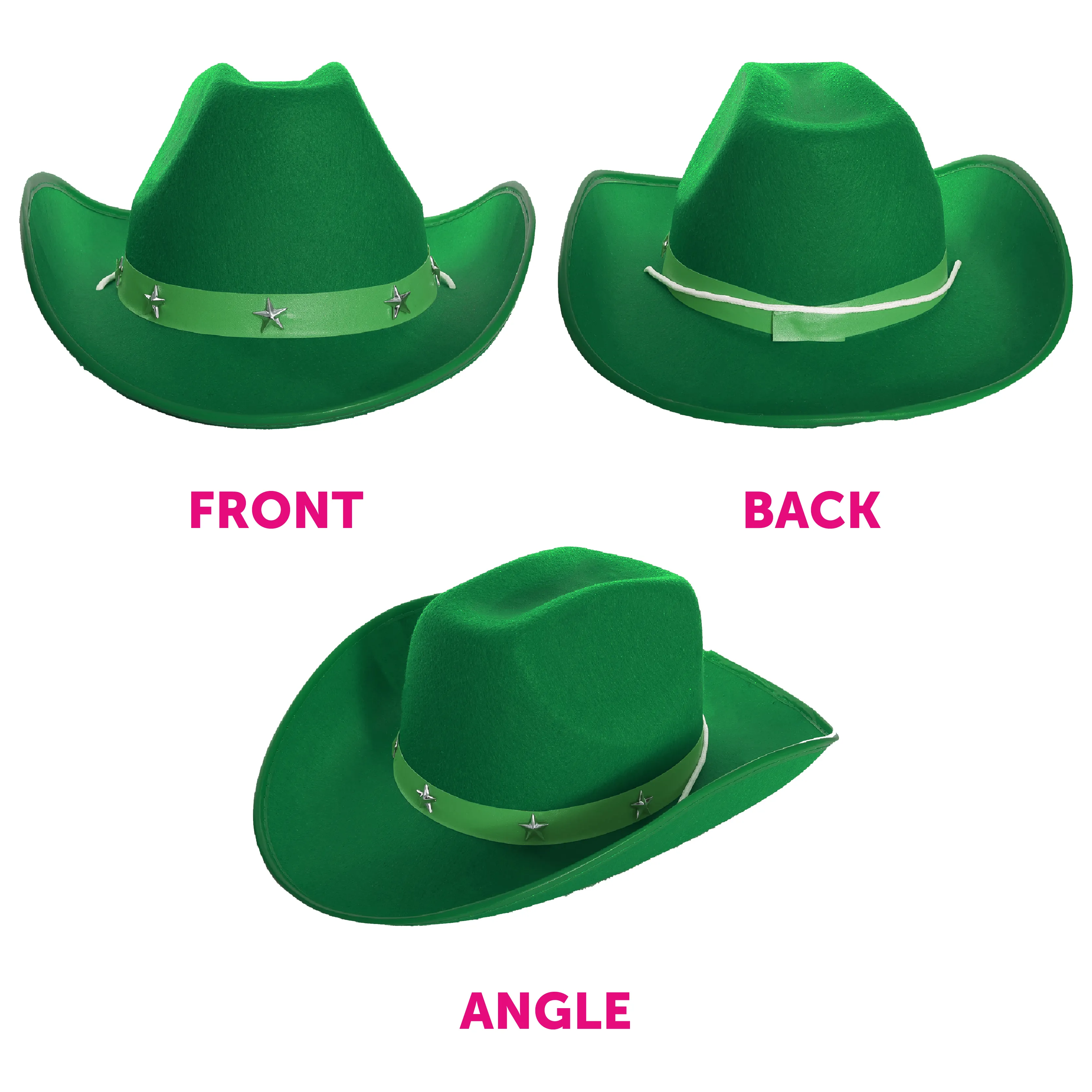 HAT DETAILS: Made from bold green felt with silver star studs decorating the band, and an adjustable white chin strap for comfort and secure wear. Ideal for completing your cowboy, cowgirl, or rodeo outfit.