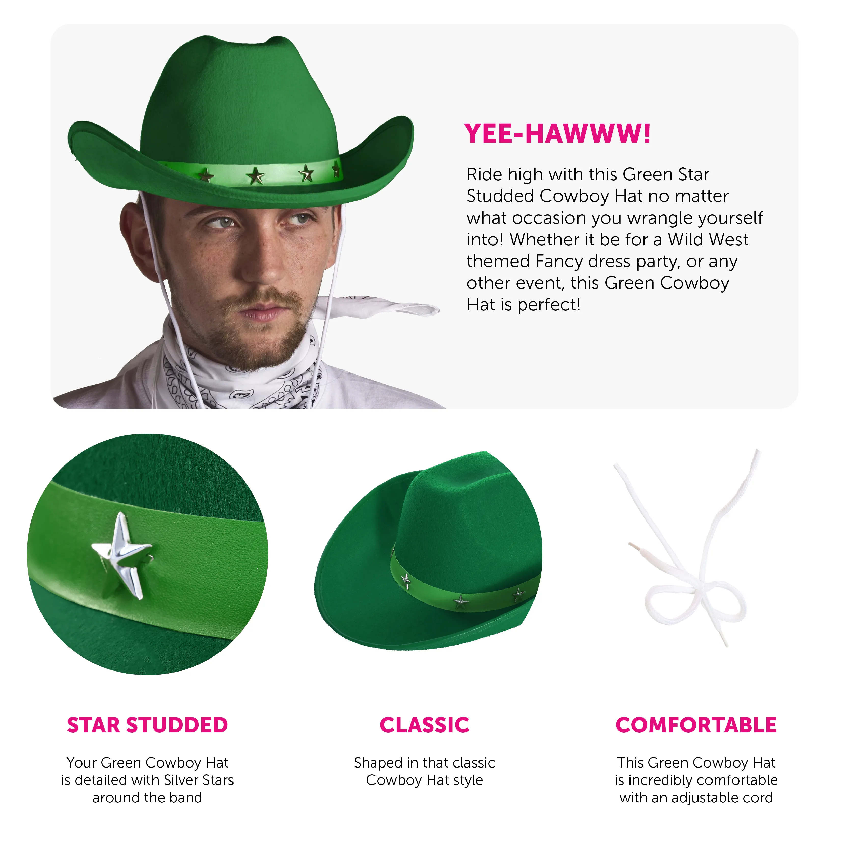 GREEN STUDDED COWBOY HAT: Ride high with this Green Star Studded Cowboy Hat, perfect for Wild West themed fancy dress parties, festivals, nights out, or any event where you want to make a bold statement. This vibrant green hat is guaranteed to stand out.