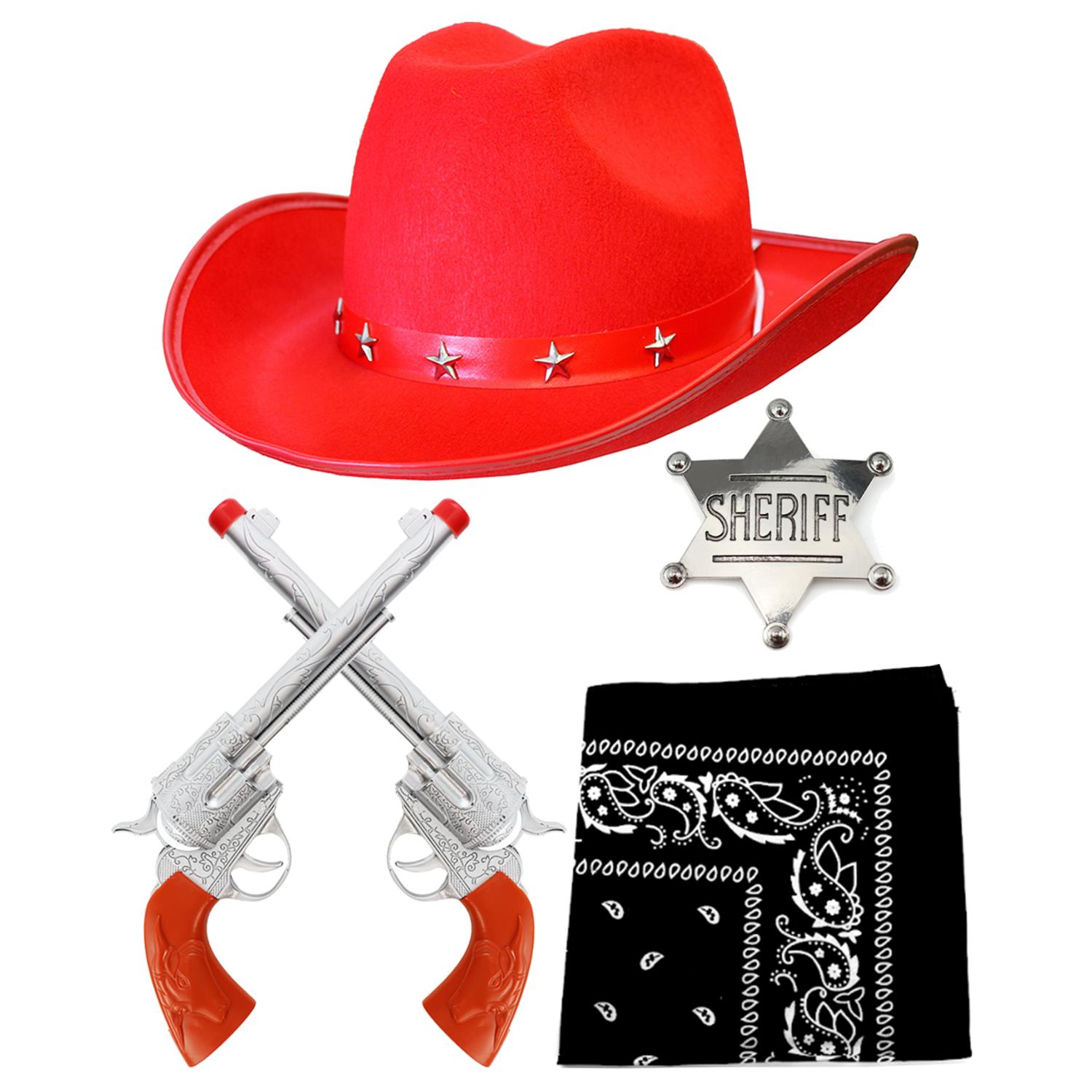 Adults Cowboy Accessory Set | 4 Pcs | Red Studded Hat, Plastic Pistols, Black Bandana & Silver Sheriff Badge