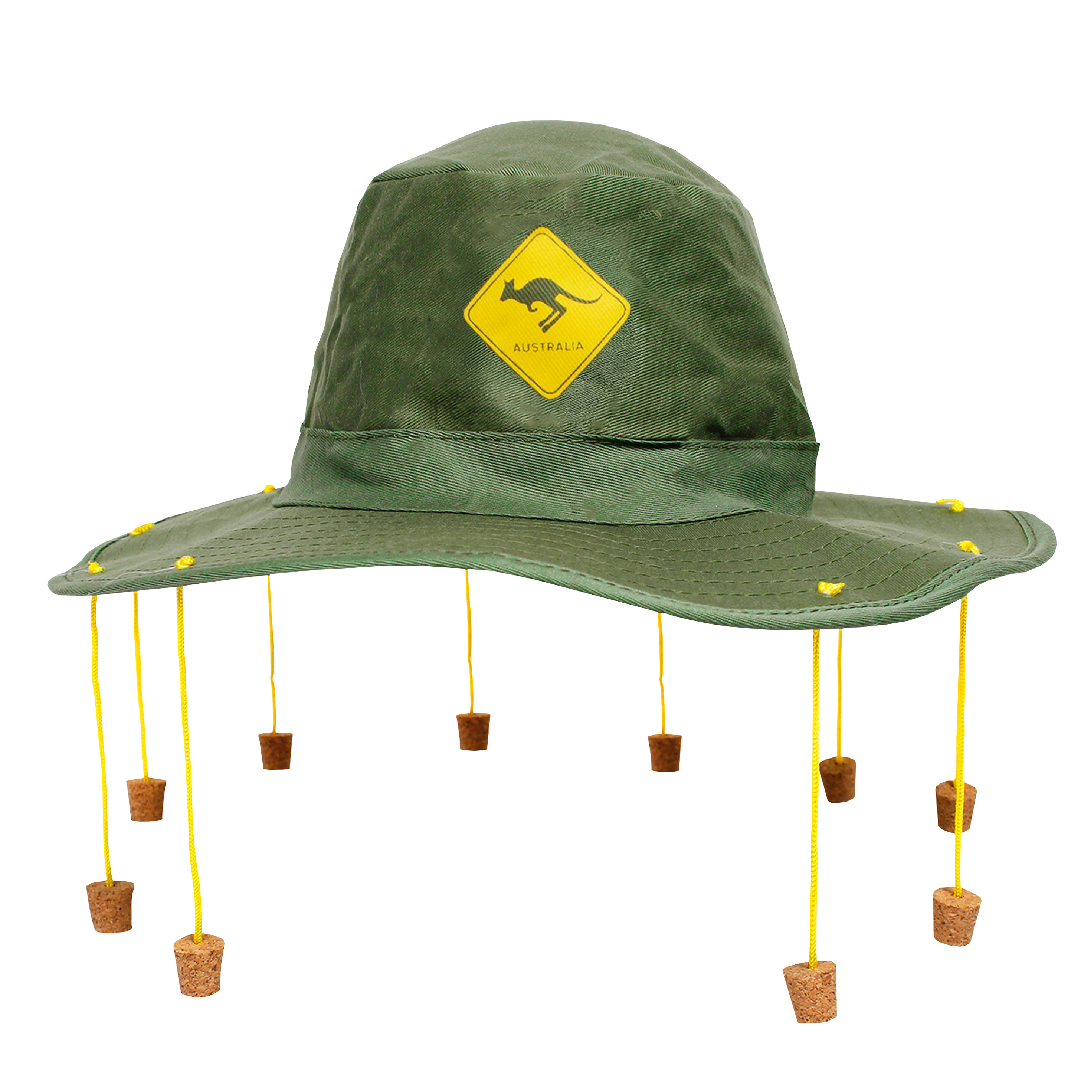 HAT DETAILS: This Cork Hat is a quality Green Hat with a Yellow Kangaroo Print on the front reading 'AUSTRALIA', Corks hanging by string attached all around the brim and a comfortable, adjustable drawstring design!AVAILABLE IN MULTIPLE PACKS: Your Australian Cork Hat is available in multiple pack sizes for you to share at any fancy dress event! The pack sizes range from Packs of 1 to Packs of 2, Packs of 3, Packs of 6, Packs of 12, Packs of 24, and Packs of 48!