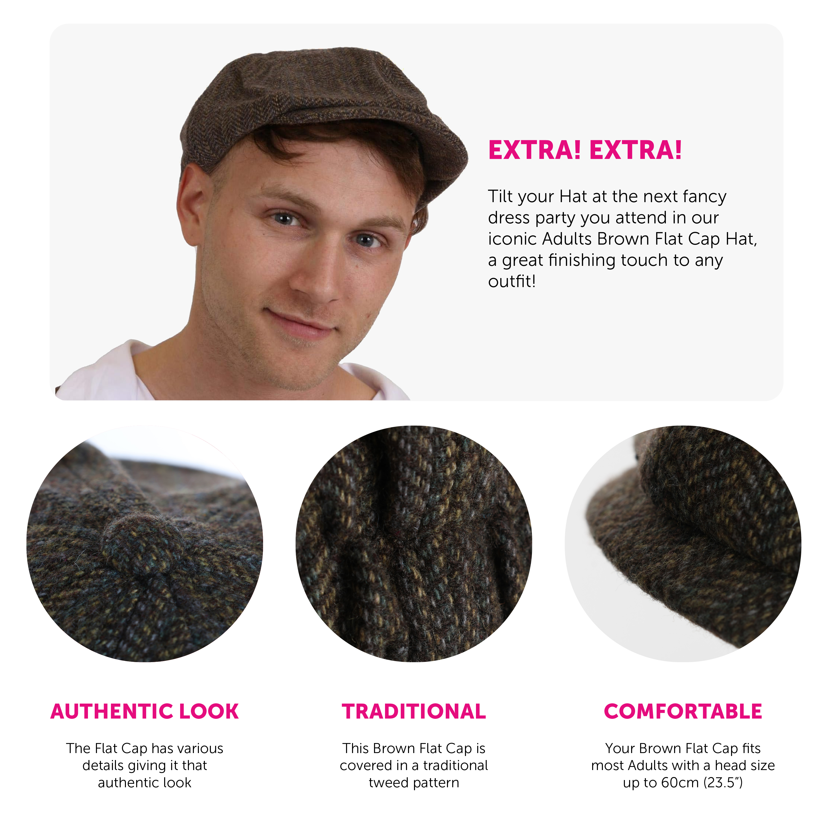 HAT DETAILS: This Flat Cap is a soft-feel Brown Hat designed in that classic Flat Cap style, covered in a tweed pattern, the perfect way to finish off your fancy dress outfit!