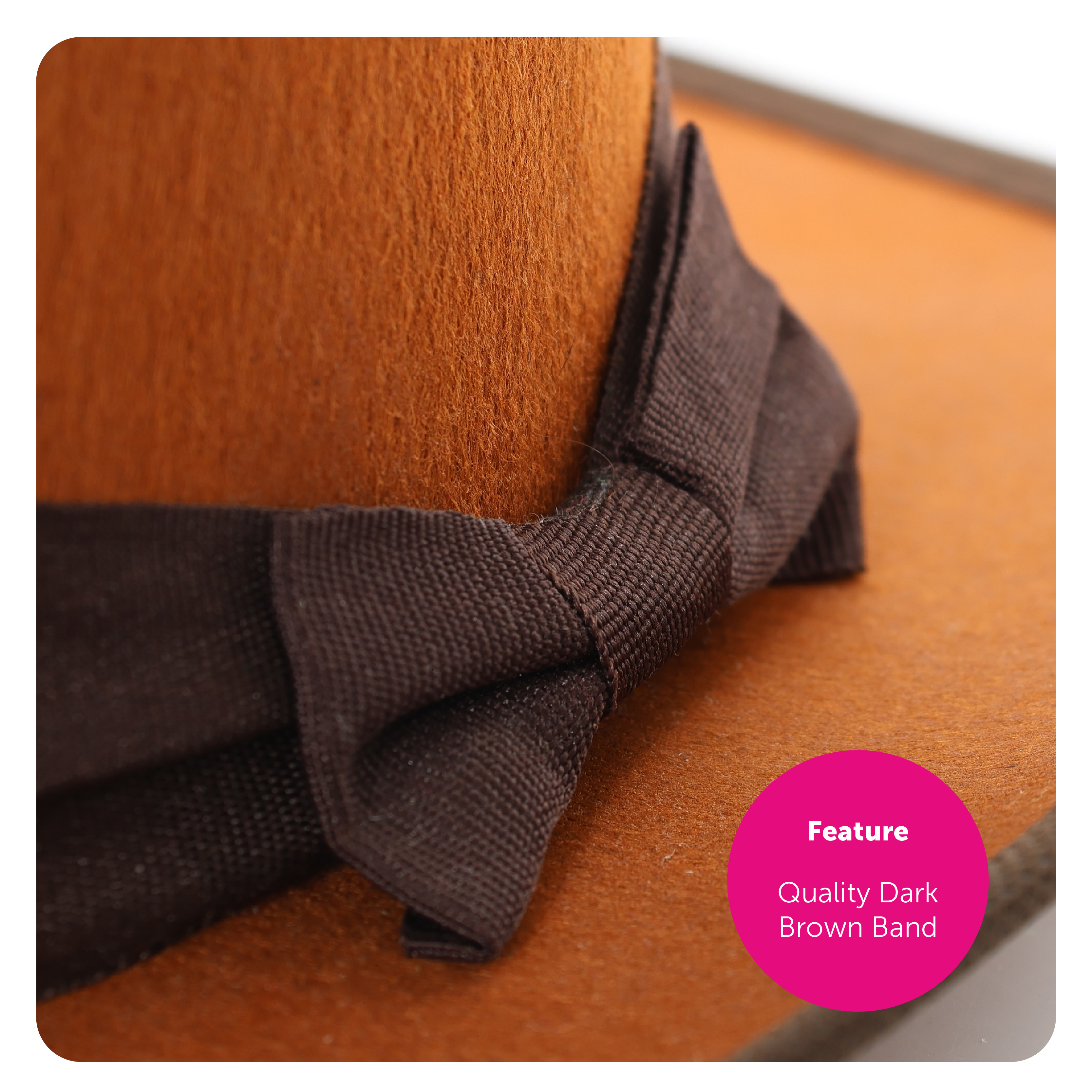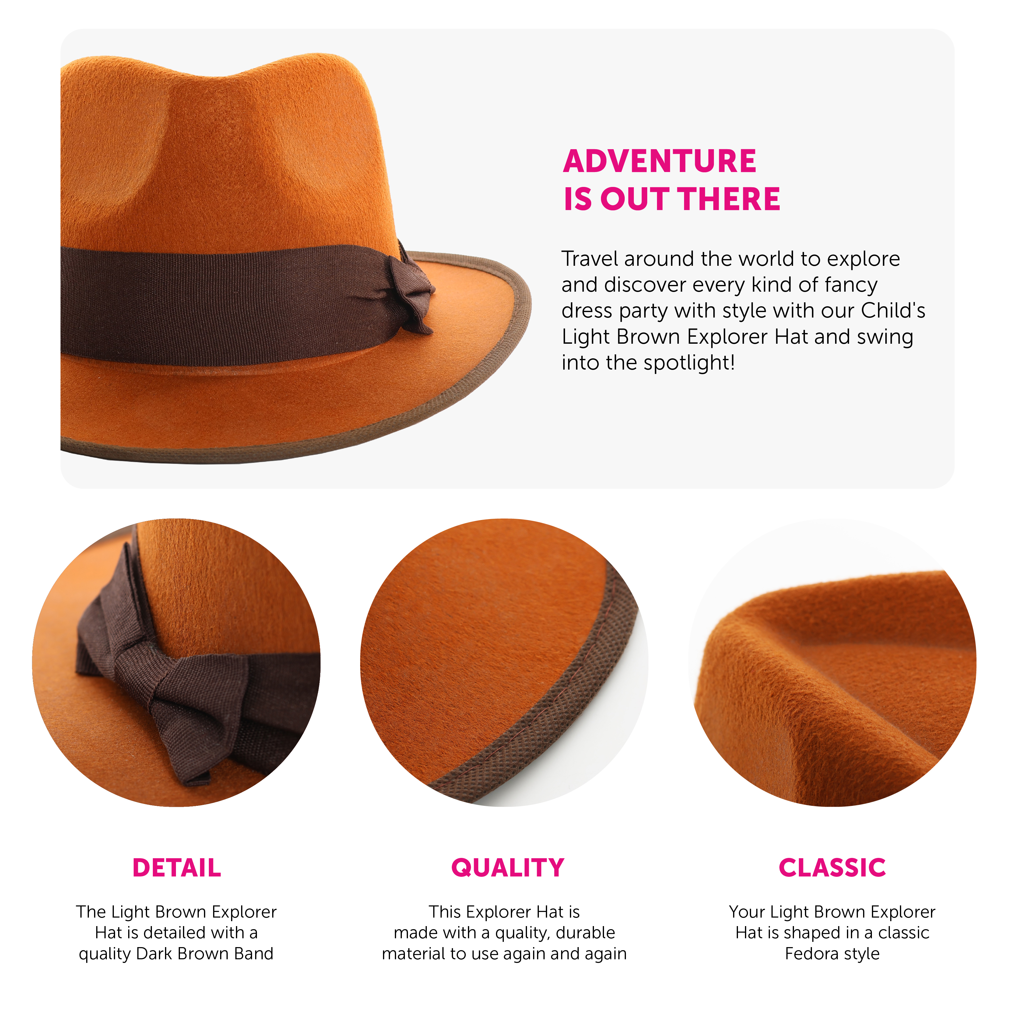 EXPLORER HAT DETAILS: Your Light Brown Explorer Hat has an attached decorative Dark Brown band around the crown of the hat, a classic Fedora style made from a firm and quality material with a finish that is comfortable and durable to wear consistently!